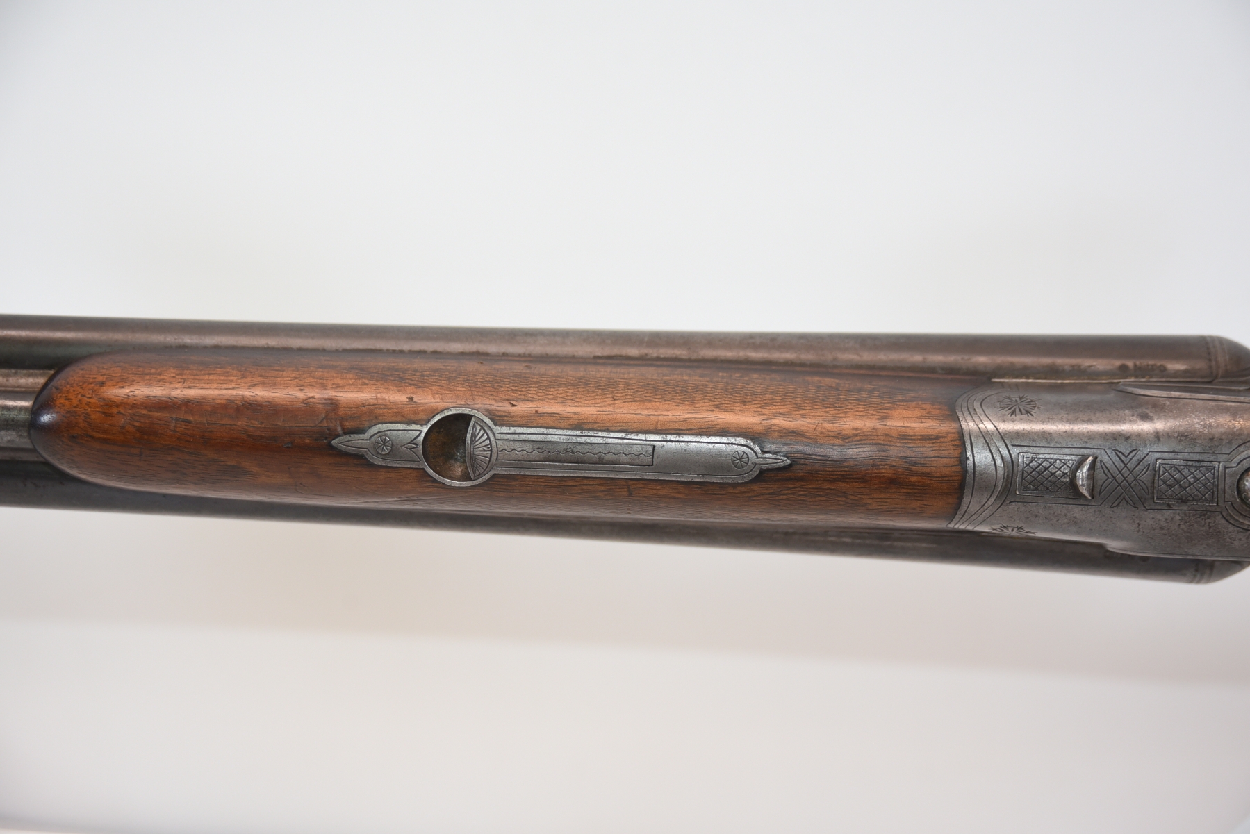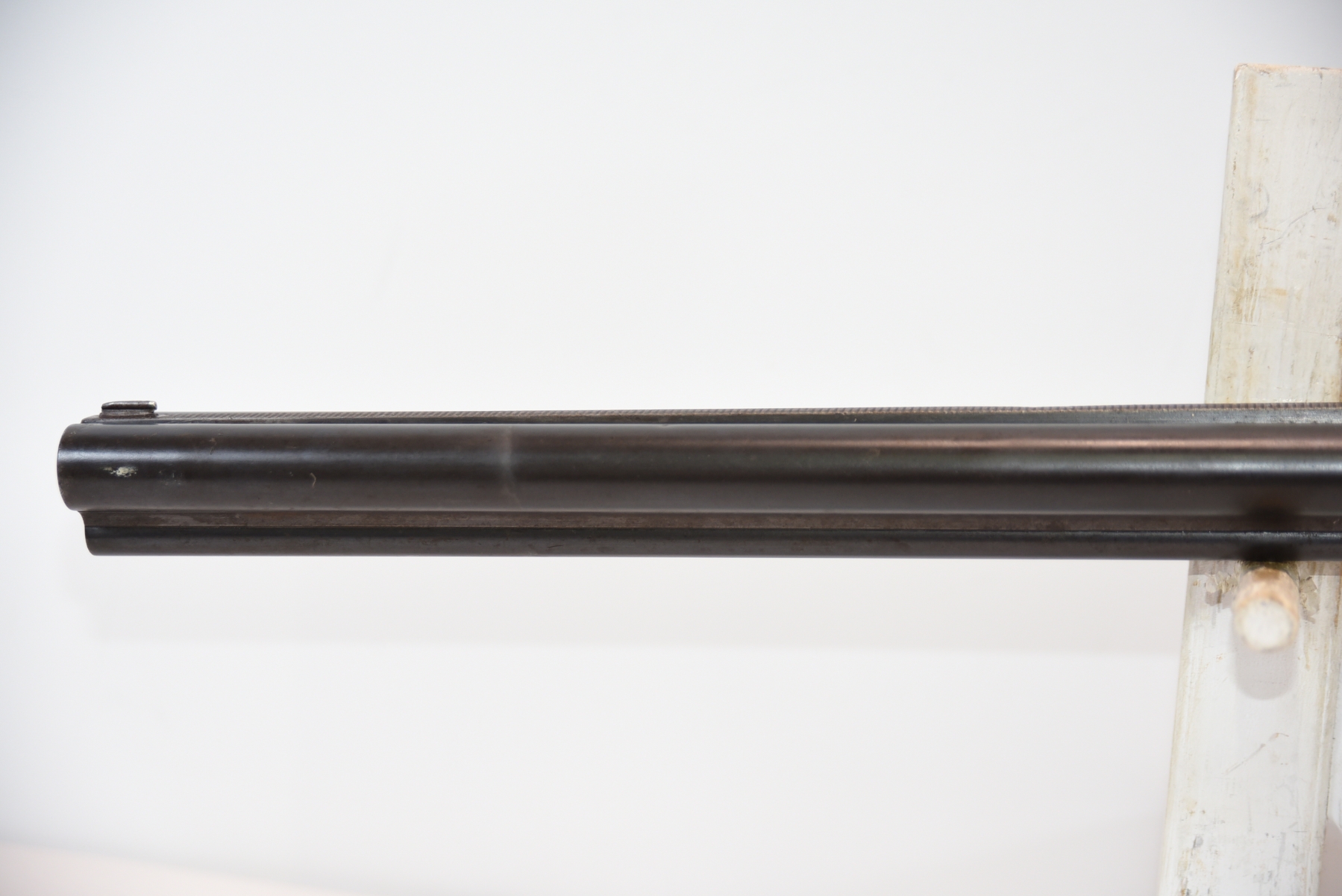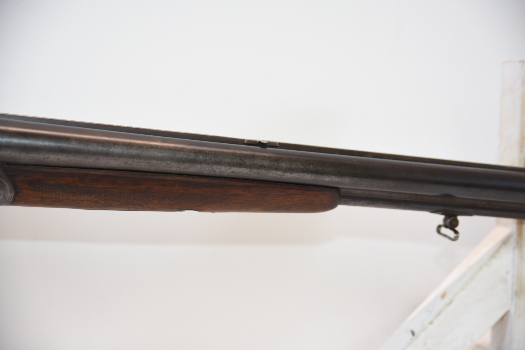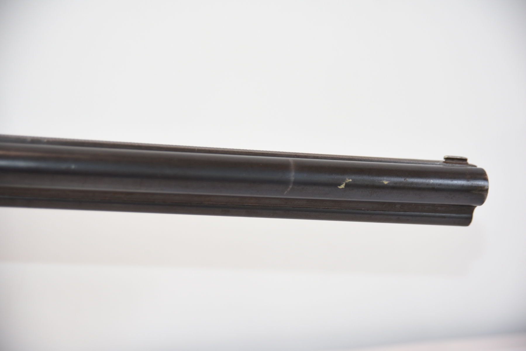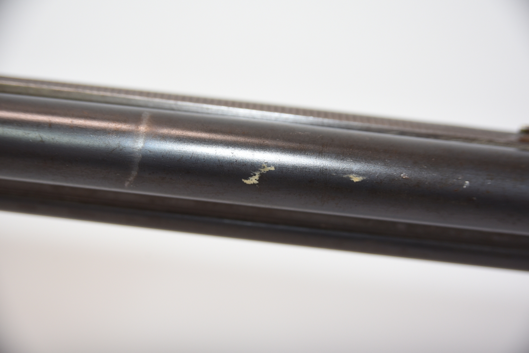 Metal finish shows scratches and scuffs, there are few light small dents on the barrels, top lever is loose, some patina, some varnish on the lock plates, few light dents; condition is fair.