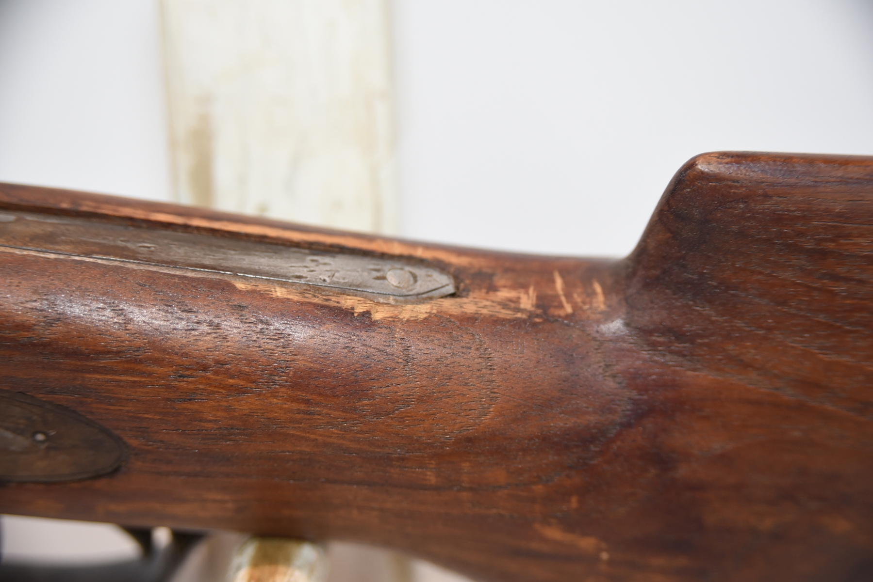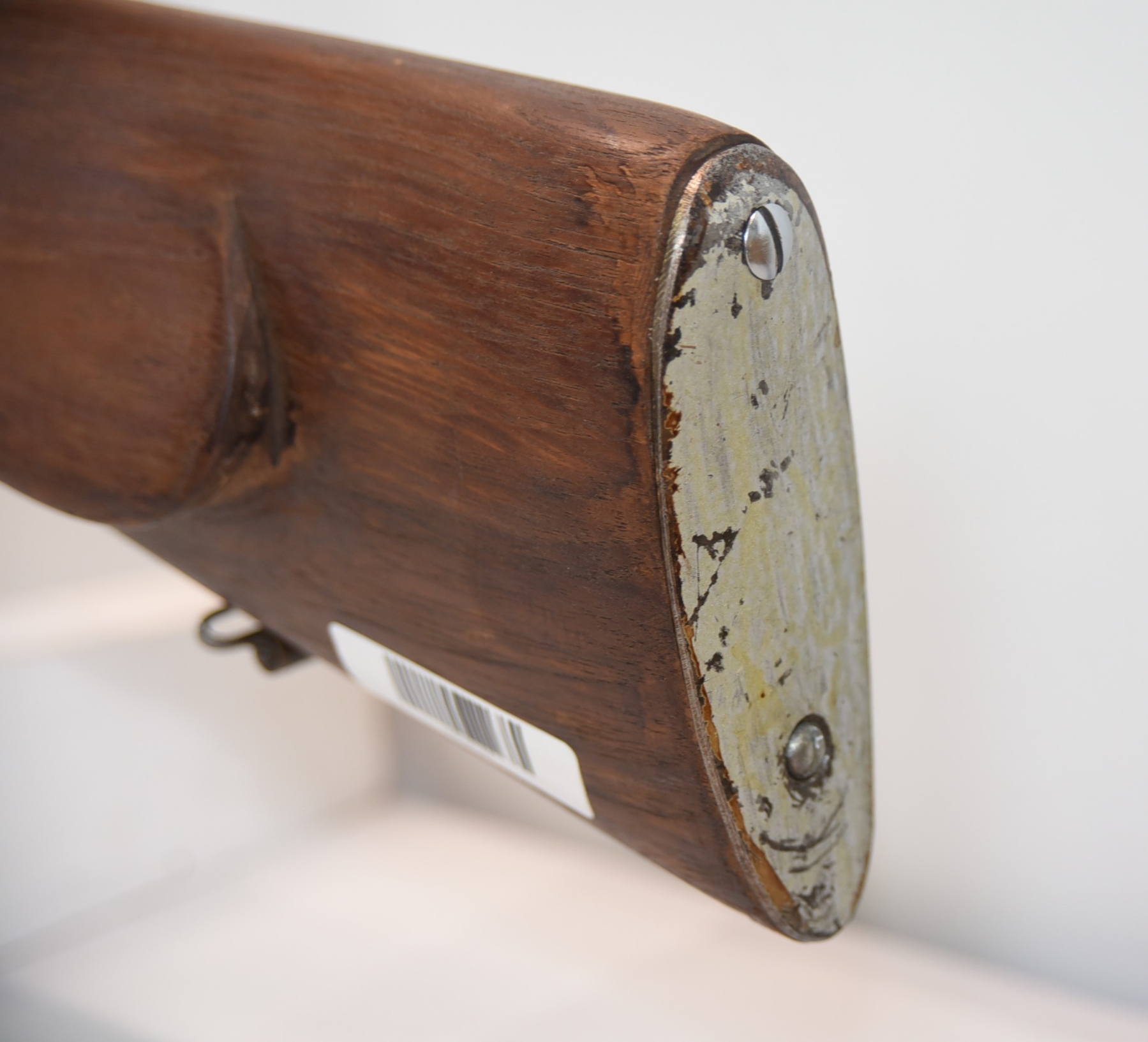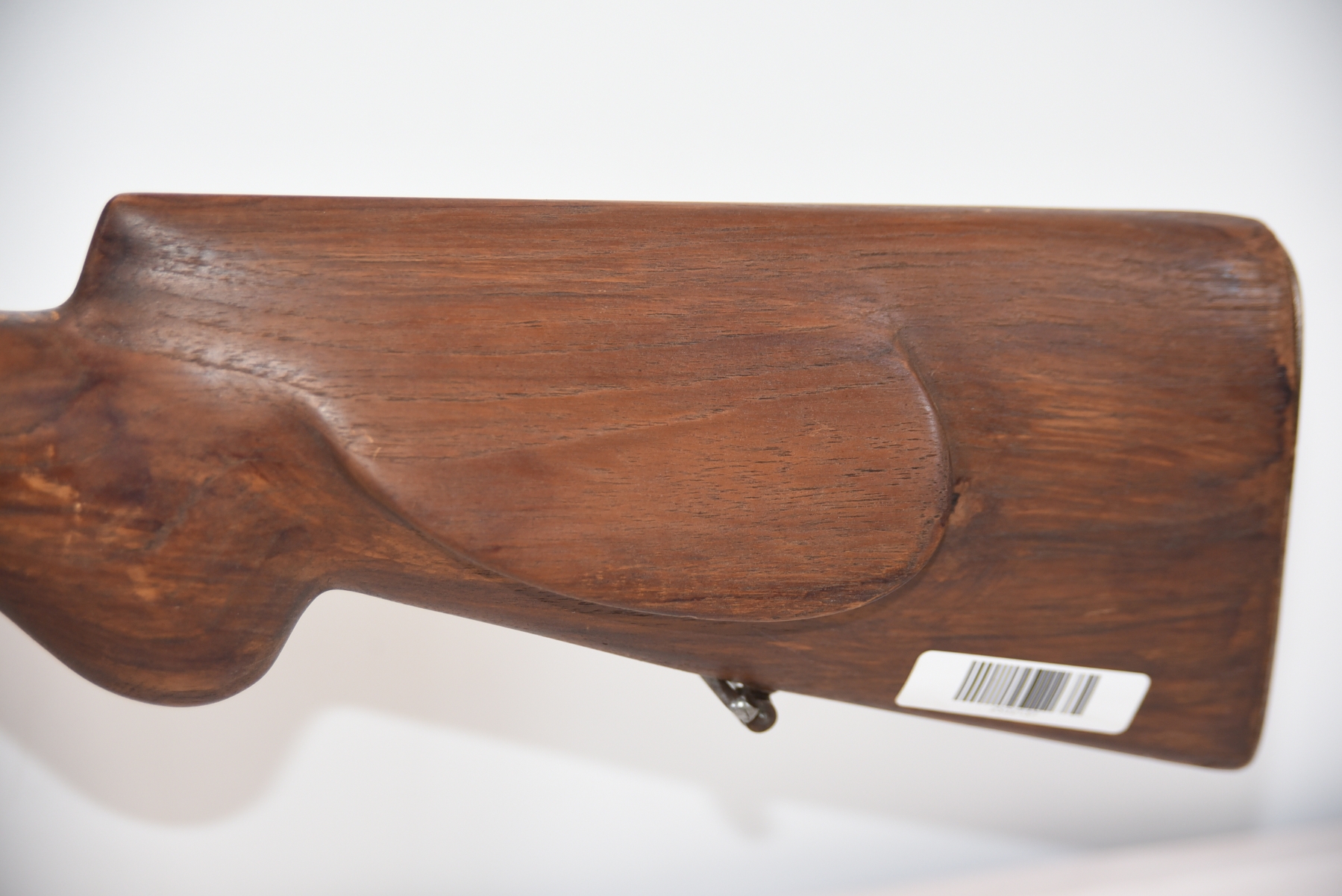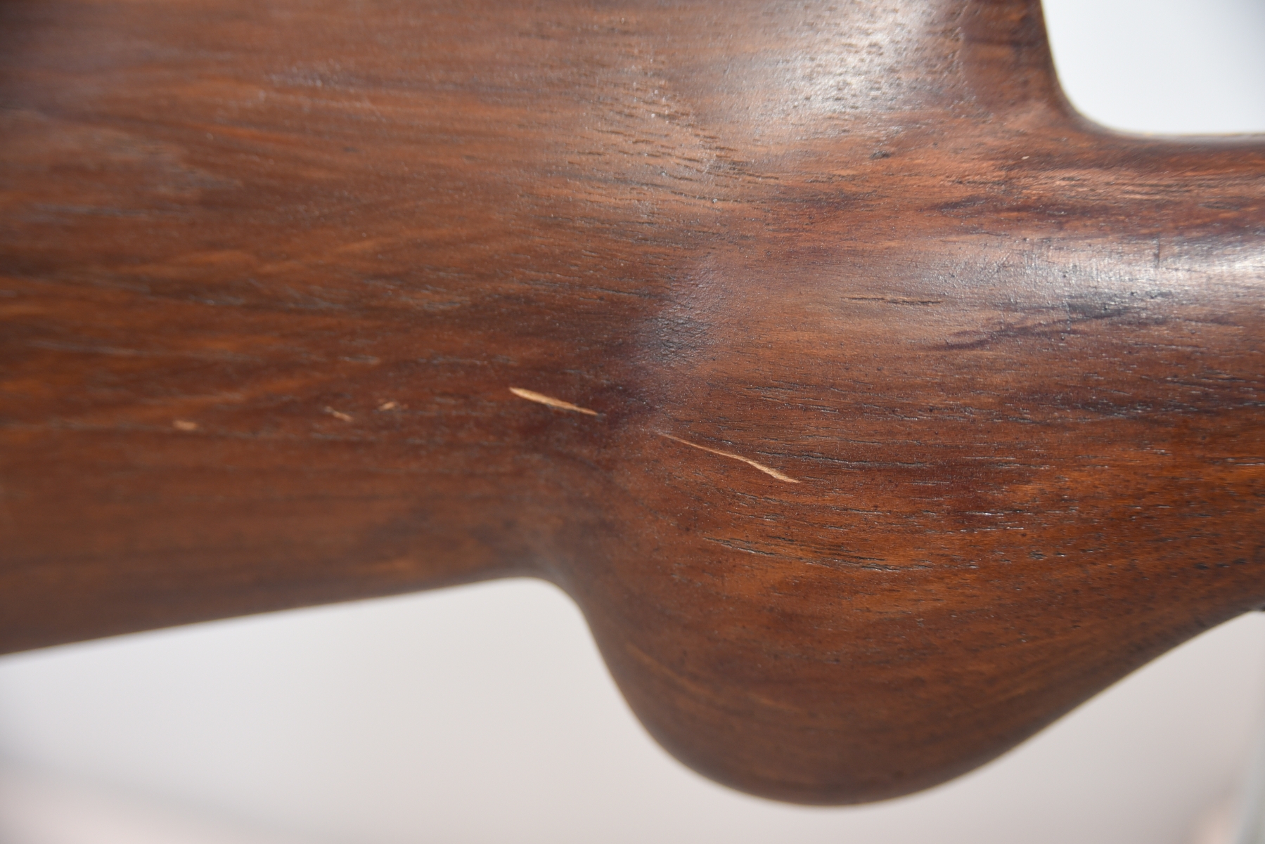 Wood stock shows rear stock has been replaced at some point, there are scratches, scuffs and dents on the stock; condition is fair.