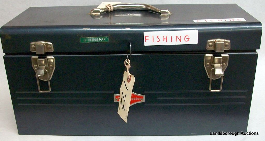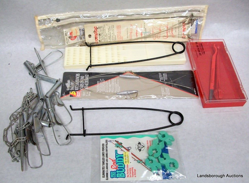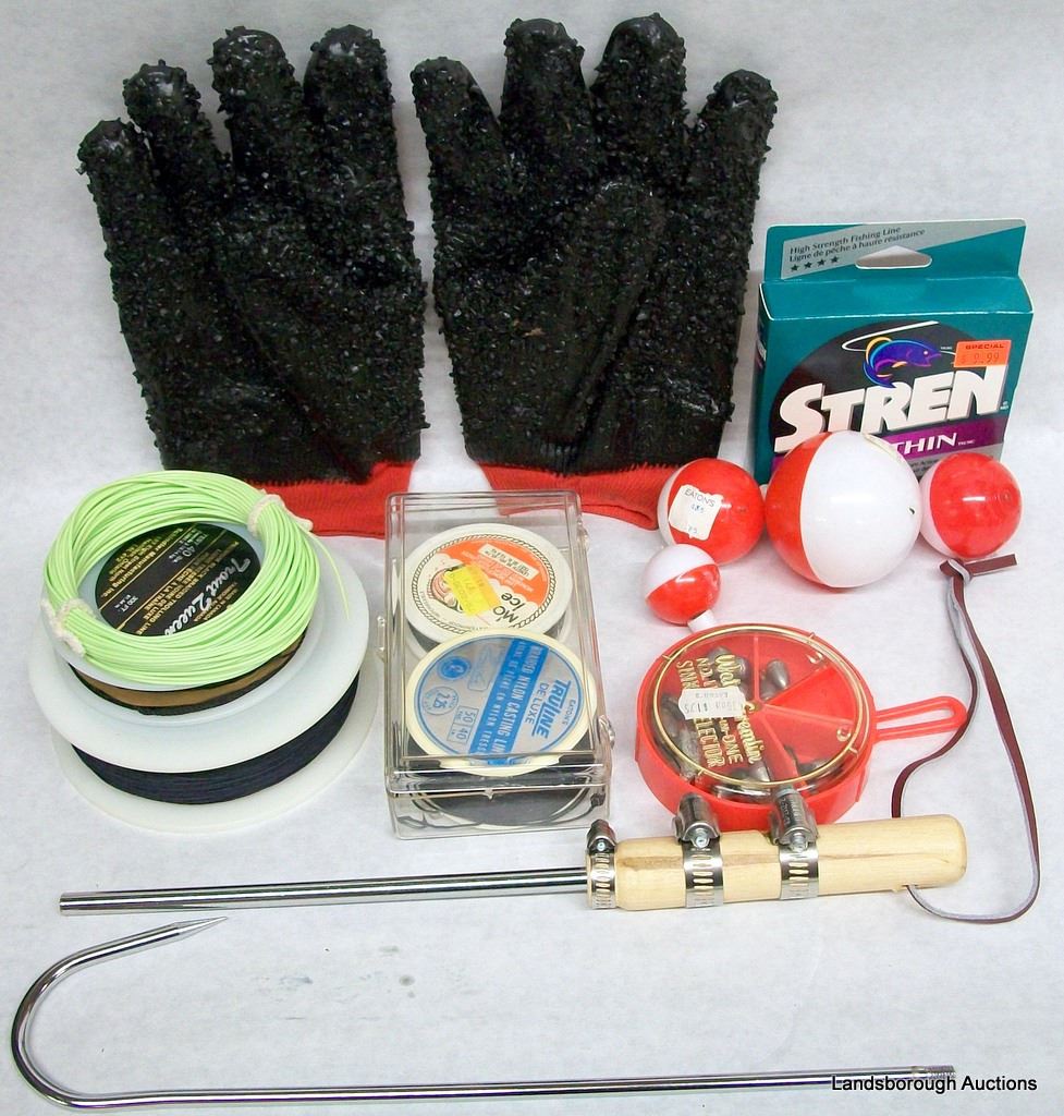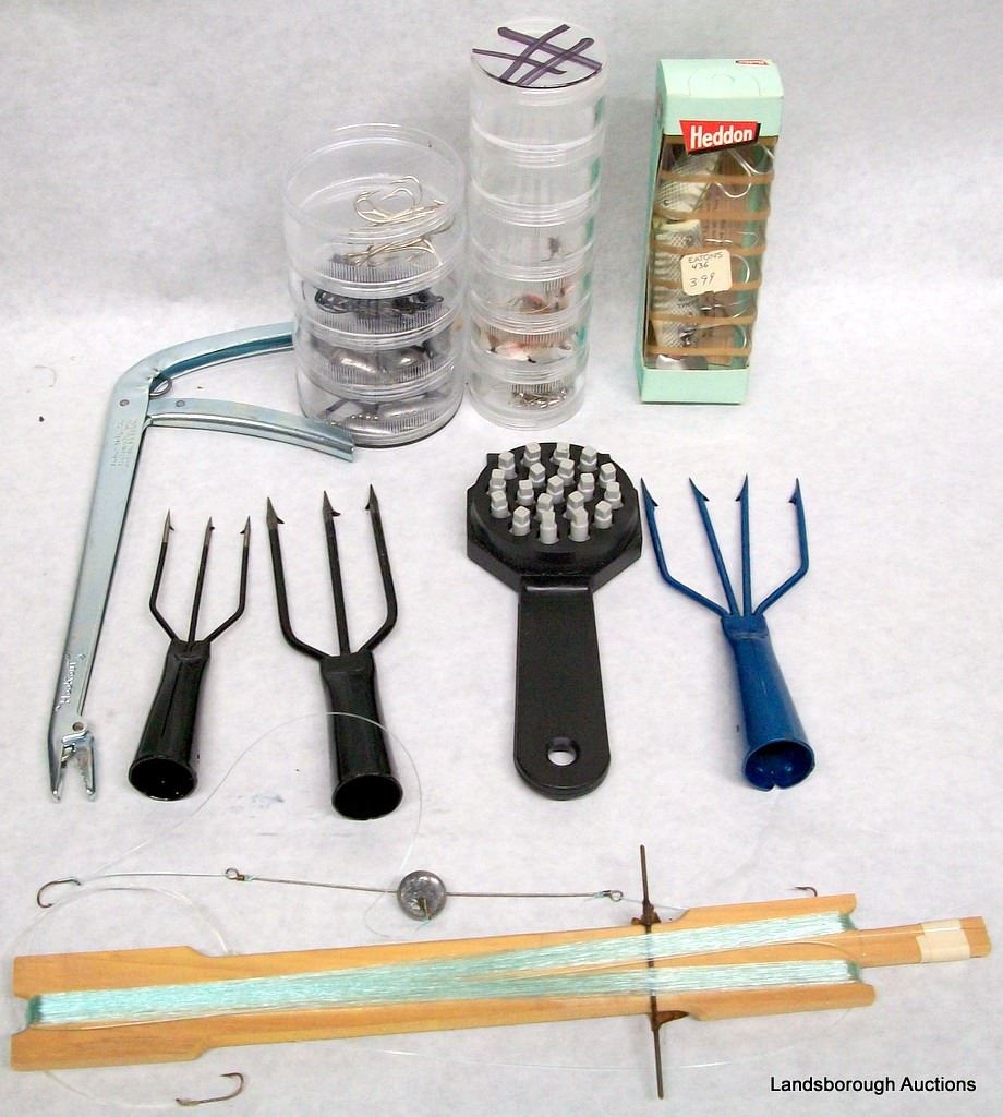 THREE SPEAR HEADS, SCALER, HEDDON LURE, TIP UP, FLYS, LINE, FISH CHAIN, CLAW GLOVES, SINKERS, FLOATS, JAW SPREADERS, FLY LINE, HOOKS, GAFF, LEADERS.