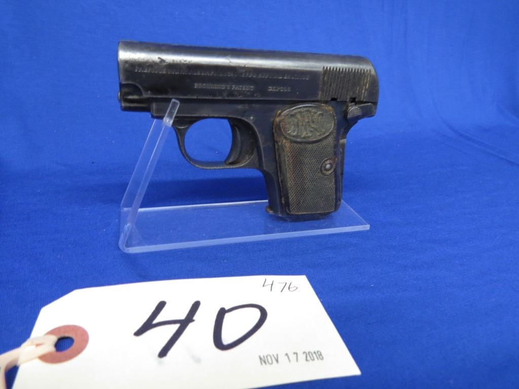 Prohibited, semi auto, 6.35mm, 54mm barrel, SN 877551. Grips fair, bluing grey and deeply pitted, bore deeply pitted.