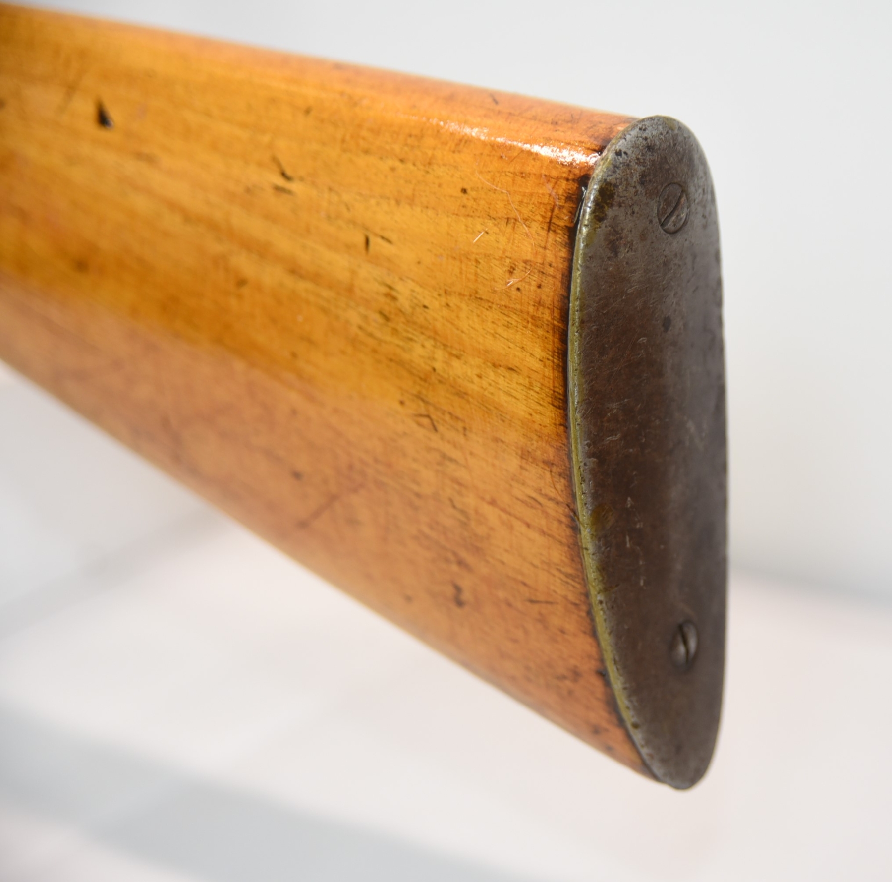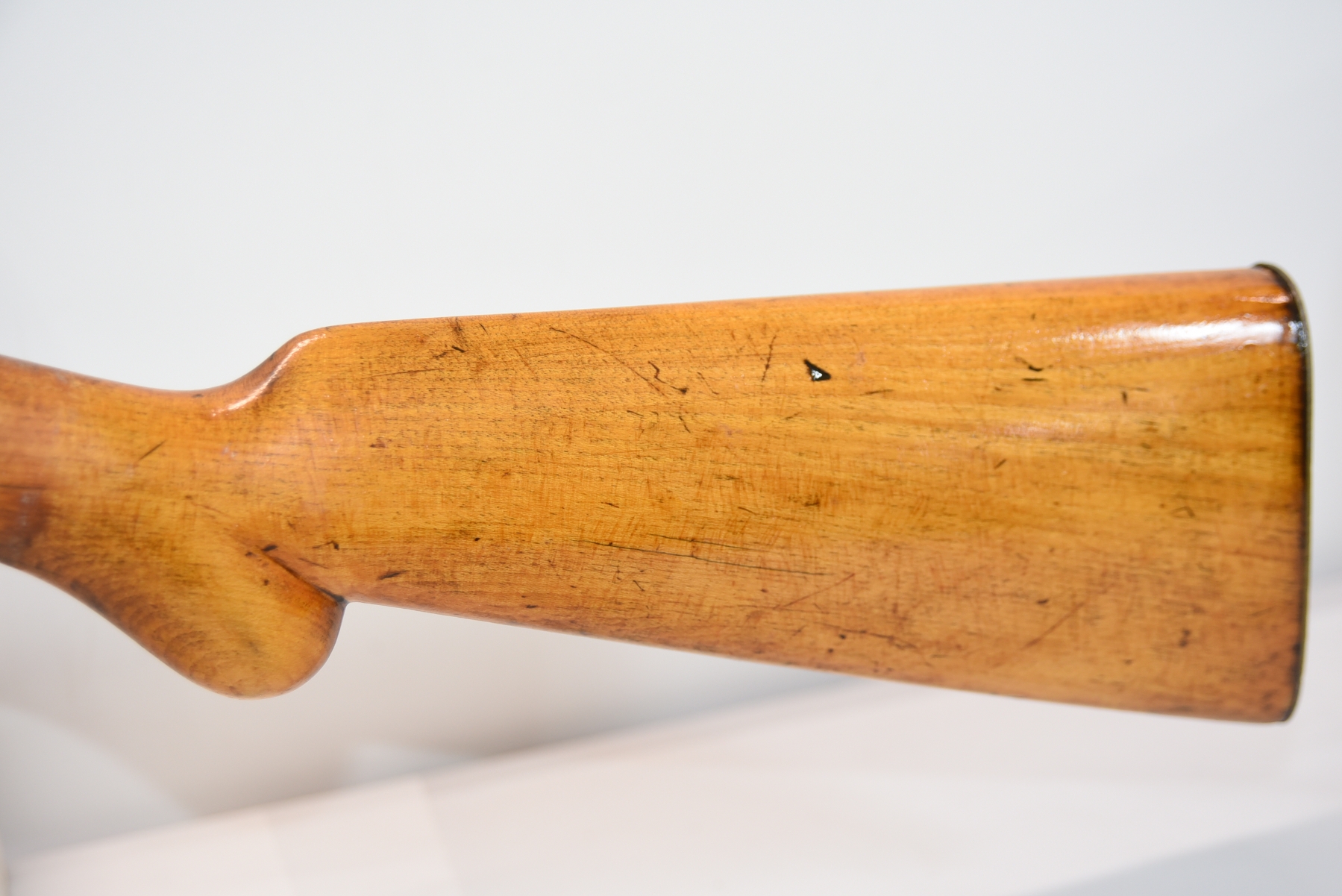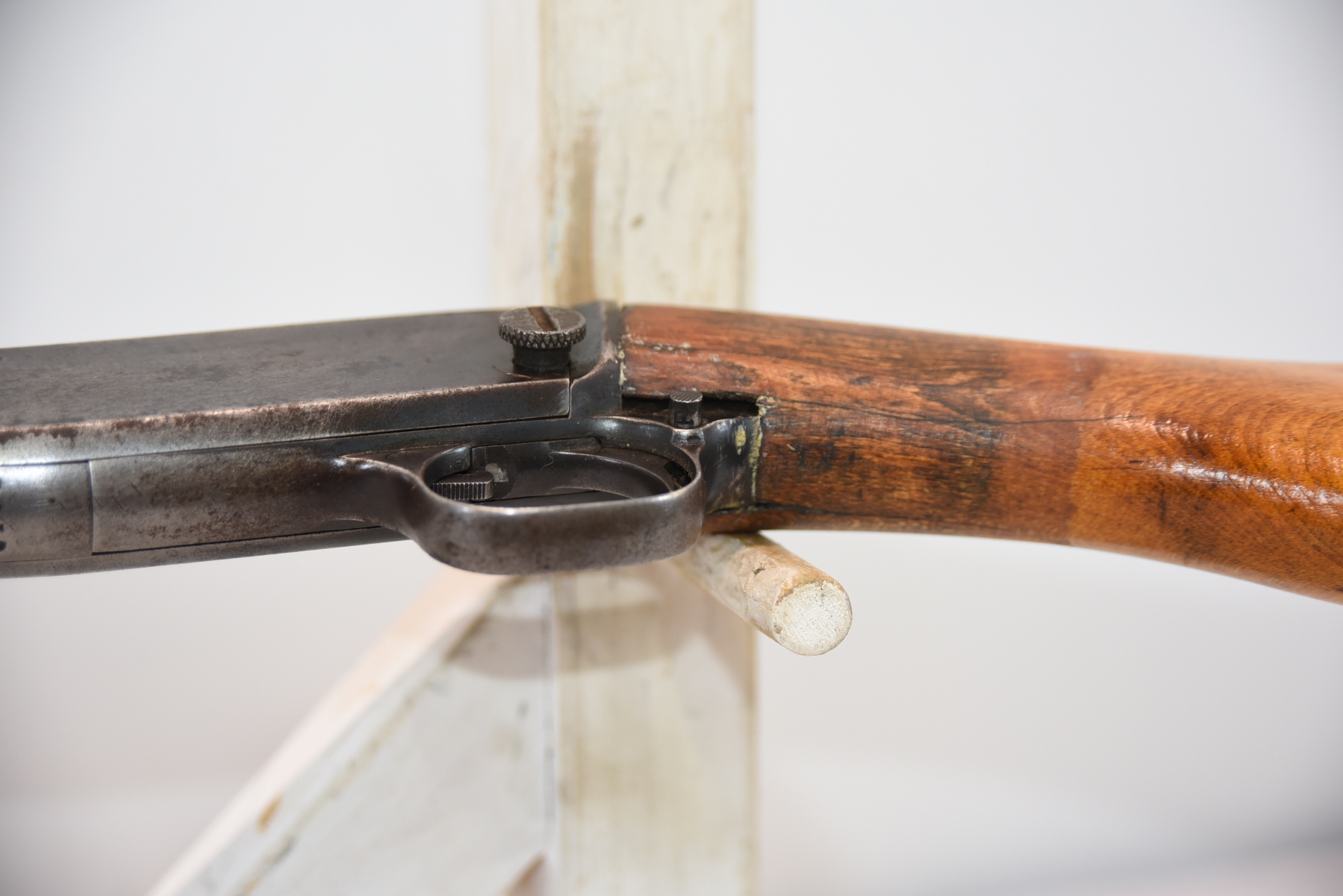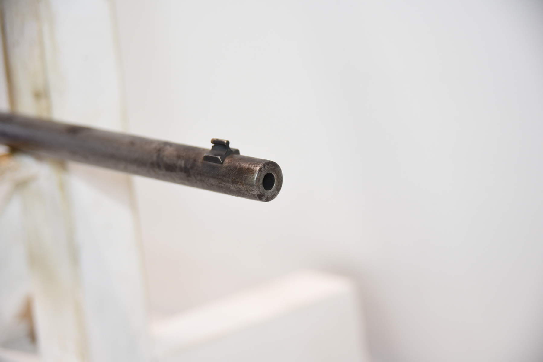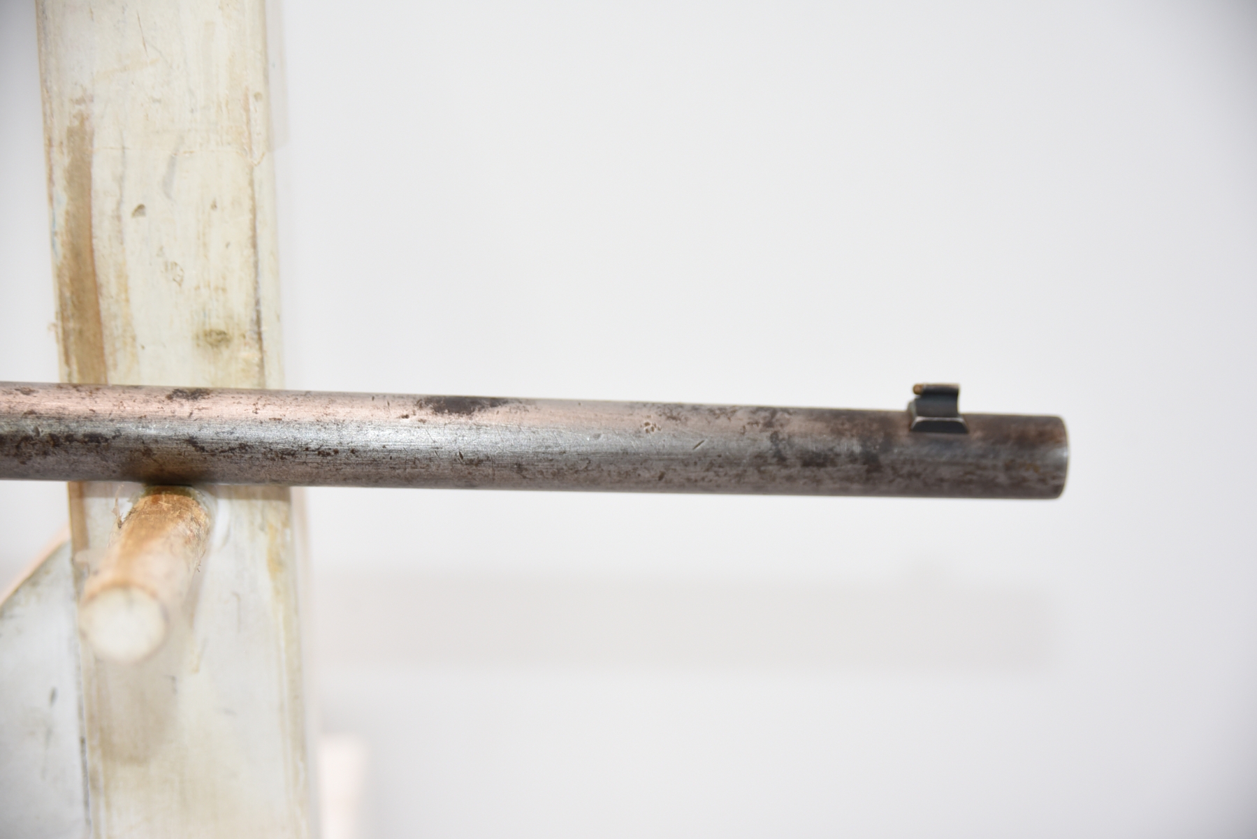 The wooden stock has a number of scratches and dents on both sides as well as the top and underneath. The wooden forearm has a number of scratches and dents. The forearm also has a crack from one side to the other side on the underneath. There is varnishing on the bluing. The bluing has a number of scratches as well as rust. The bore is shiny with apparent rifling, in good condition.