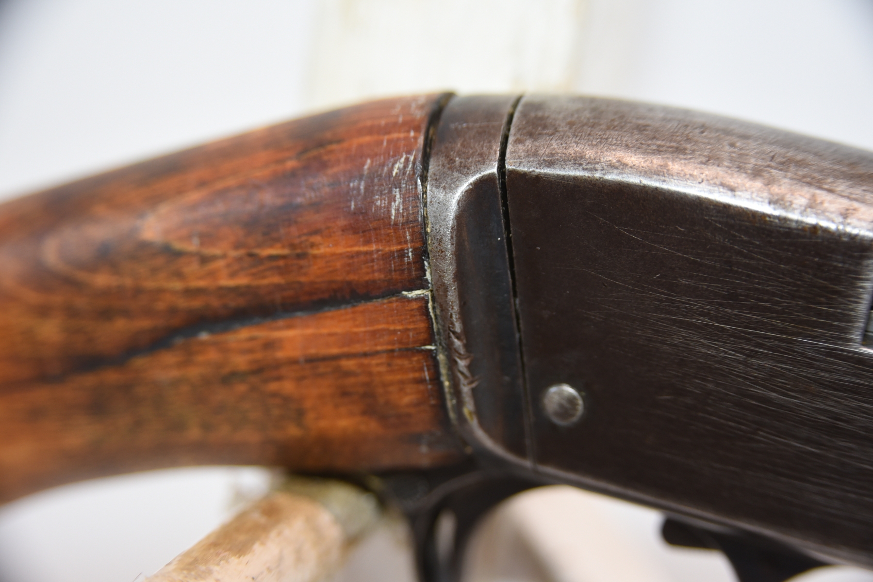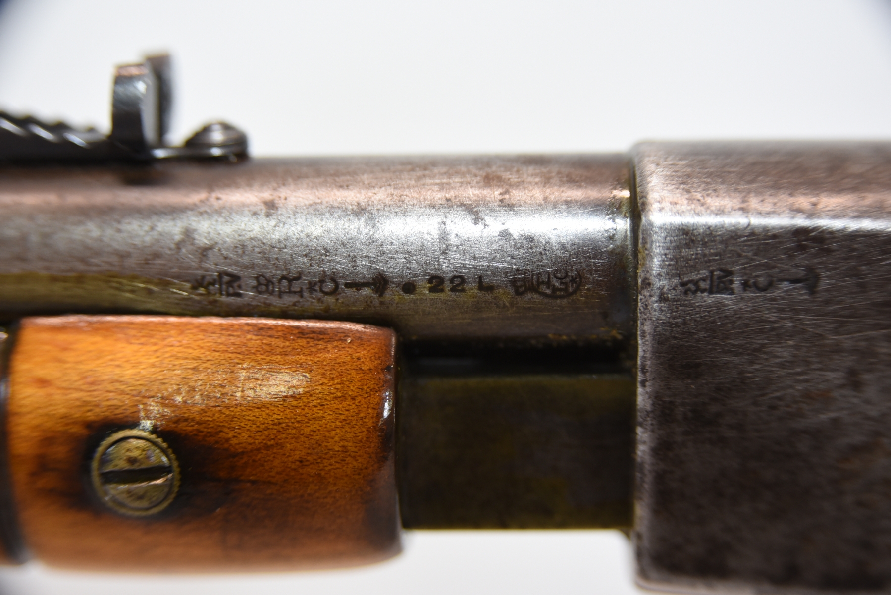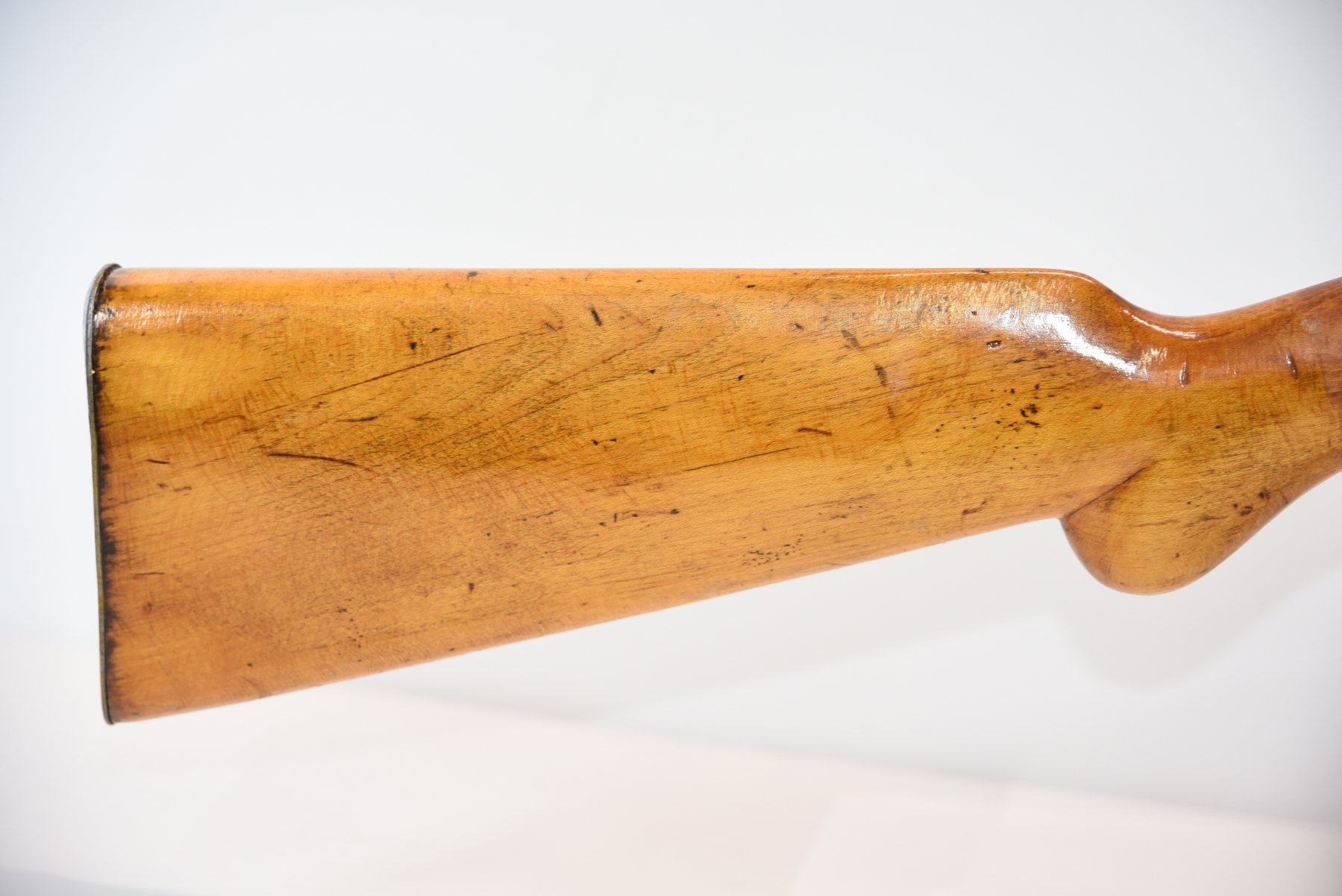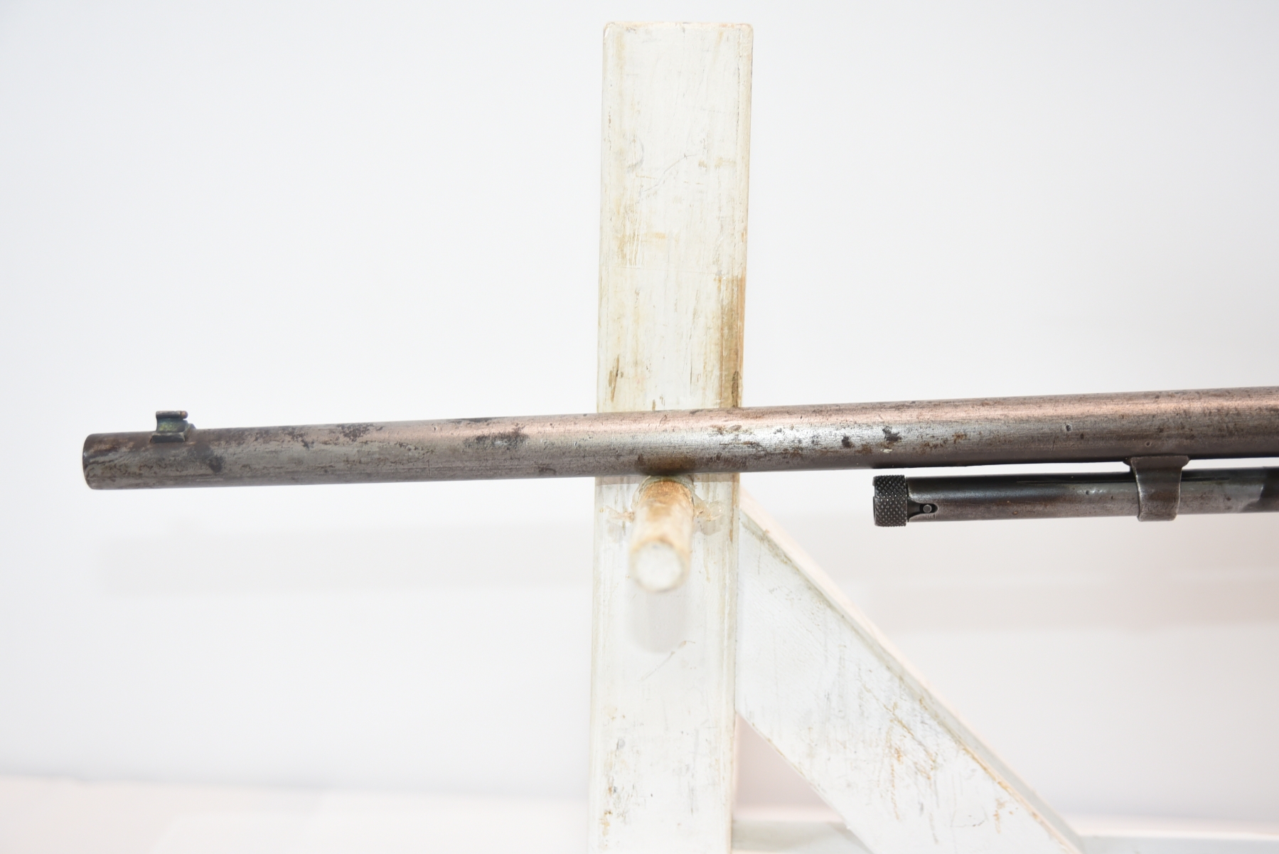 The wooden stock has a number of scratches and dents on both sides as well as the top and underneath. The wooden forearm has a number of scratches and dents. The forearm also has a crack from one side to the other side on the underneath. There is varnishing on the bluing. The bluing has a number of scratches as well as rust. The bore is shiny with apparent rifling, in good condition.