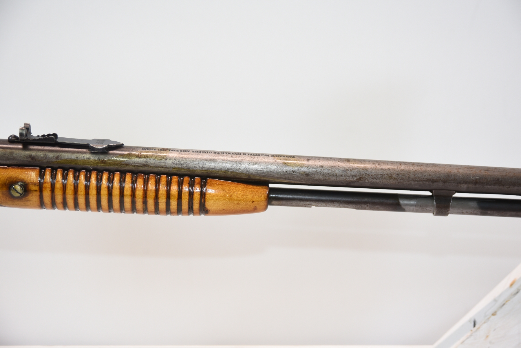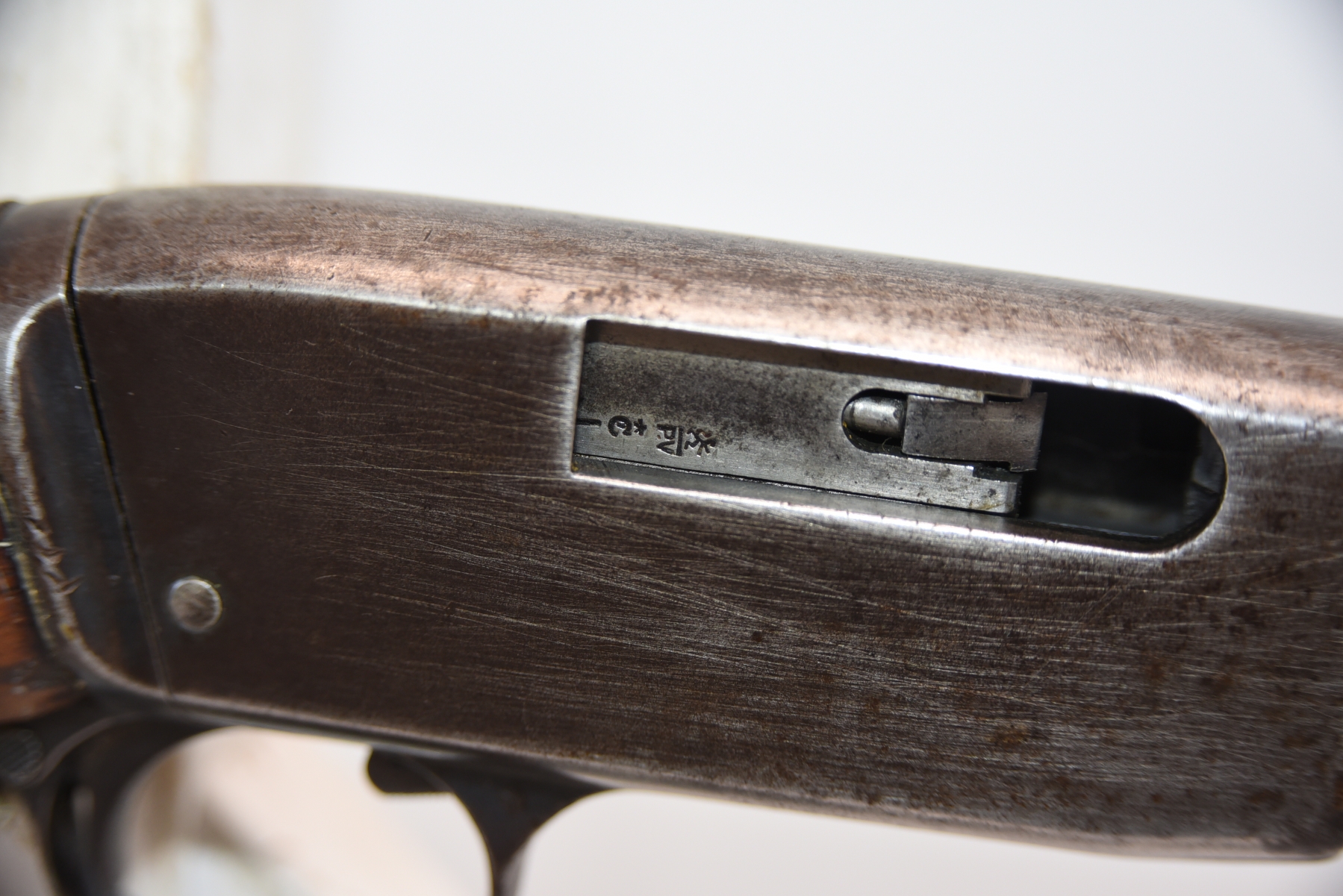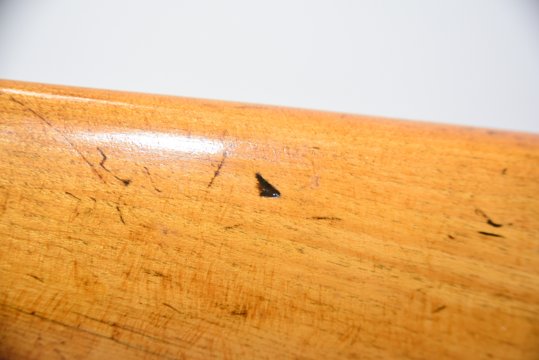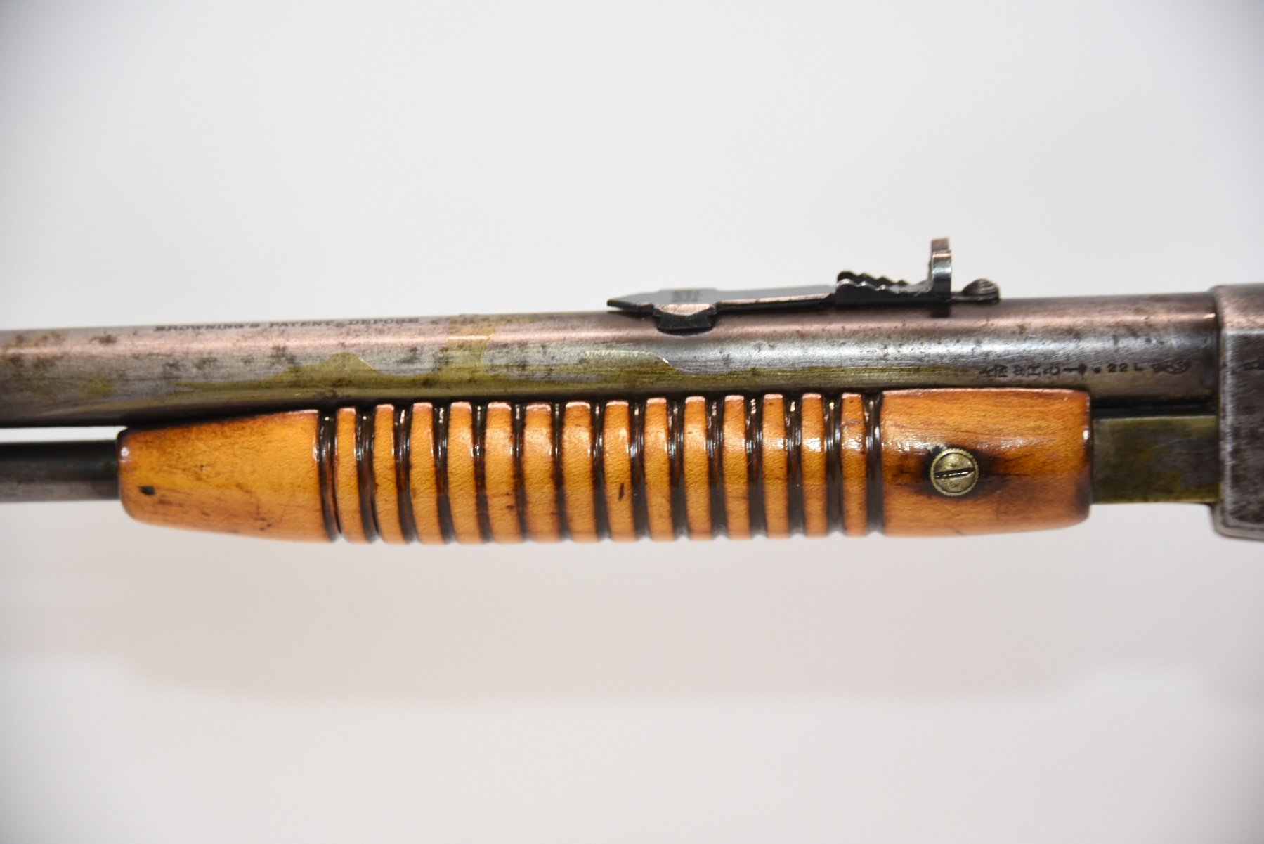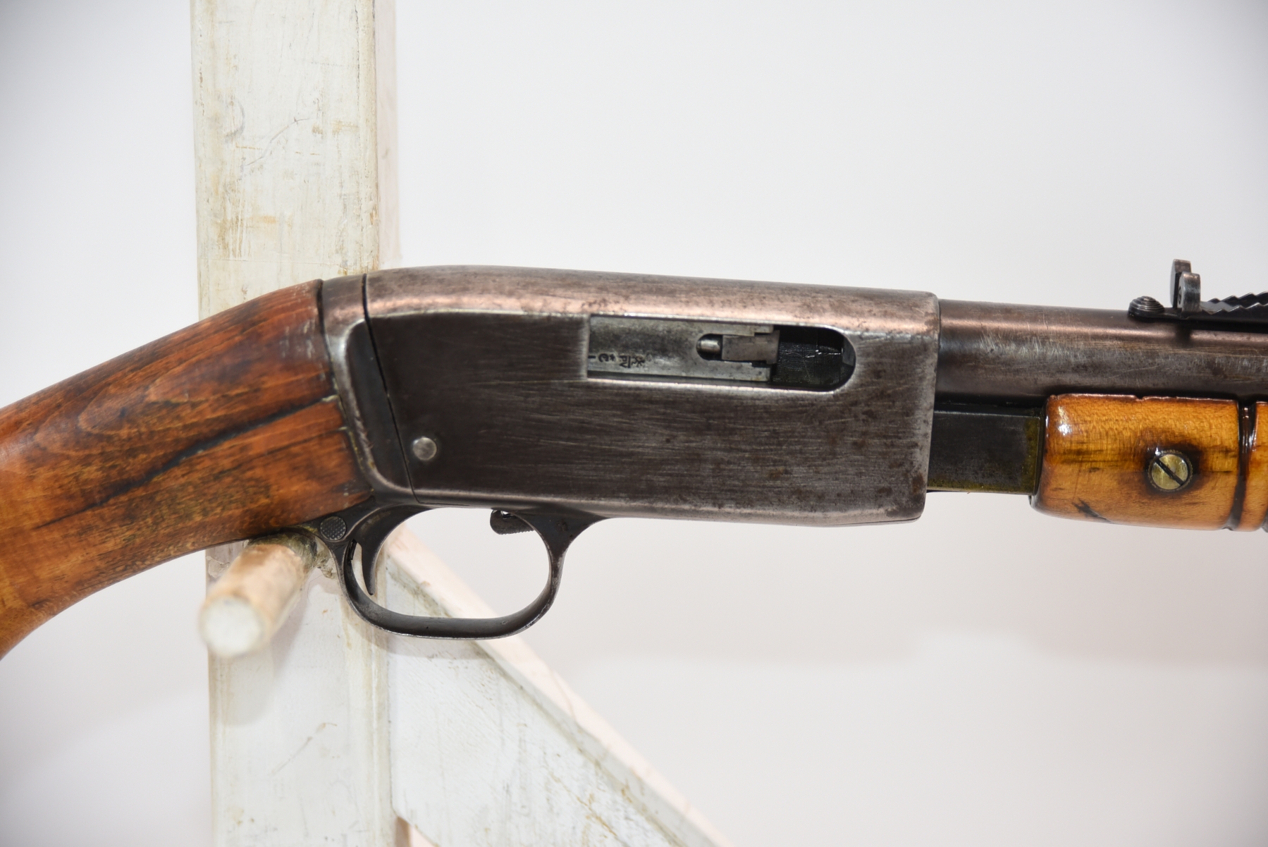 The wooden stock has a number of scratches and dents on both sides as well as the top and underneath. The wooden forearm has a number of scratches and dents. The forearm also has a crack from one side to the other side on the underneath. There is varnishing on the bluing. The bluing has a number of scratches as well as rust. The bore is shiny with apparent rifling, in good condition.