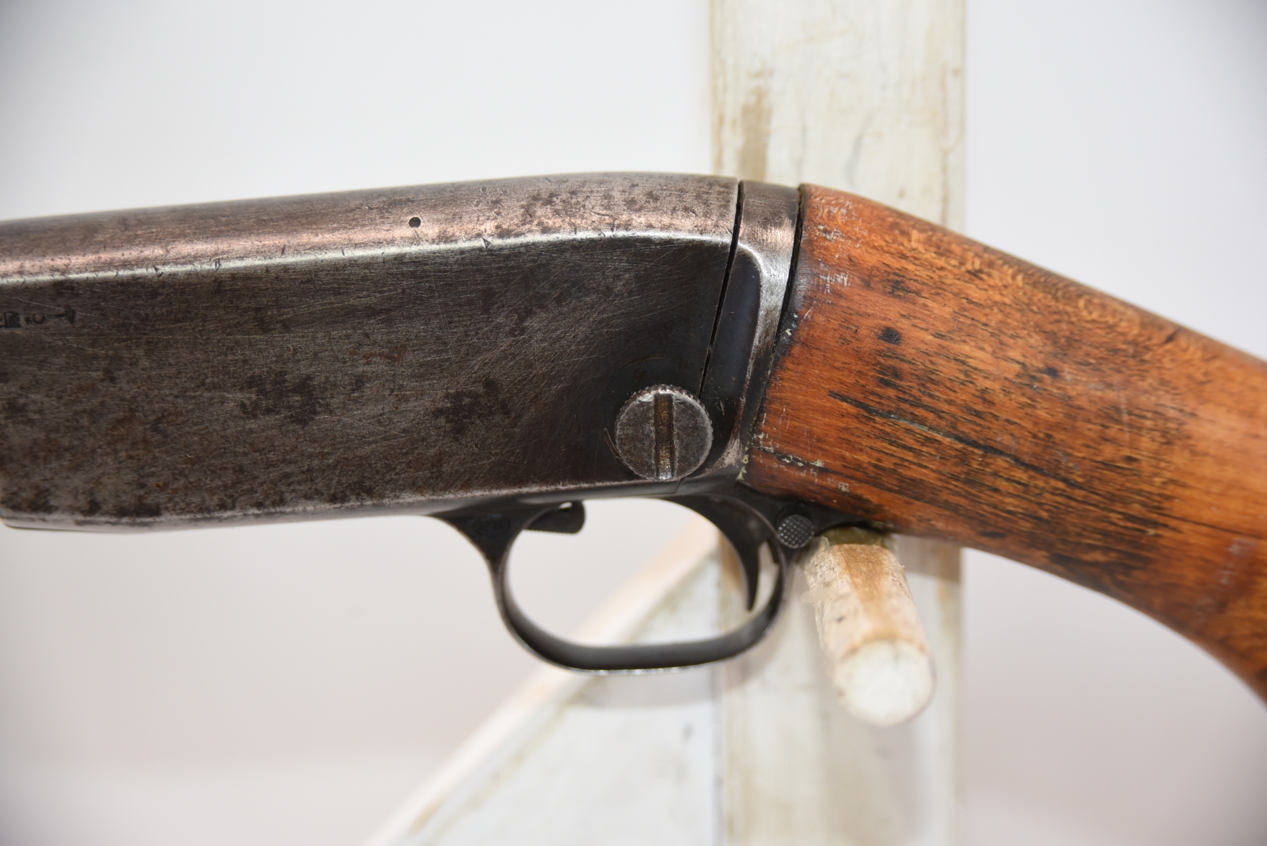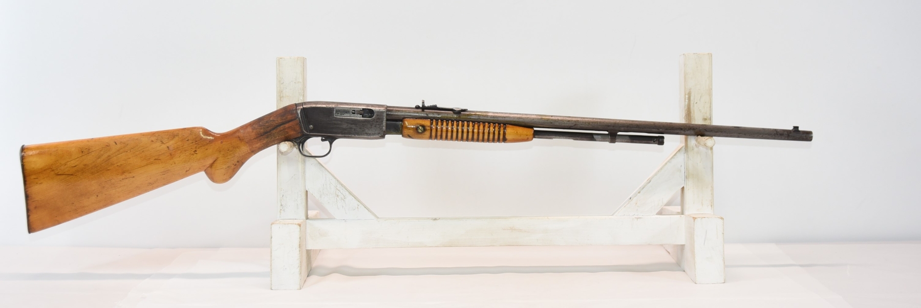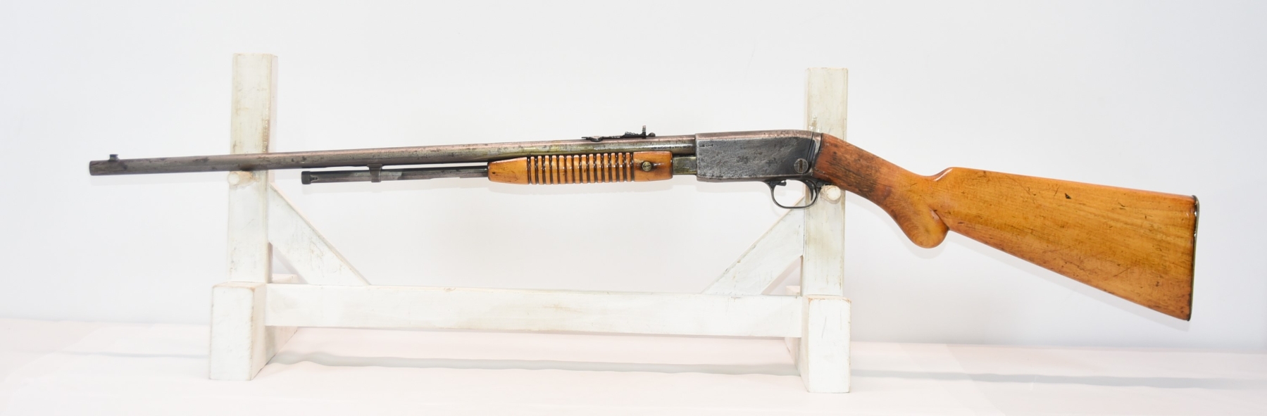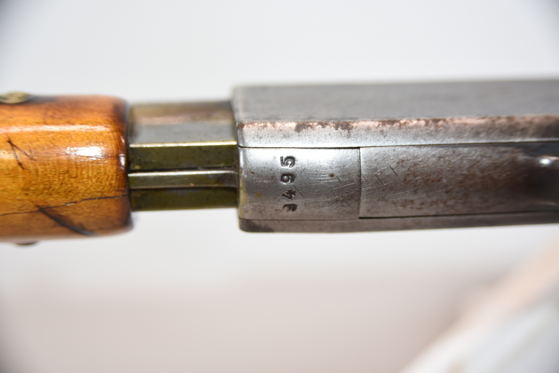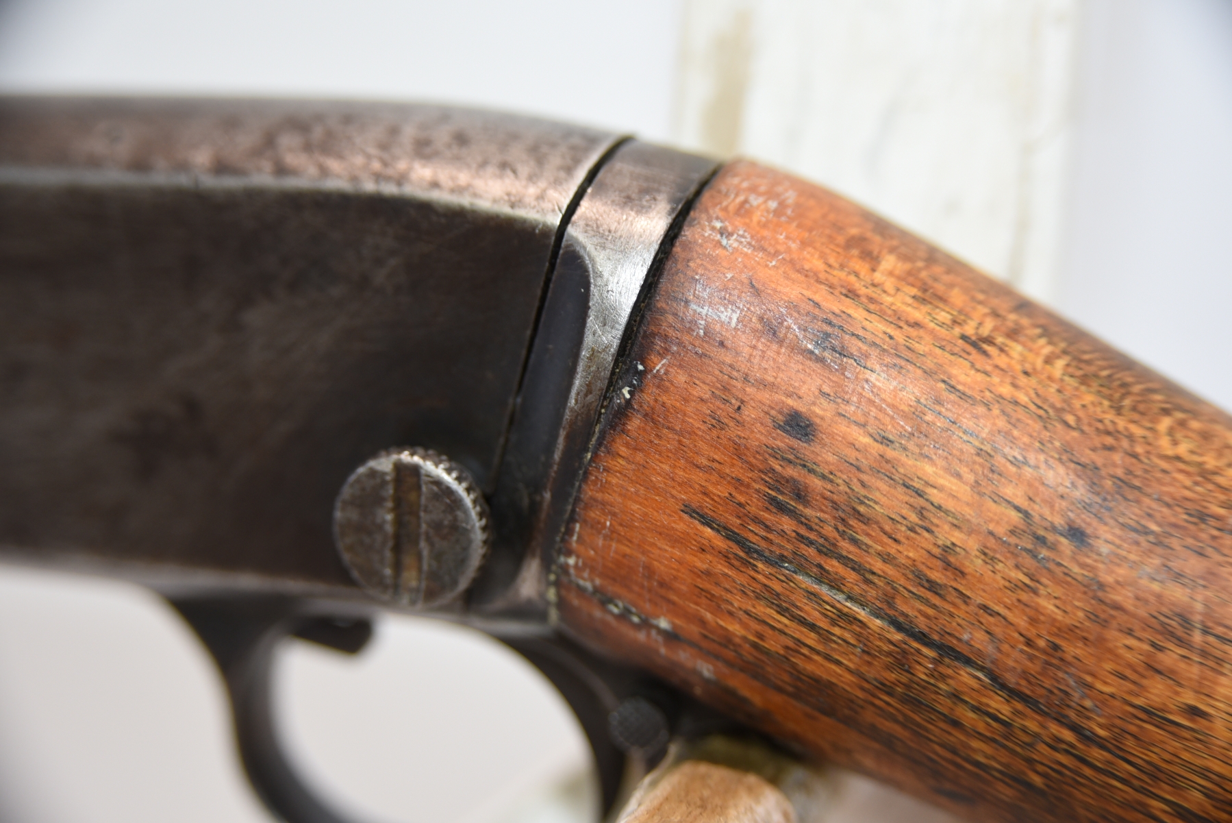 The wooden stock has a number of scratches and dents on both sides as well as the top and underneath. The wooden forearm has a number of scratches and dents. The forearm also has a crack from one side to the other side on the underneath. There is varnishing on the bluing. The bluing has a number of scratches as well as rust. The bore is shiny with apparent rifling, in good condition.
