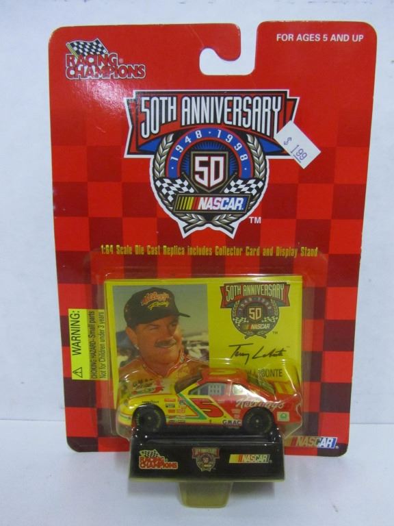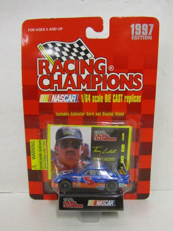 ONE NASCAR RACING CHAMPIONS TERRY LABONTE 1:64TH SCALE DIE CAST REPLICA OF TERRY LABONTE'S 1997 EDITION STOCK CAR IN UNOPENED PACKAGE COME WITH STAND AND COLLECTOR CARD, ONE NASCAR 50TH ANNIVERSARY 1:64TH SCALE DIE UNOPENED PACKAGE COMES WITH STAND, ONE NASCAR RACING CHAMPIONS TERRY LABONTE 1:64TH SCALE DIE CAST STOCK CAR IN UNOPENED PACKAGE COMES WITH STAND AND COLLECTORS CARD.