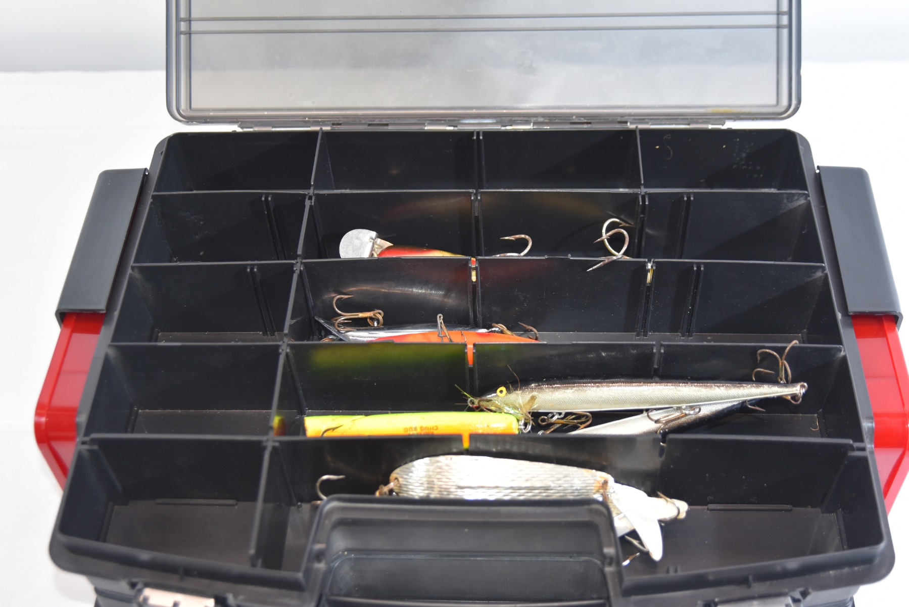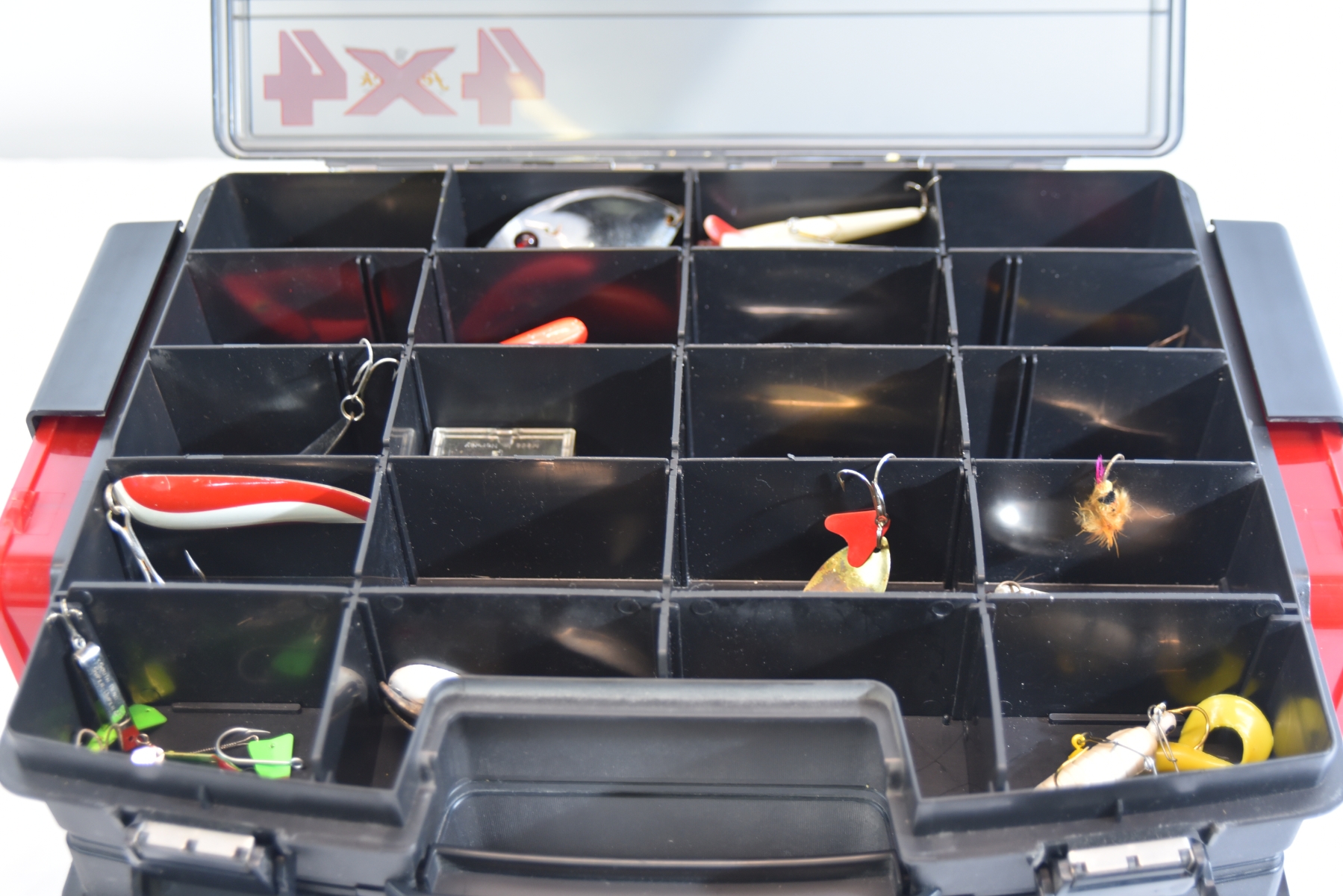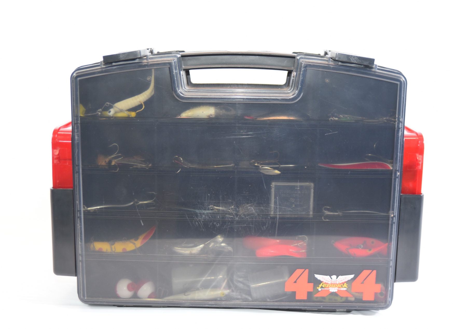 Plastic tackle organizer (Fenwick-branded “4x4” style)