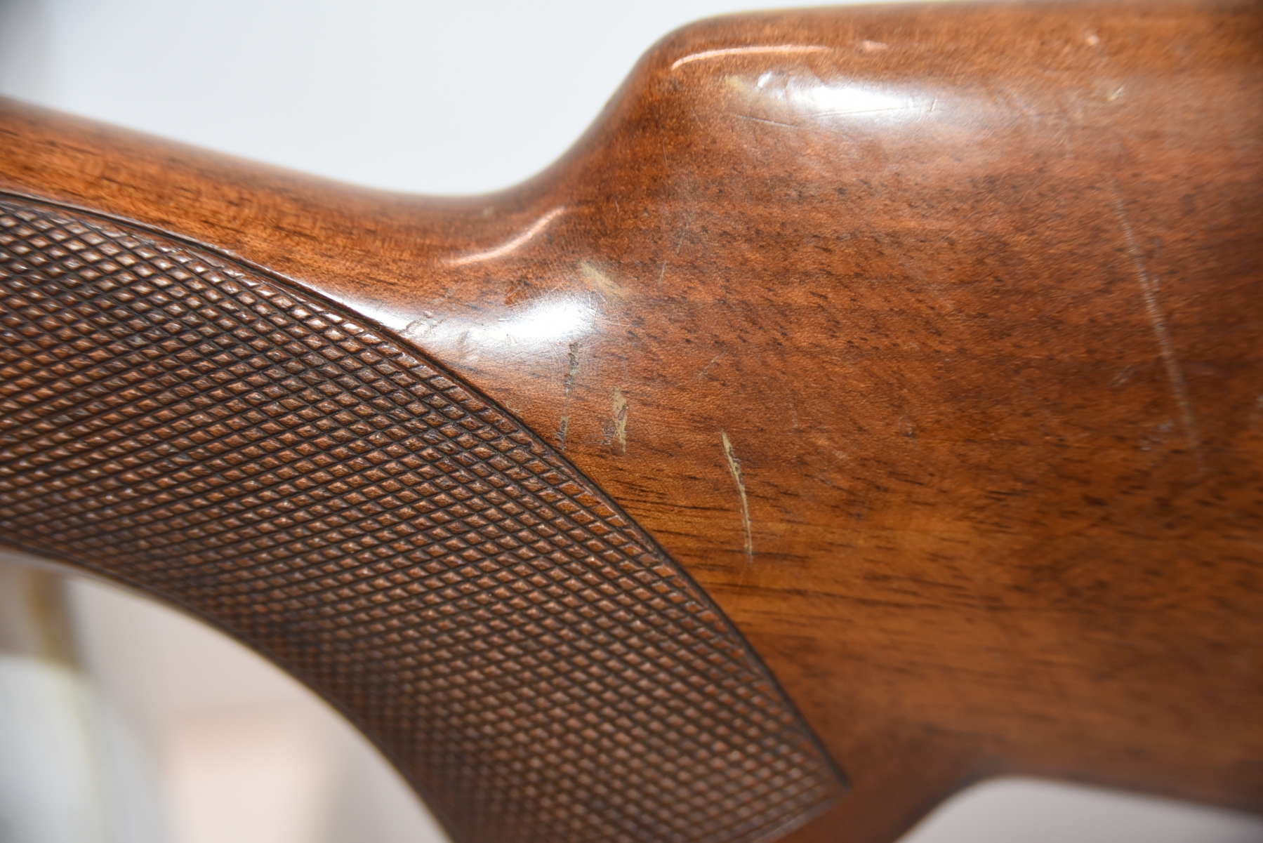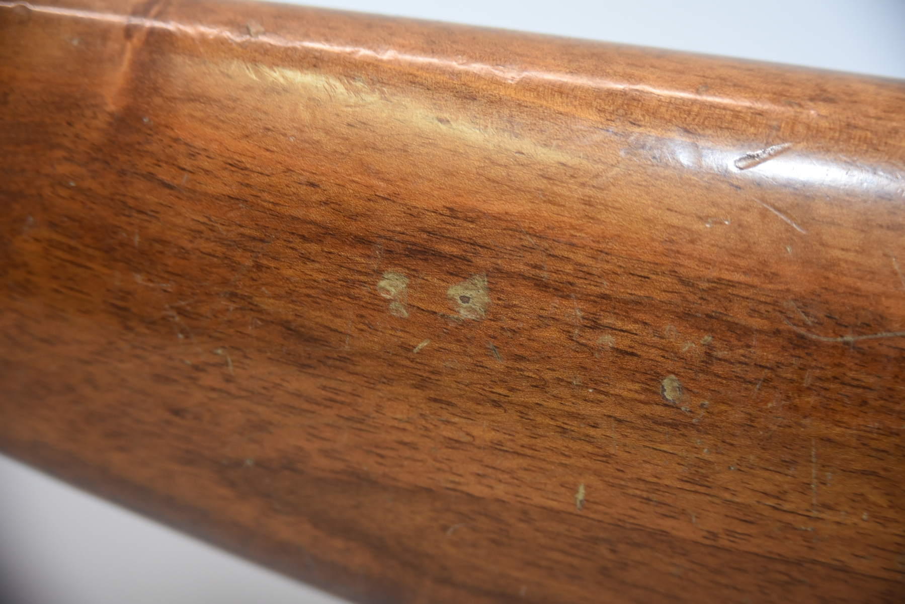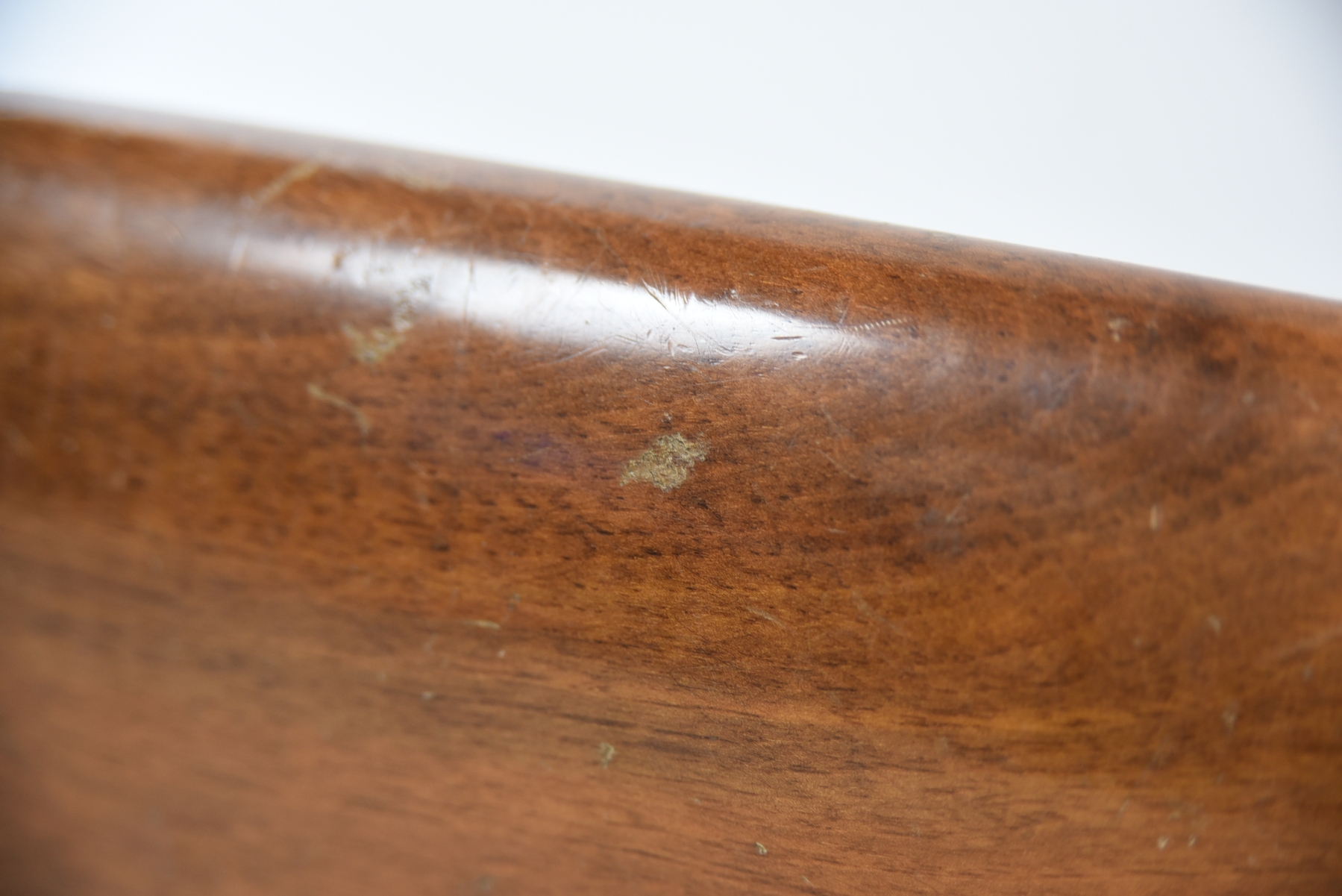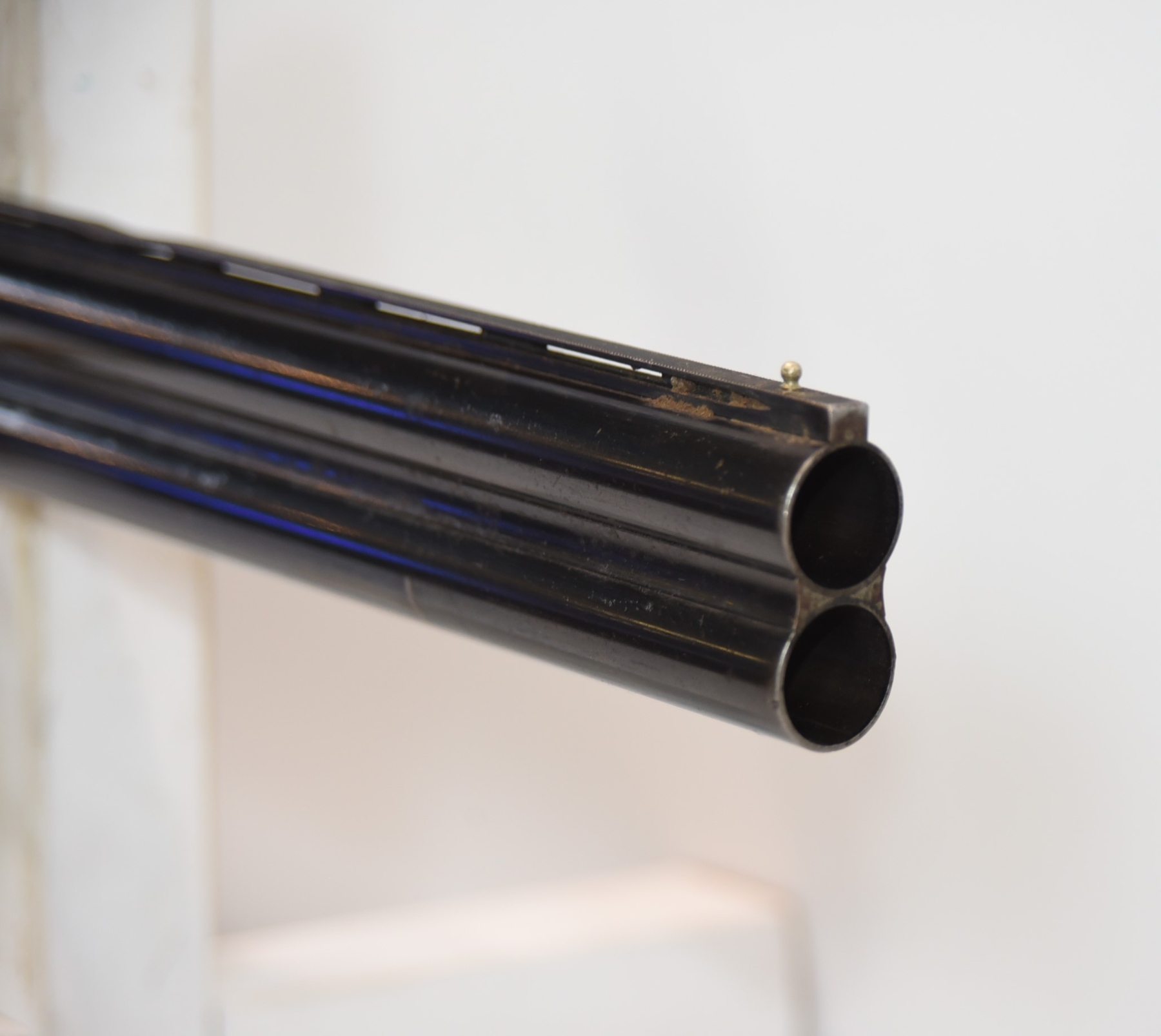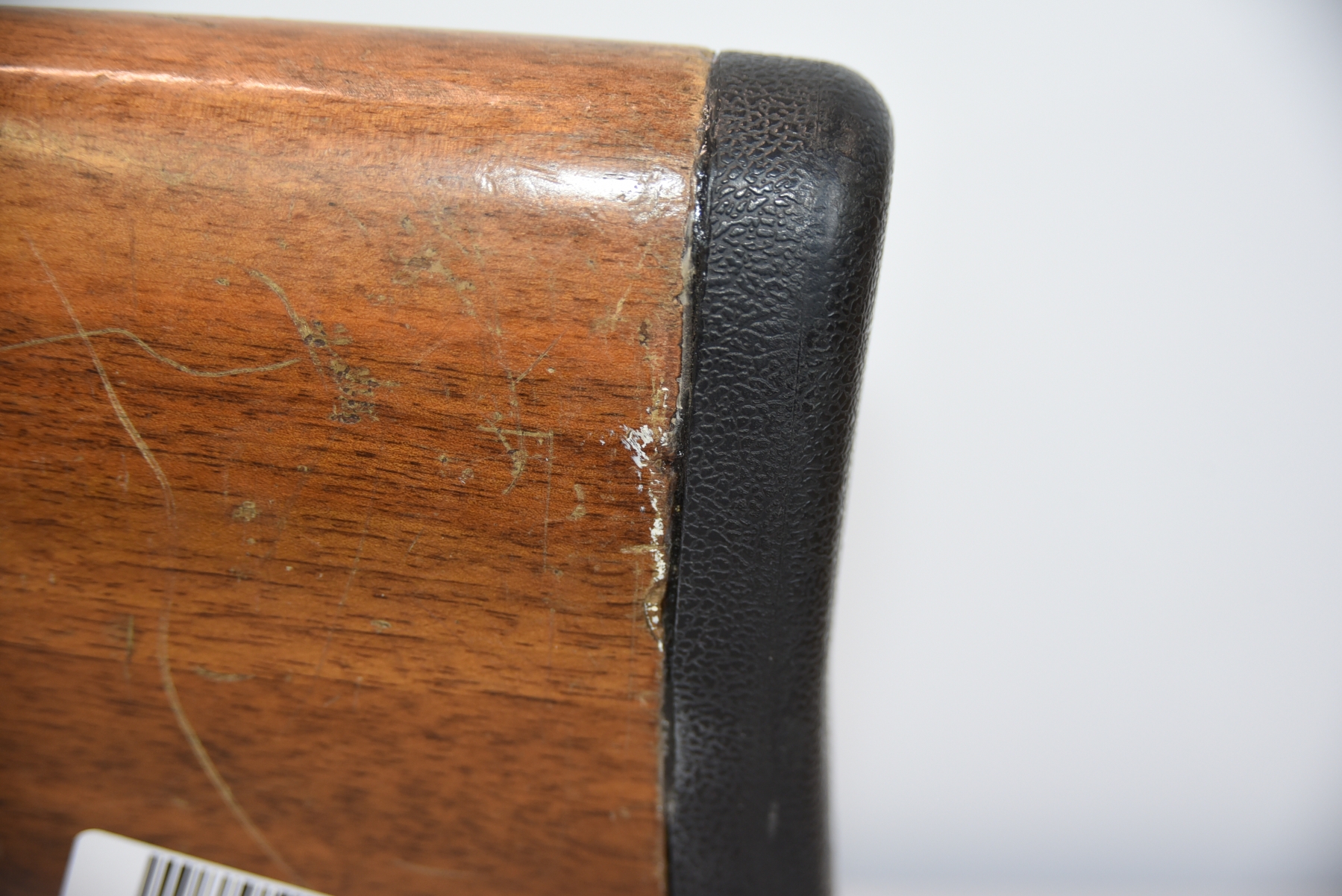 Metal finish shows top rib dented, there are rust specks in various areas and rust towards the muzzle, scratches, finish wear; condition is fair.