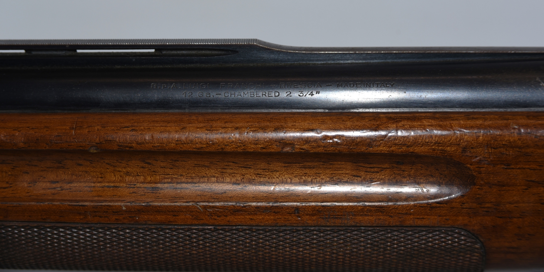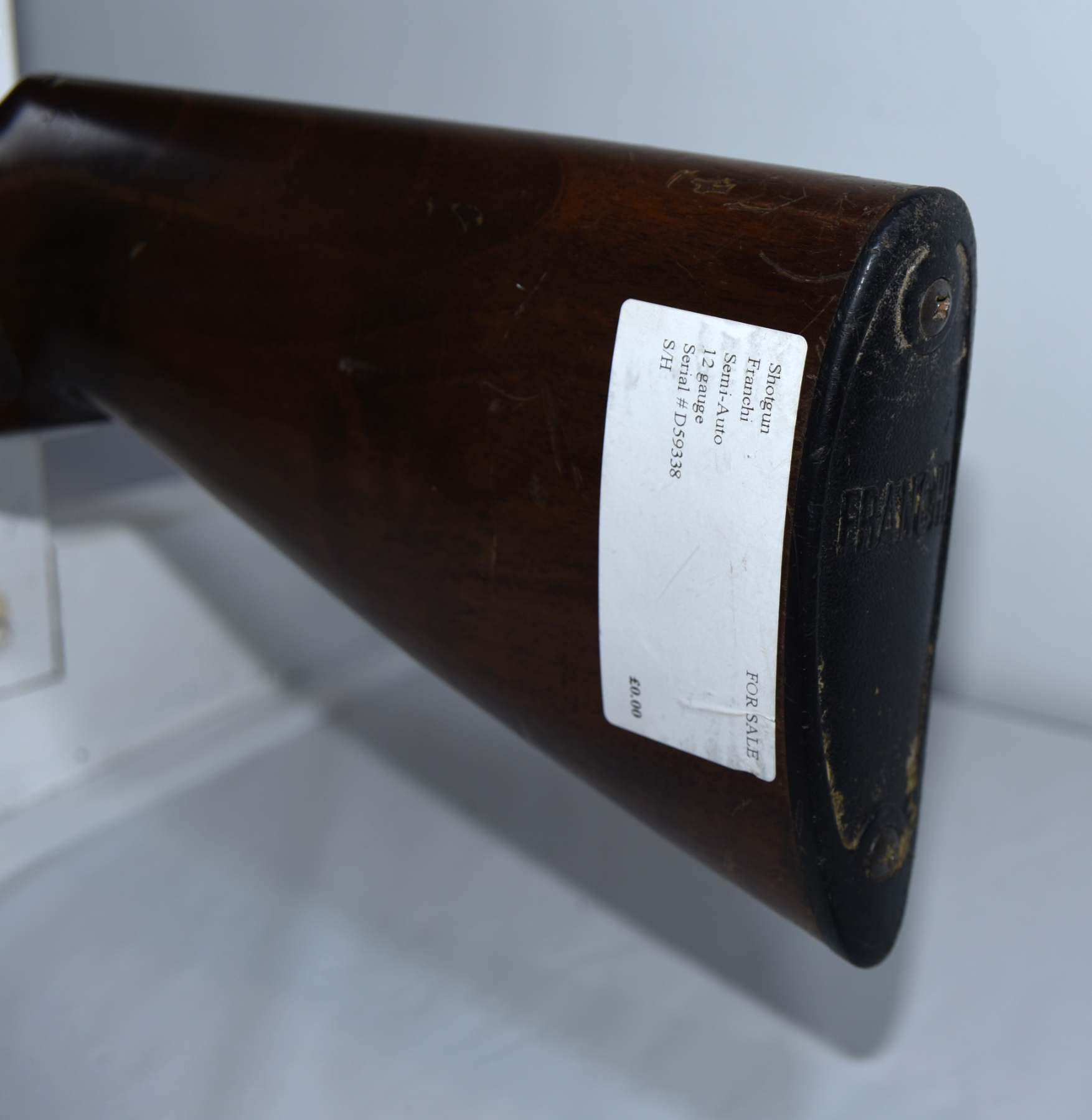 Wood stock shows light scratches, scuffs, there are cracks in the grip section, dents, finish wear spots; condition is good.