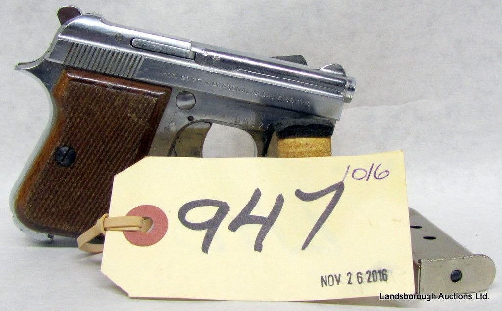 PROHIBITED, SEMI AUTO, 6.35MM, 62MM BARREL, SN D08789. WOOD GRIPS HAVE SOME SMALL DENTS, NICKEL PLATING HAS SOME SCRATCHES, BORE STAINED.