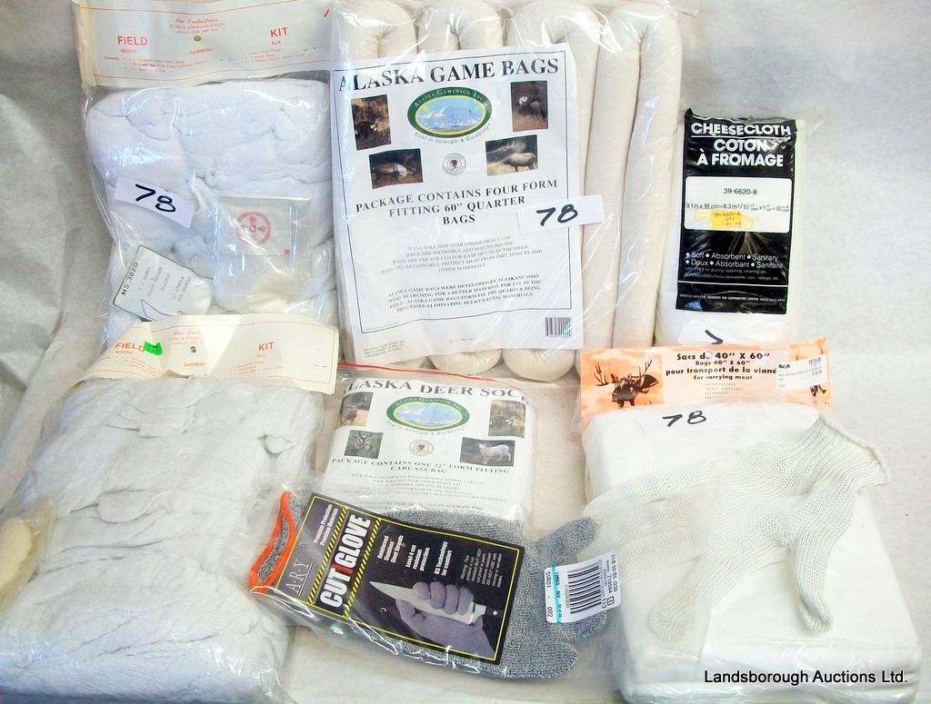ALASKA 60 INCH QUARTERS, TWO MAC INDUSTRIES FIELD KIT, SAIL 40 IN X 60 IN, ALASKA DEER SOCK, MOTOMASTER 10 SQ YD CHEESECLOTH.CUTTING GLOVES.