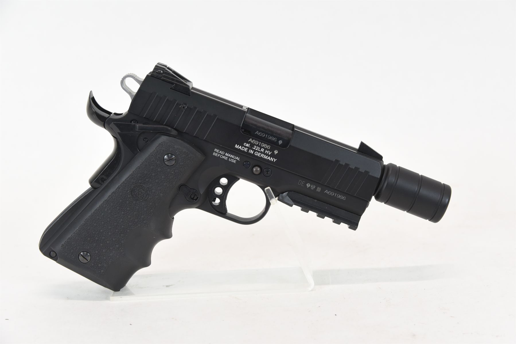 Finish is excellent. Bore is very good, but needs cleaning. Rubber grips are excellent. Skeletonized trigger and hammer. Semi adjustable sight, 1 magazine and hard case.