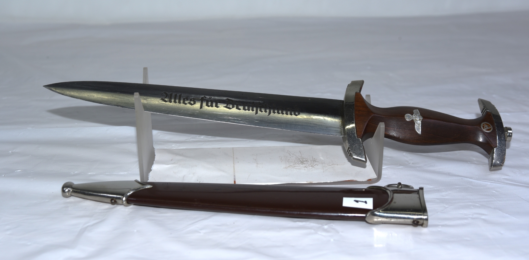 German WWII-era SA (Sturmabteilung) dagger with scabbard, featuring the classic straight double-edged blade and brown grip with metal fittings. The blade is etched with the well-known motto “Alles für Deutschland”, visible along one side, consistent with SA service daggers of the period.