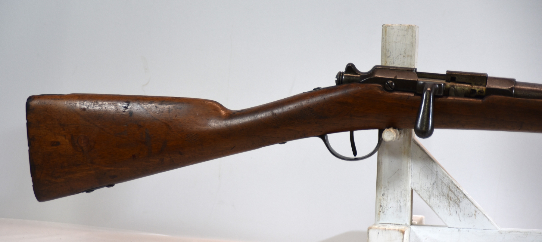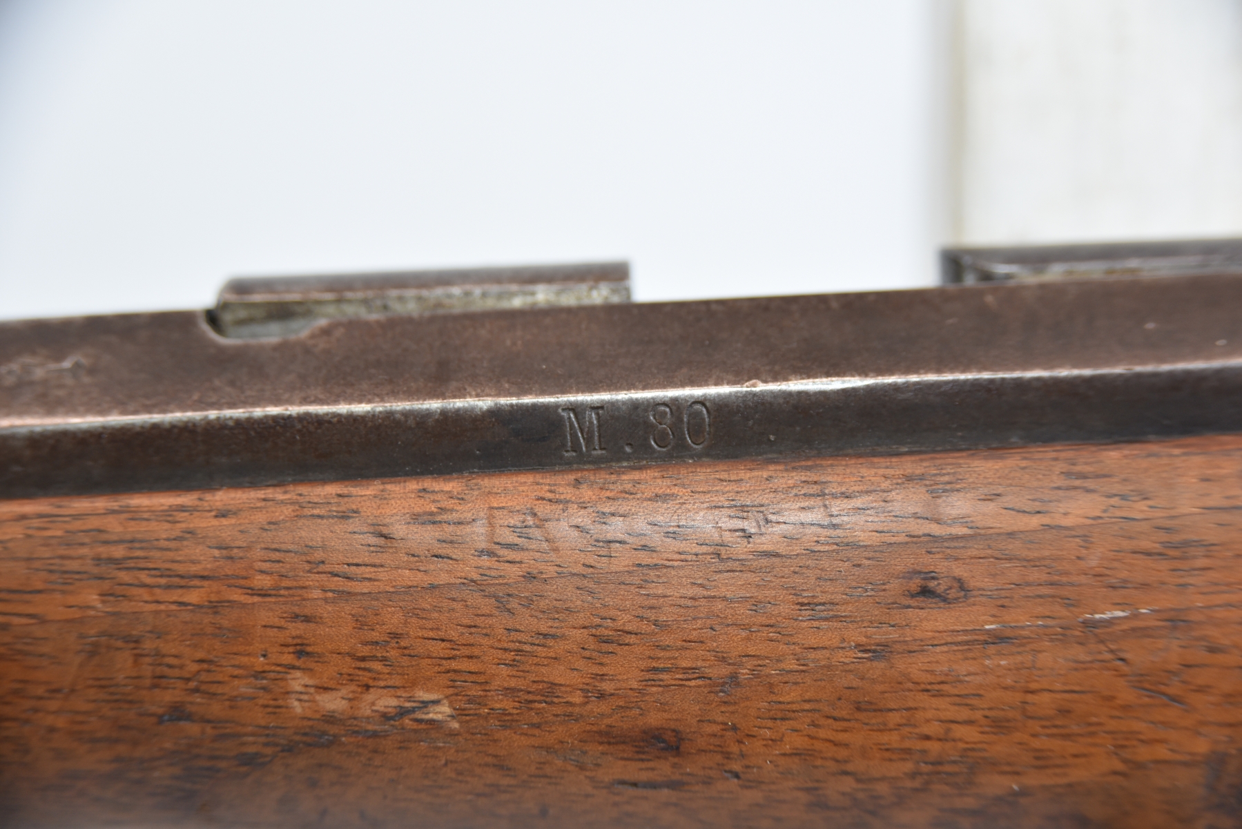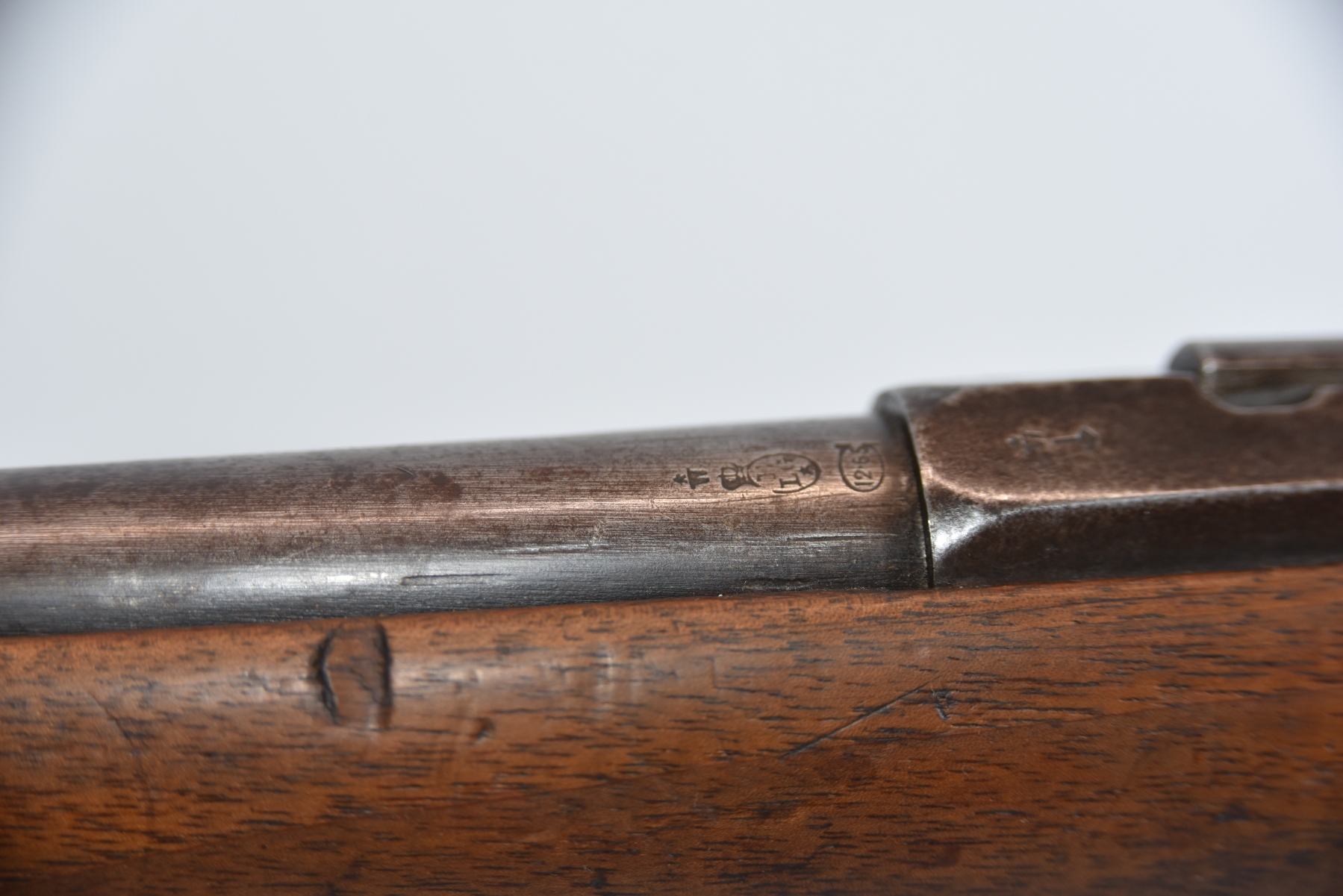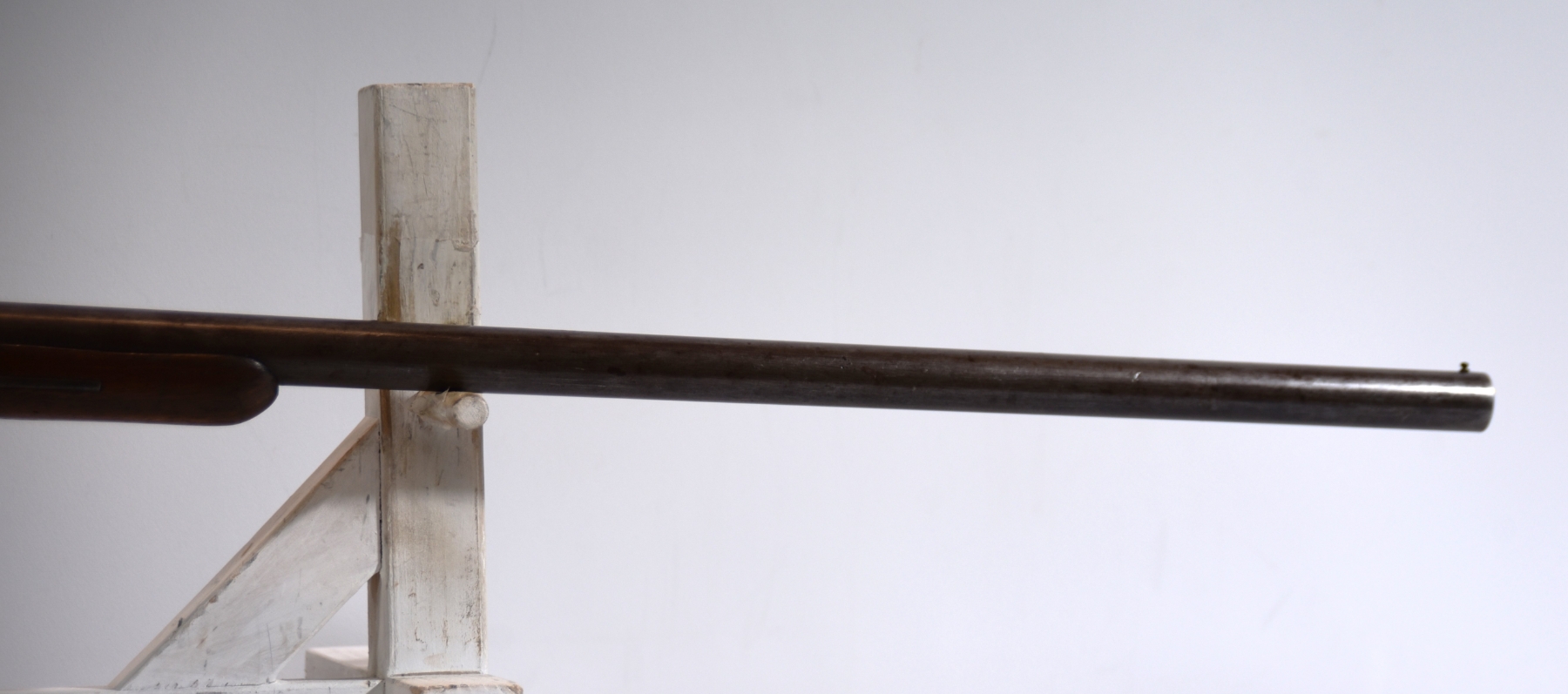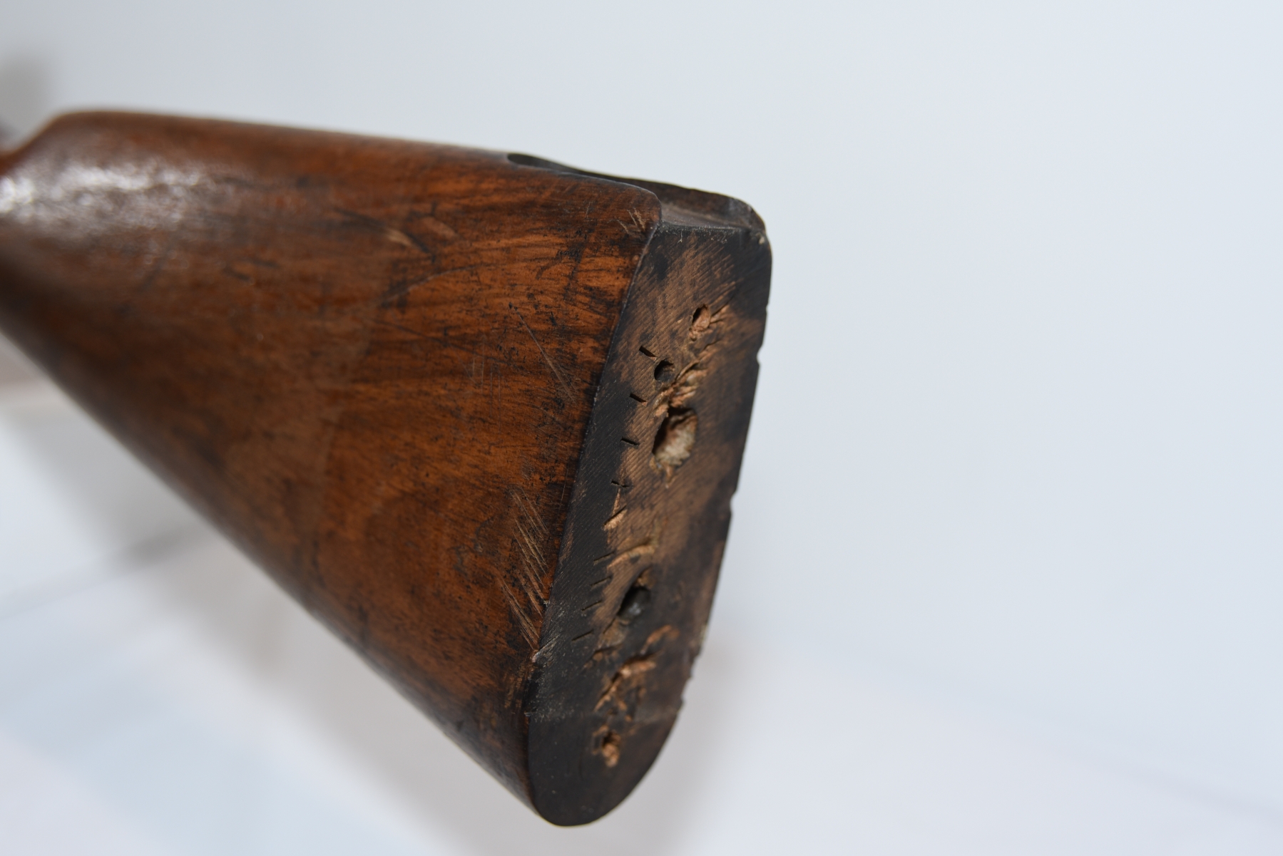 Wood stock shows butt stock is missing, there are scratches, scuffs, dents, finish wear, small chips and cracks; condition is less than fair.