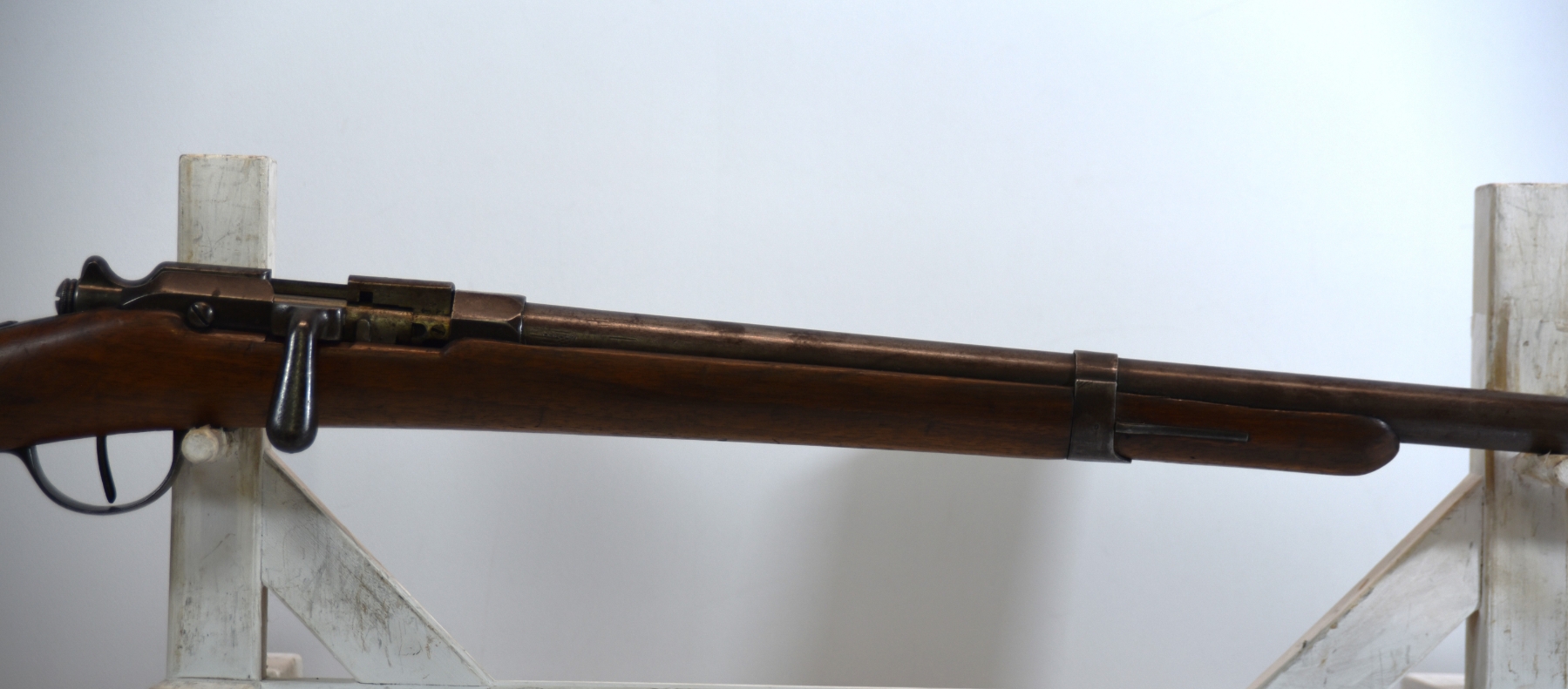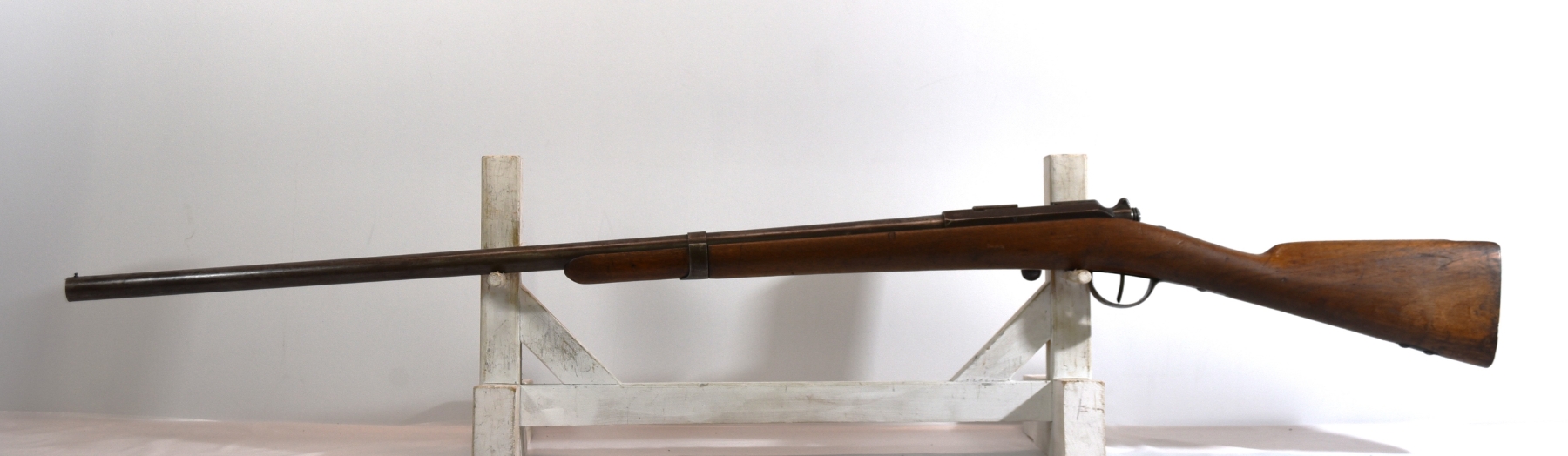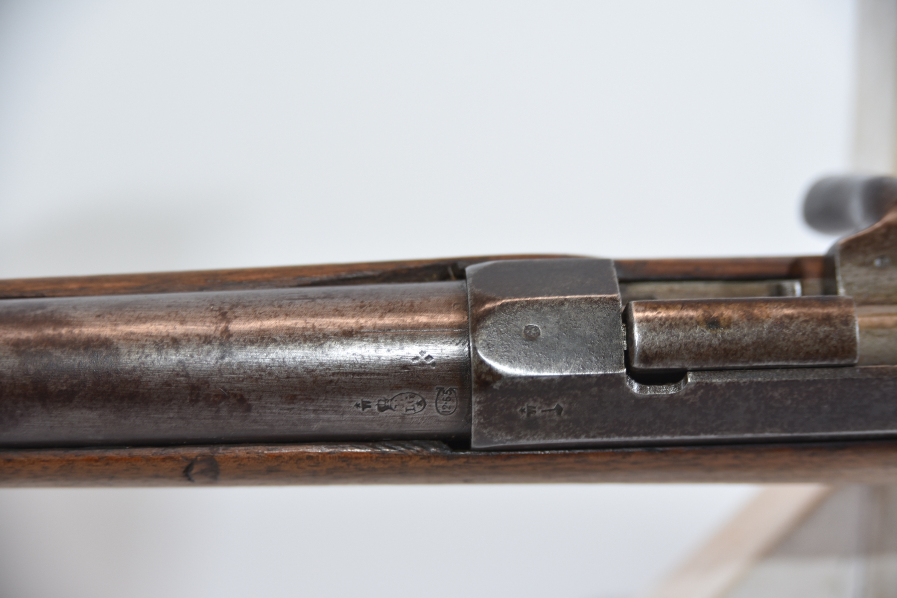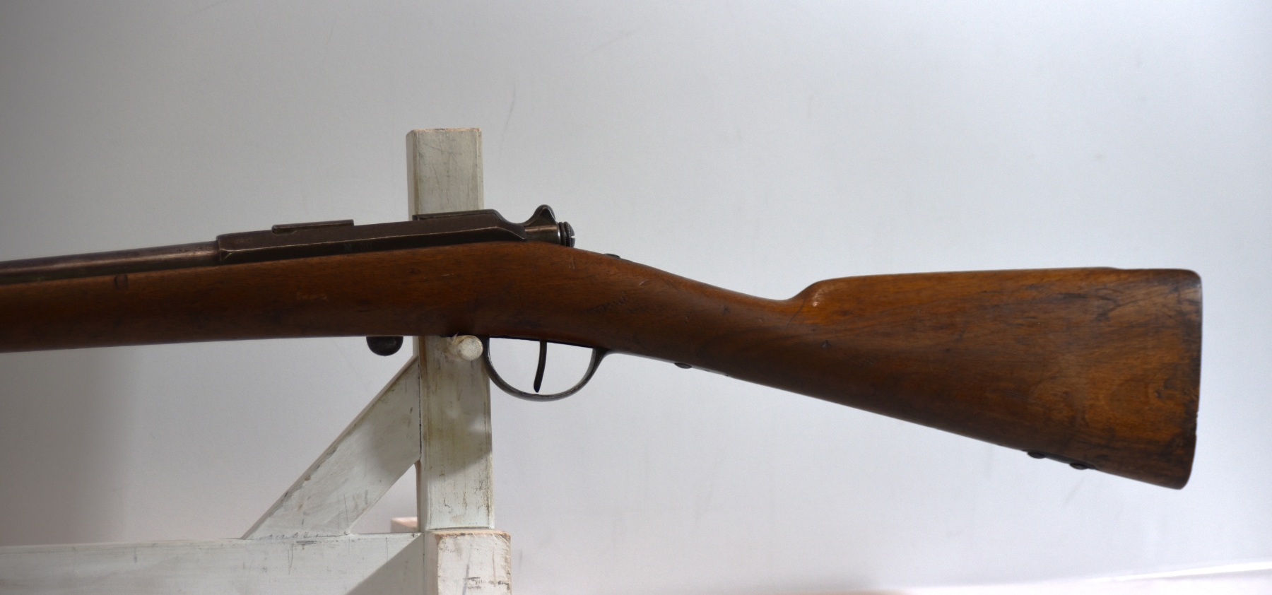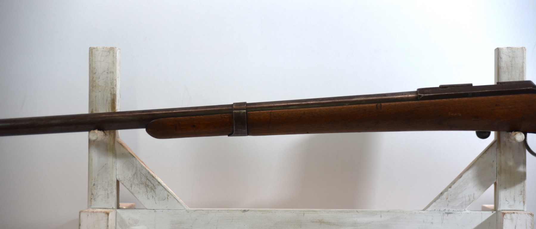 Wood stock shows butt stock is missing, there are scratches, scuffs, dents, finish wear, small chips and cracks; condition is less than fair.