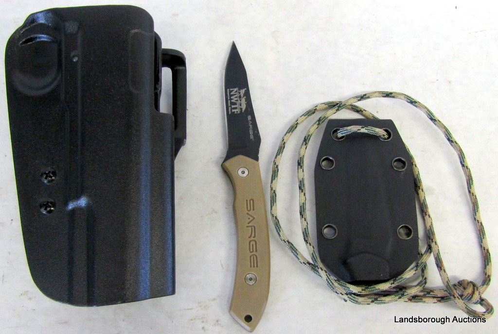 UNCLE MIKES 1911 BELT HOLSTER, SARGE NWTF SPUR KNIFE, BROWNING SCOPED RIFLE CASE.