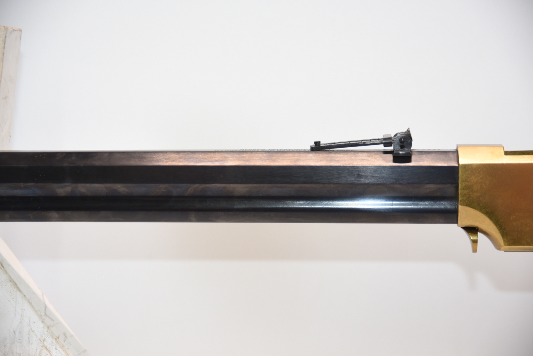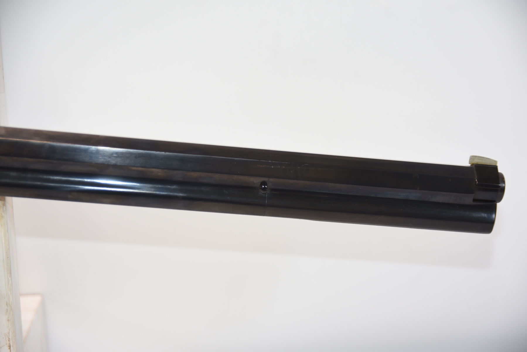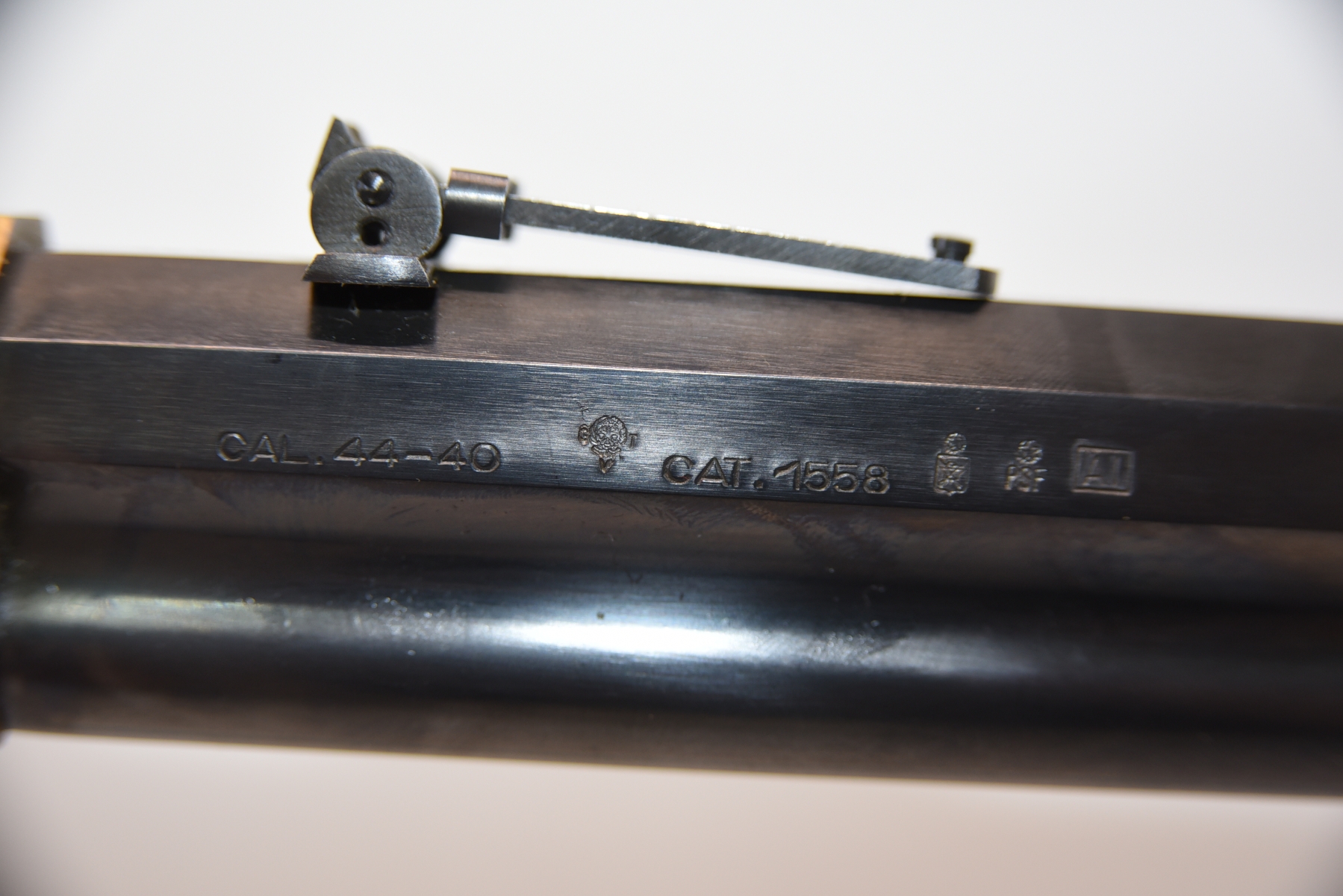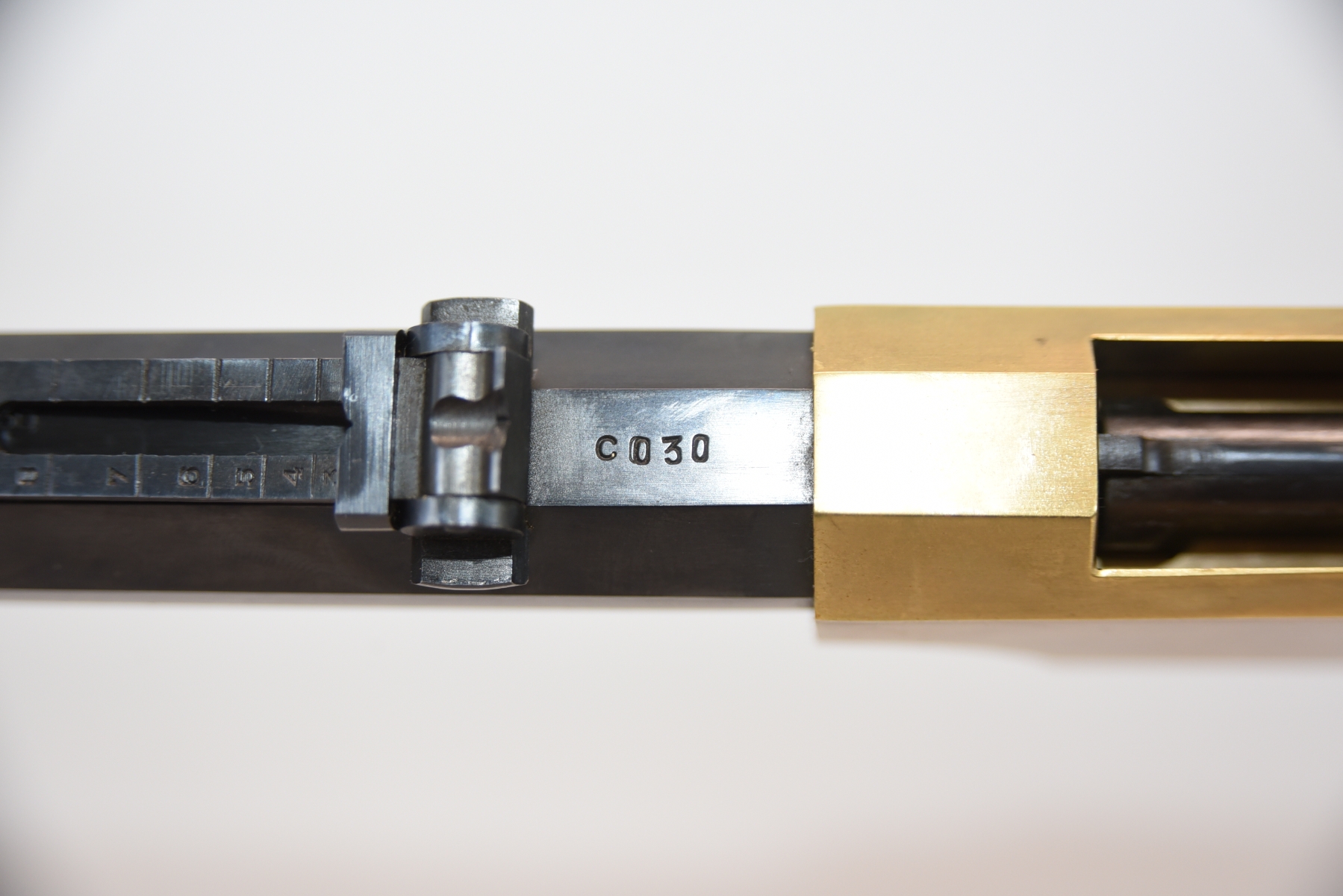 The wooden stock has some scratching on both sides as well as the top and the underneath. The golden receiver has scratching on both sides as well. The bluing is shiny with minimal scratching on the left hand side, the right hand side appears to have more scratching than the left hand side. There is a front sight and a sight elevator. The bore is shiny with apparent rifling, in excellent condition.