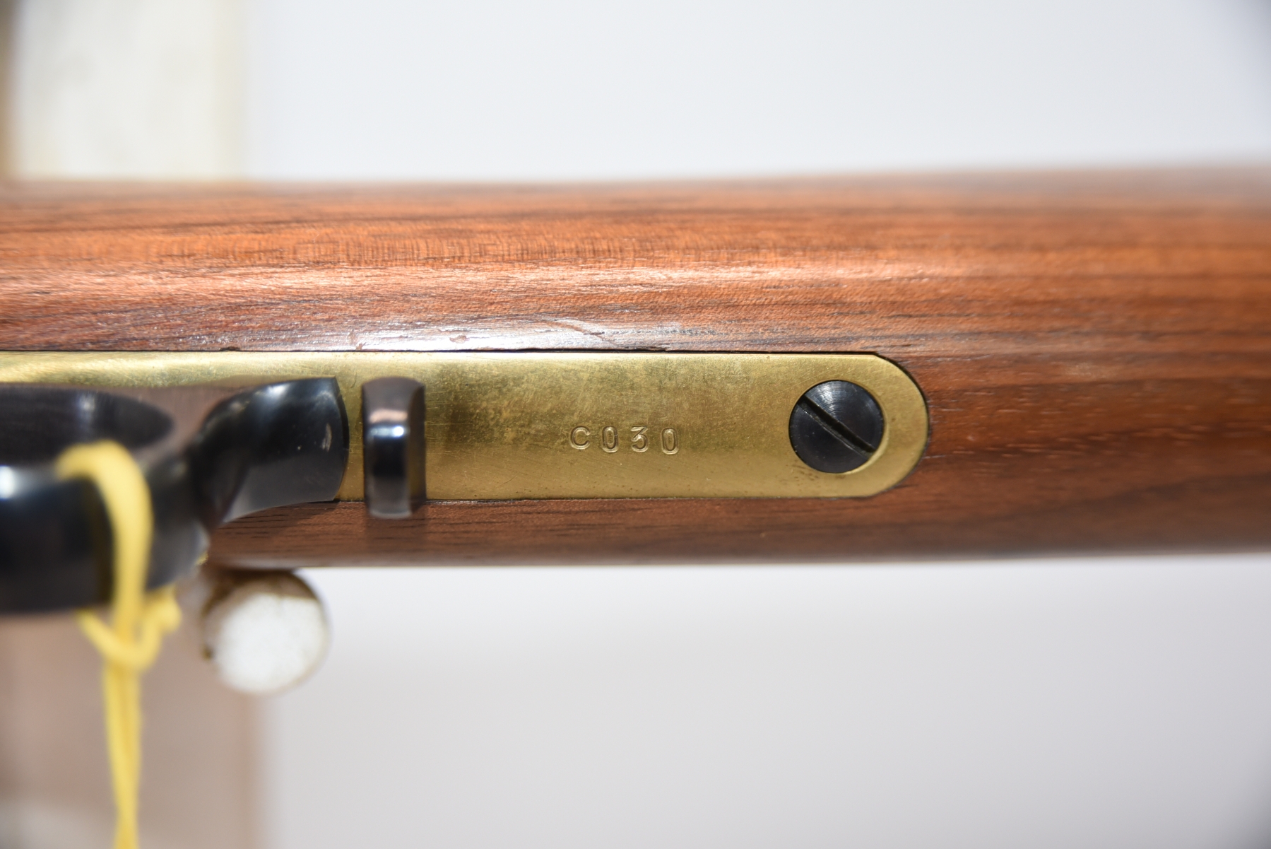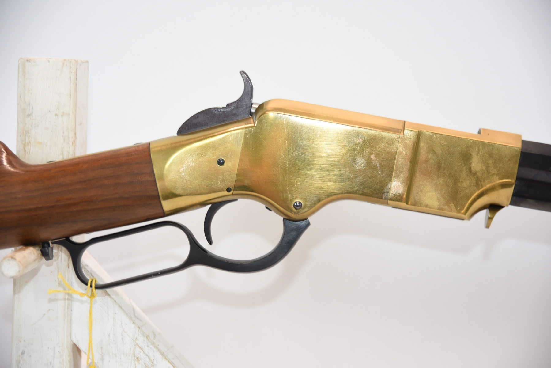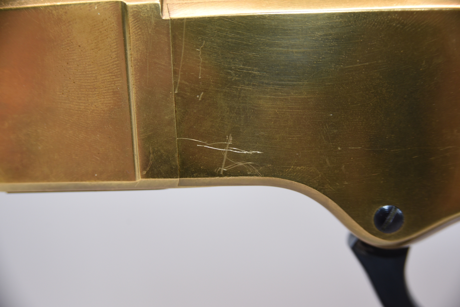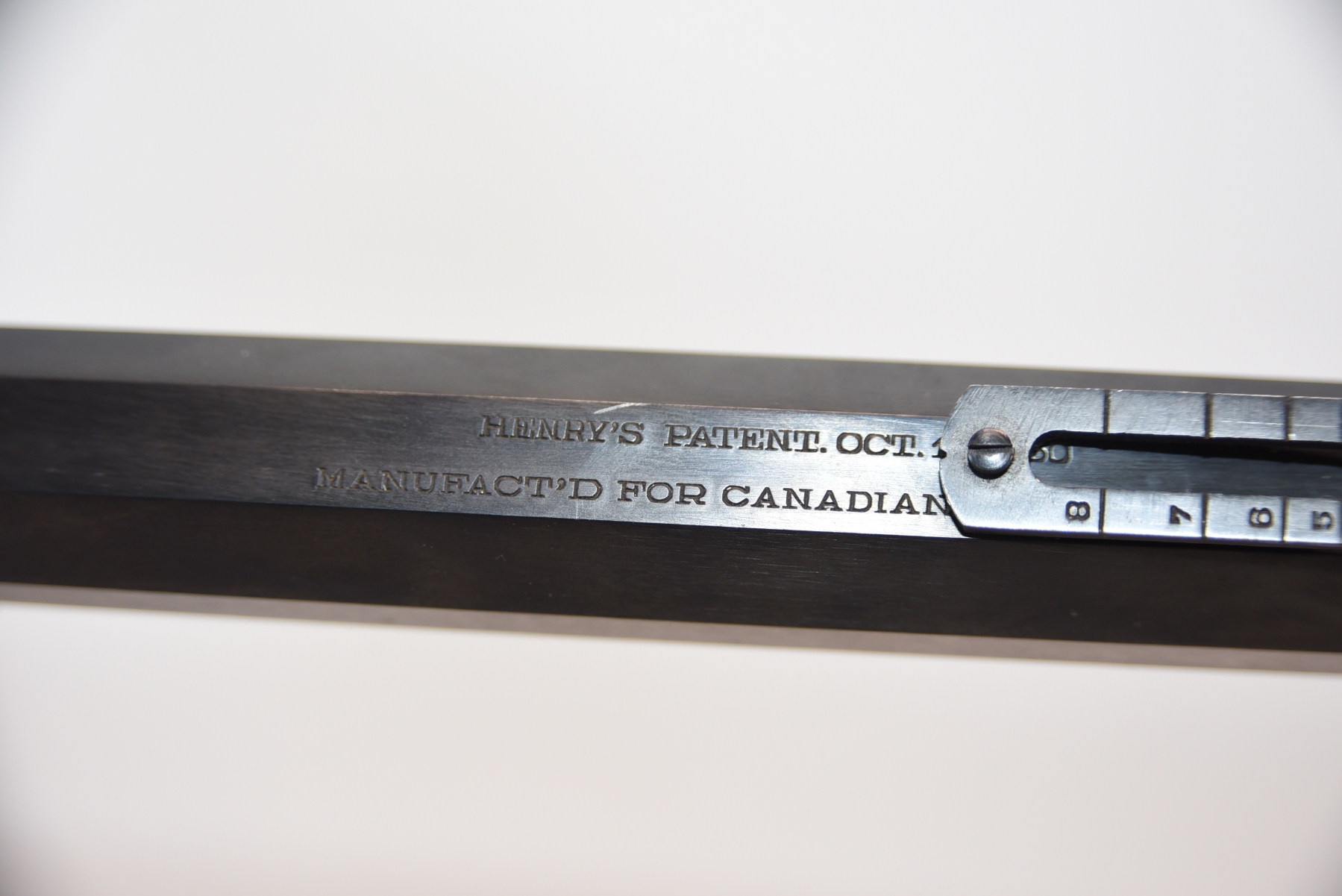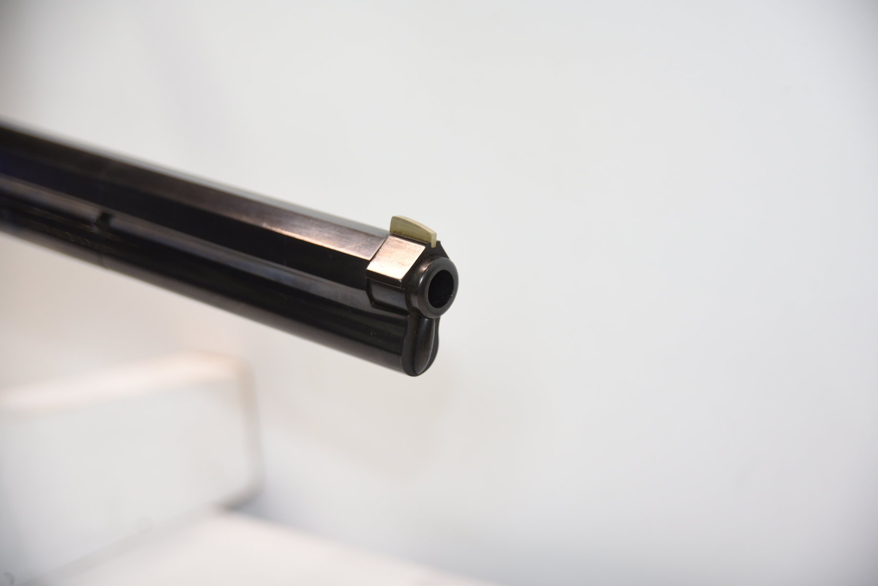The wooden stock has some scratching on both sides as well as the top and the underneath. The golden receiver has scratching on both sides as well. The bluing is shiny with minimal scratching on the left hand side, the right hand side appears to have more scratching than the left hand side. There is a front sight and a sight elevator. The bore is shiny with apparent rifling, in excellent condition.