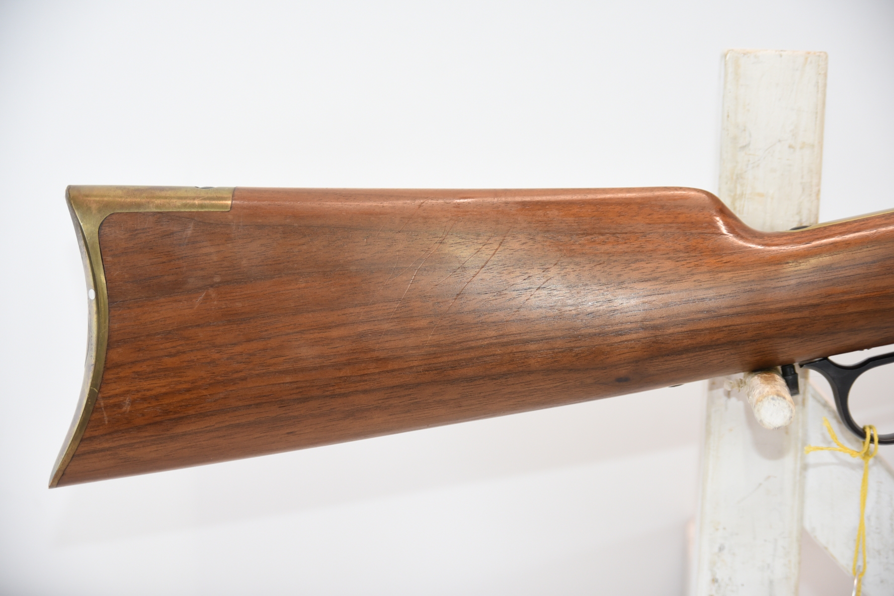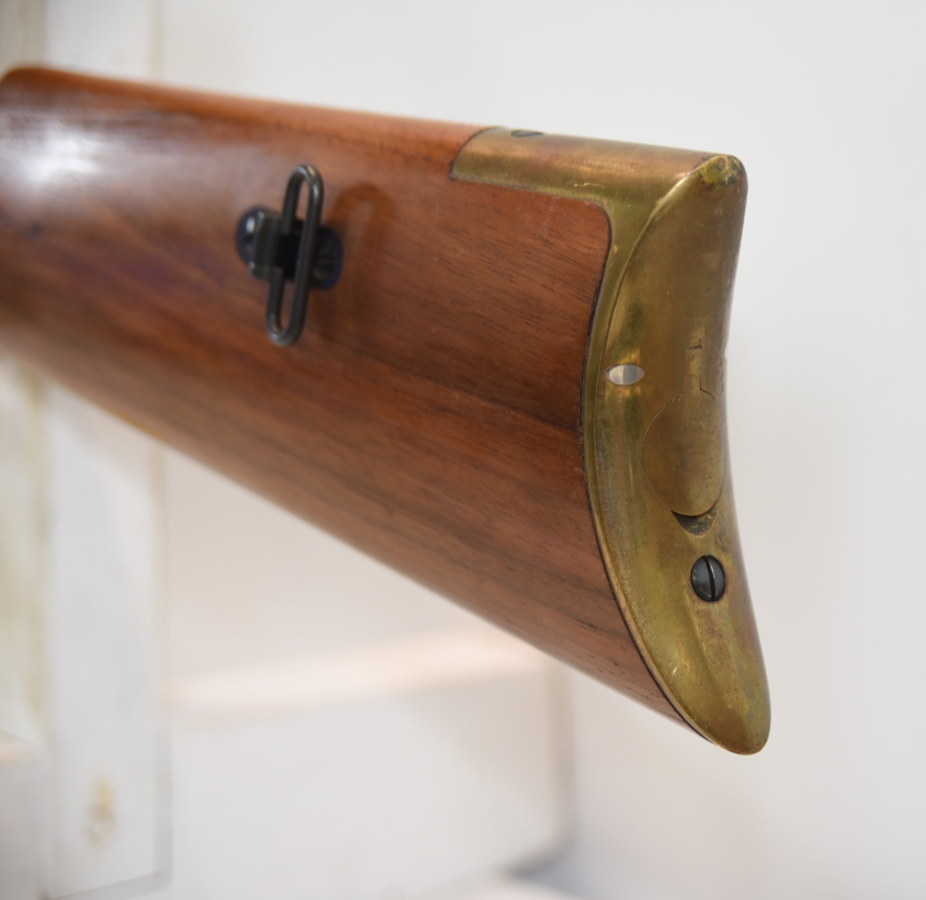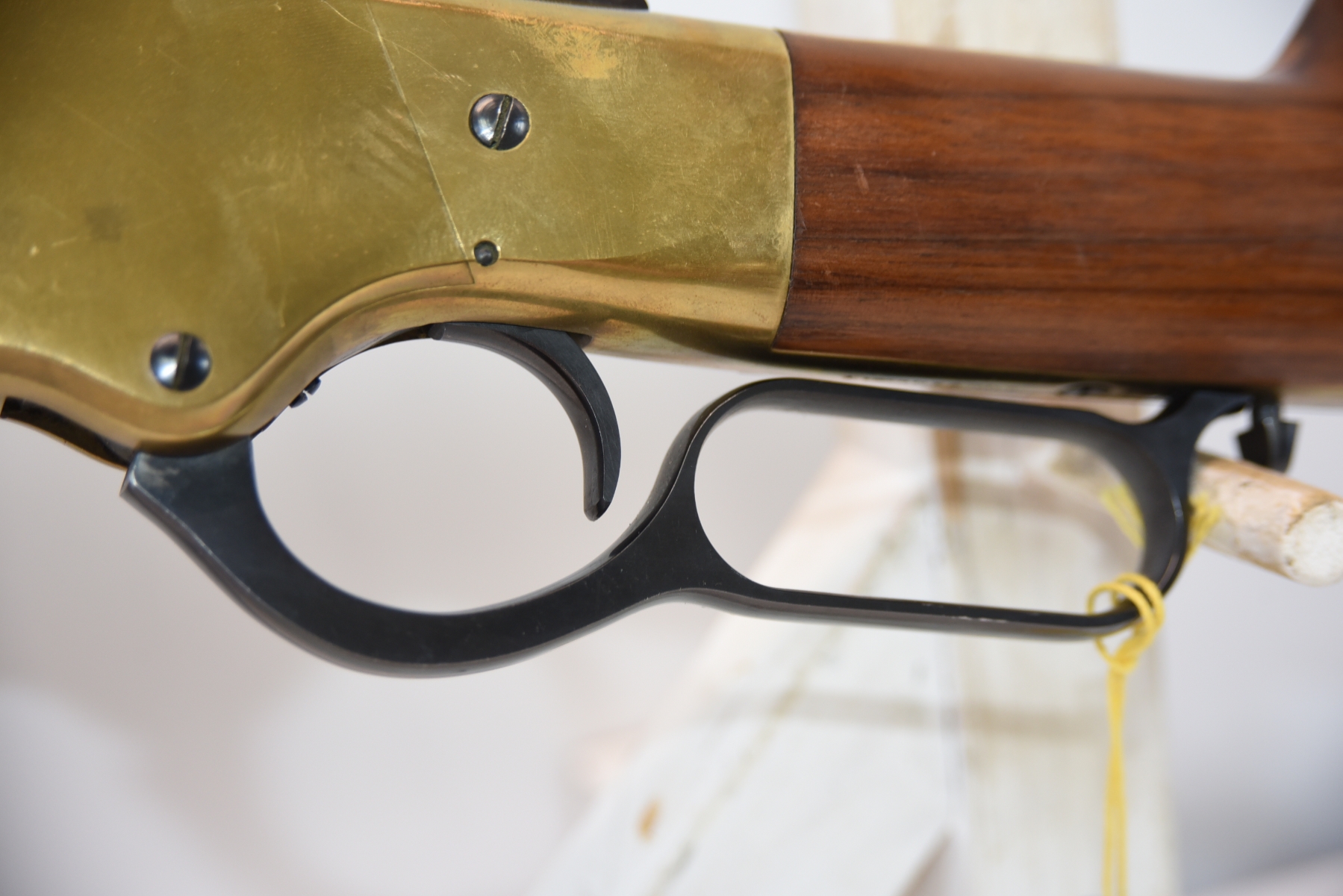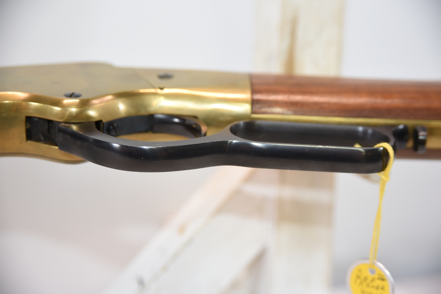 The wooden stock has some scratching on both sides as well as the top and the underneath. The golden receiver has scratching on both sides as well. The bluing is shiny with minimal scratching on the left hand side, the right hand side appears to have more scratching than the left hand side. There is a front sight and a sight elevator. The bore is shiny with apparent rifling, in excellent condition.