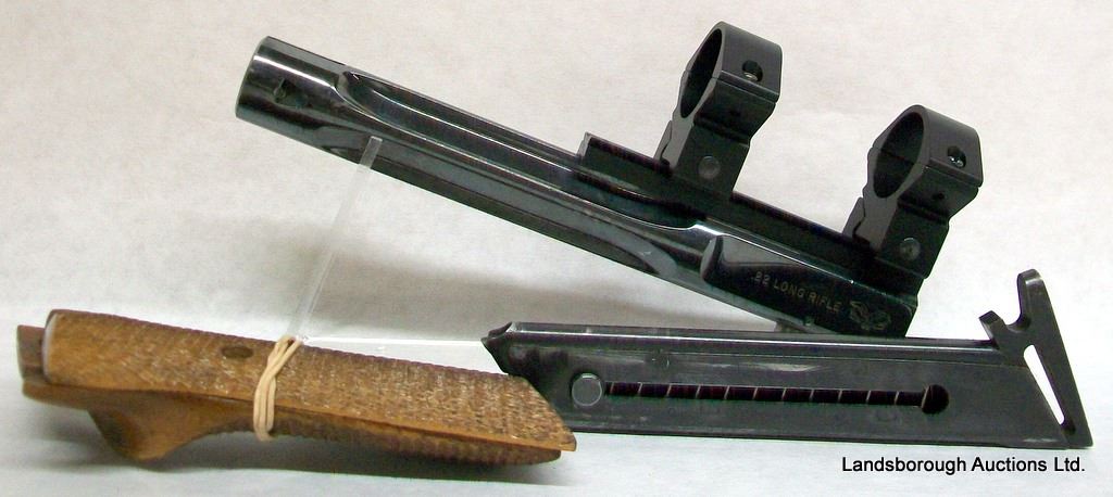 Restricted, semi auto, 22LR, 184mm barrel, SN ML13964. Custom grips very good, bluing has some marks, bore excellent. Comes with extra barrel and rings, grips, mag.