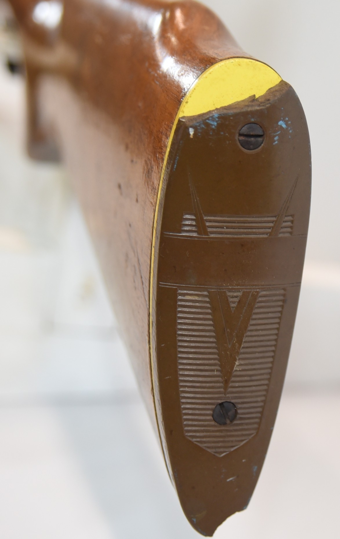 Wood stock shows butt plate is broken on top and bottom. There are scratches, scuffs, dents, finish wear areas; condition is fair.