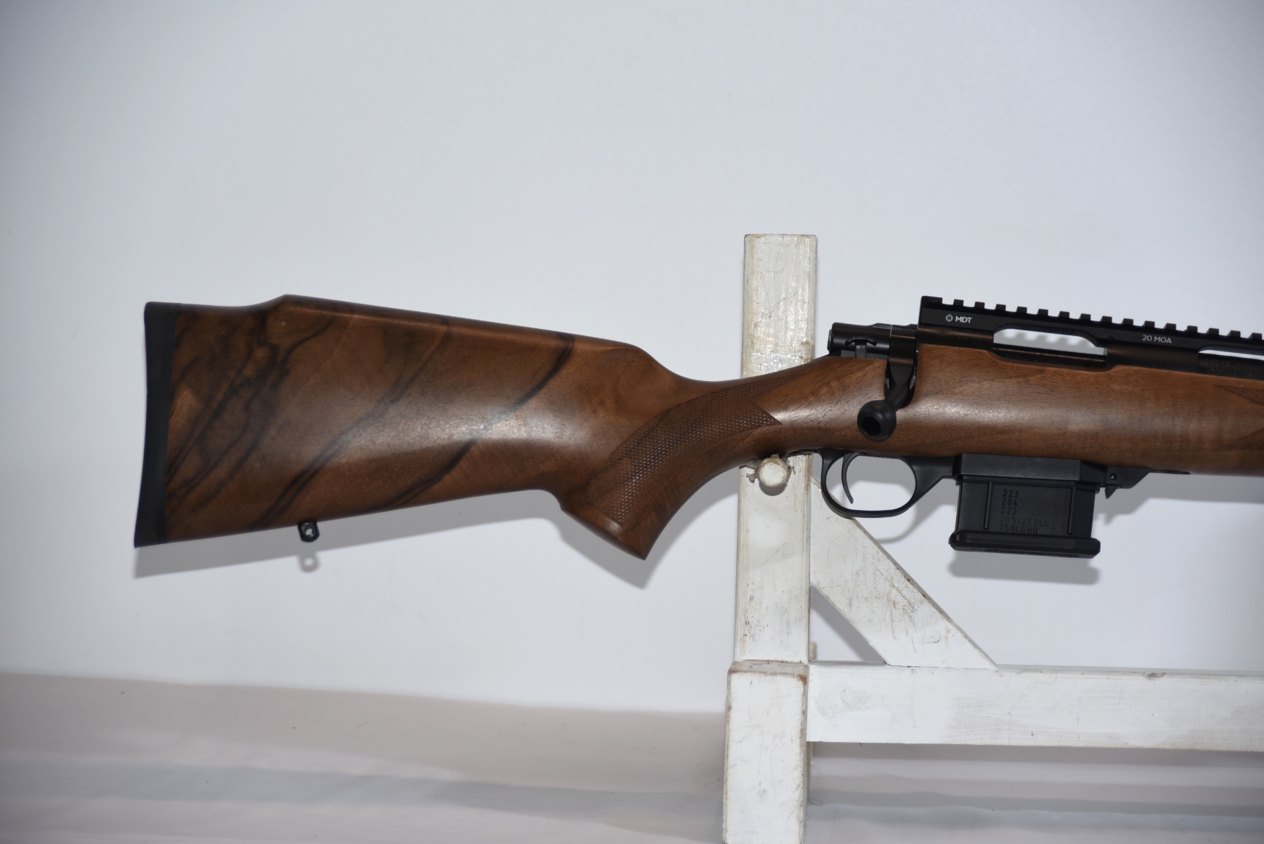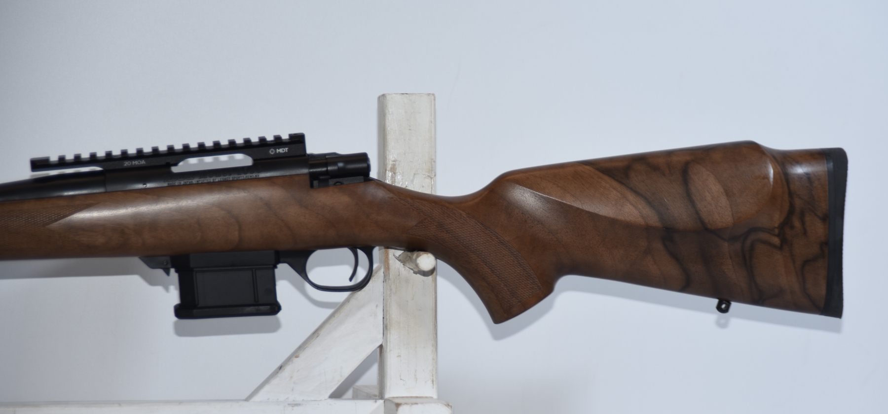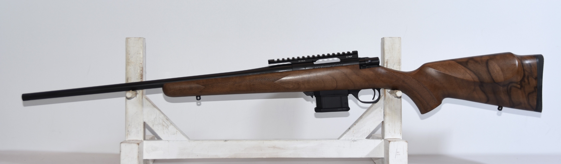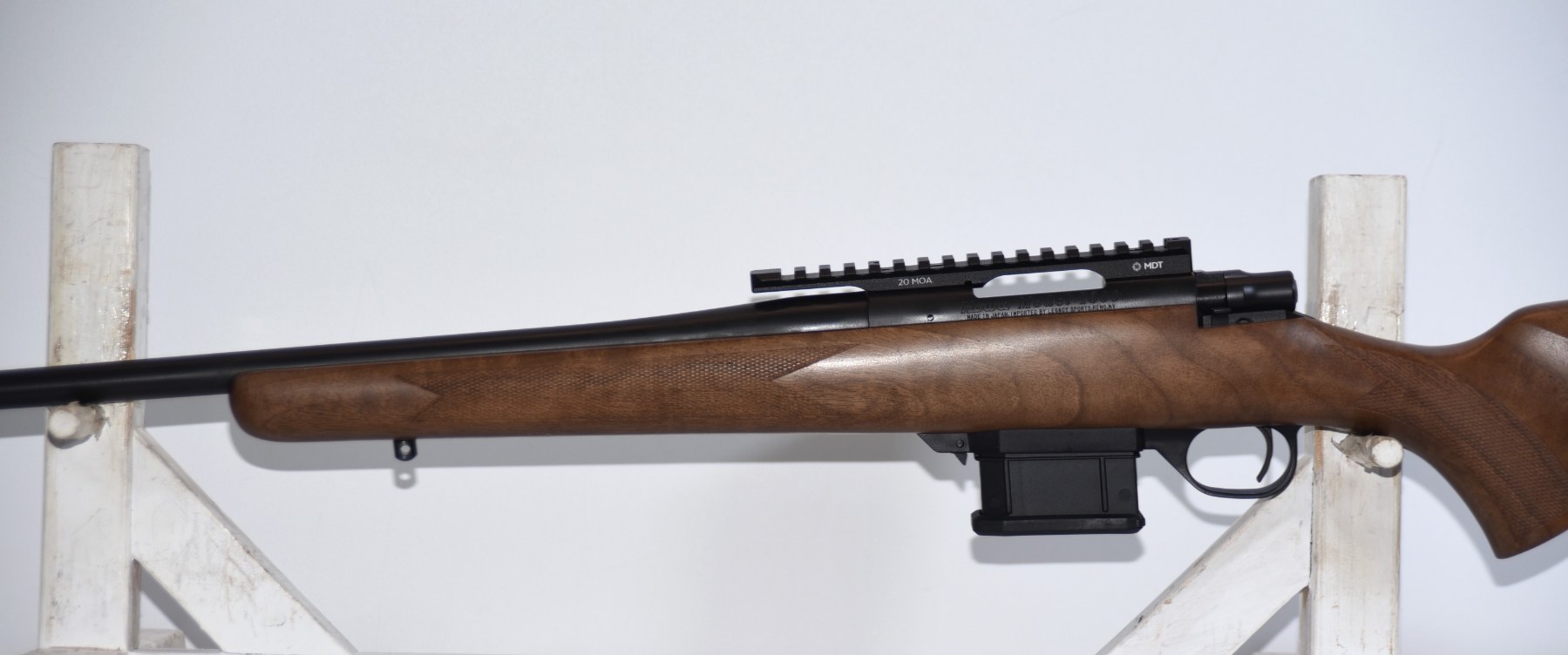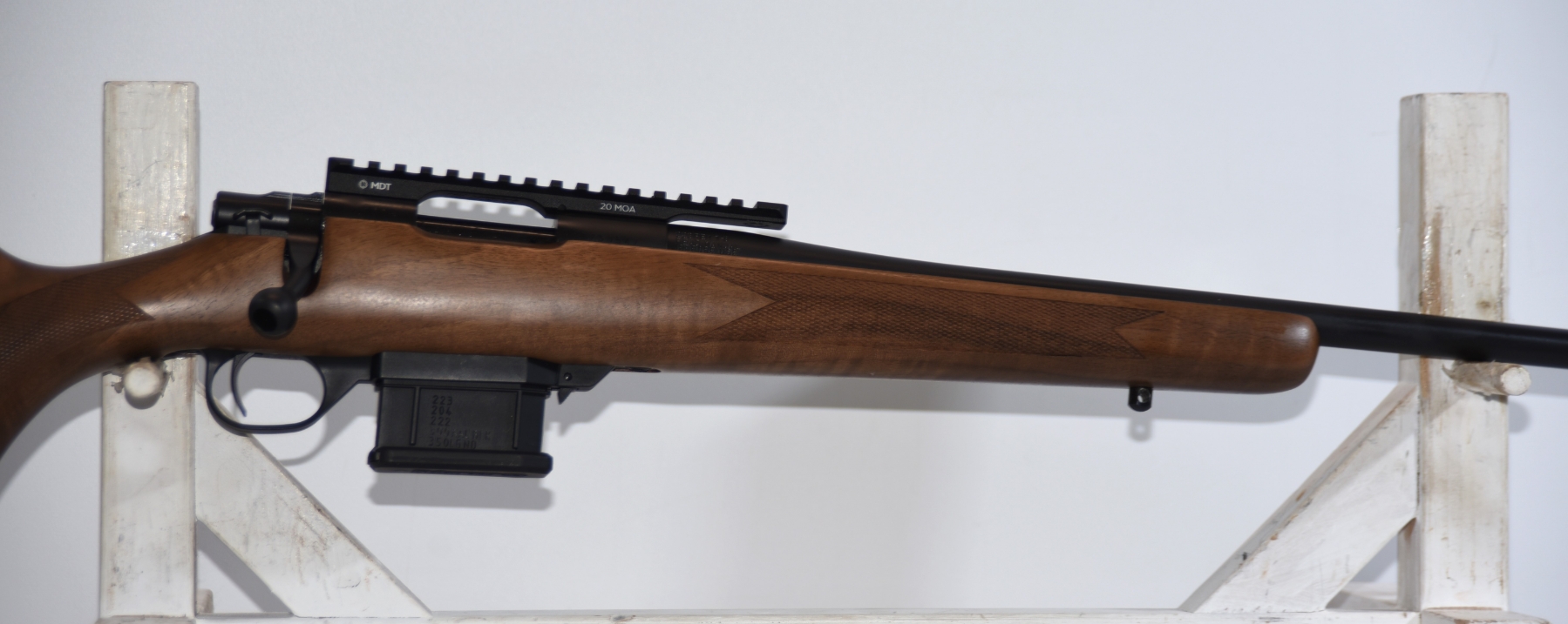 Firearm comes with 2 magazines total, has a MDT Picatinny scope base rail, Box.