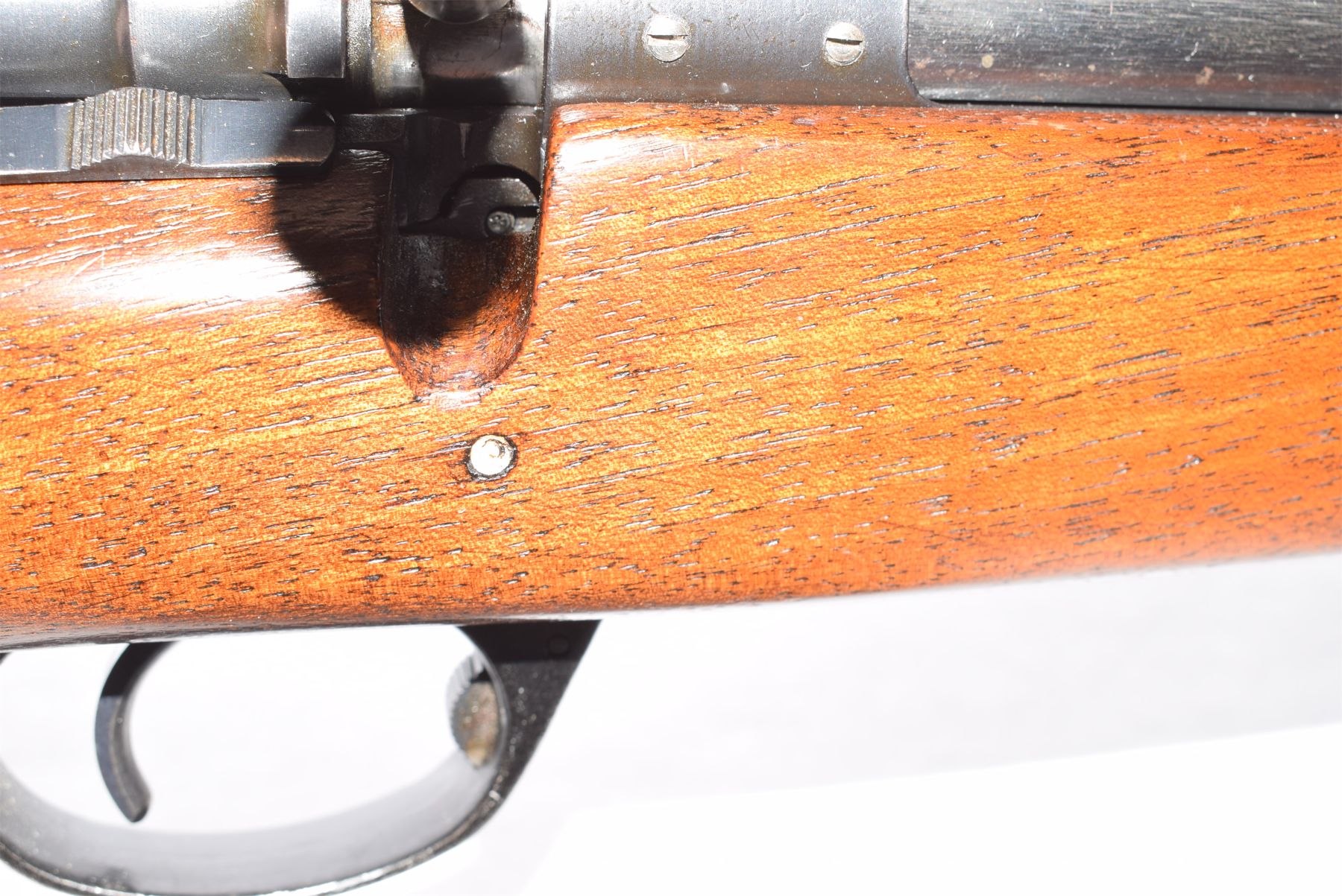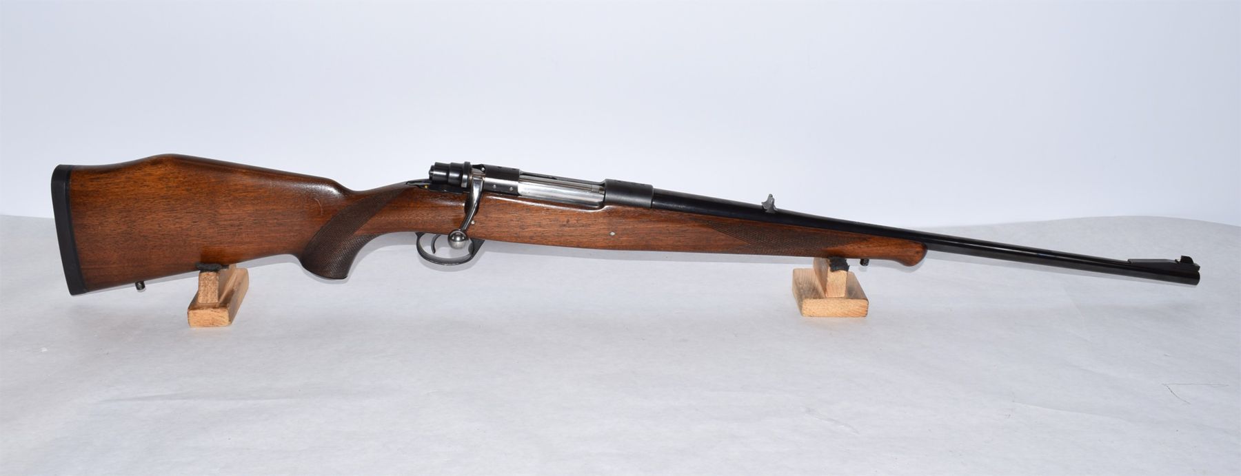 Wood has a few scratches and dents. Condition is very good. Bluing has scratches and scuffs. Condition is very good. Bore is excellent. Front sight hood is missing.