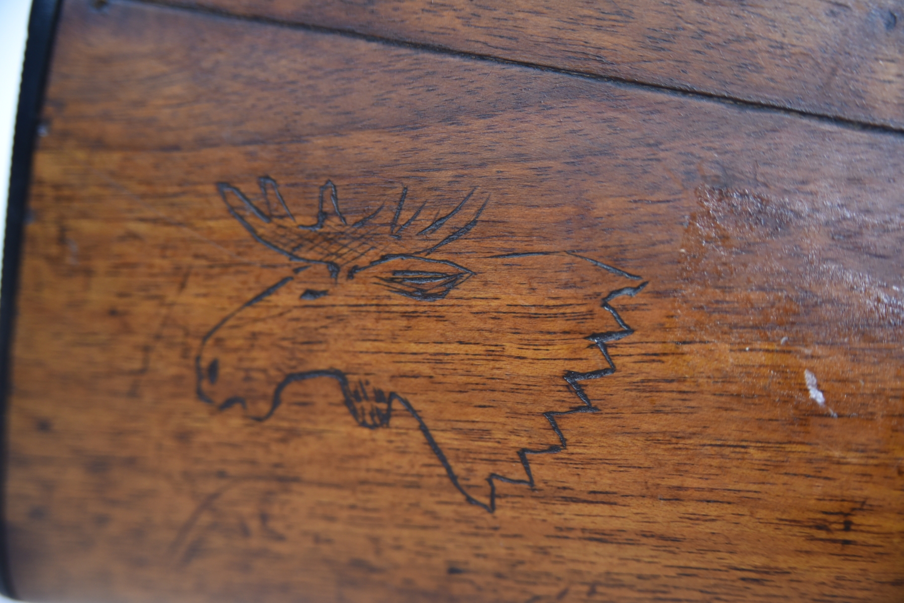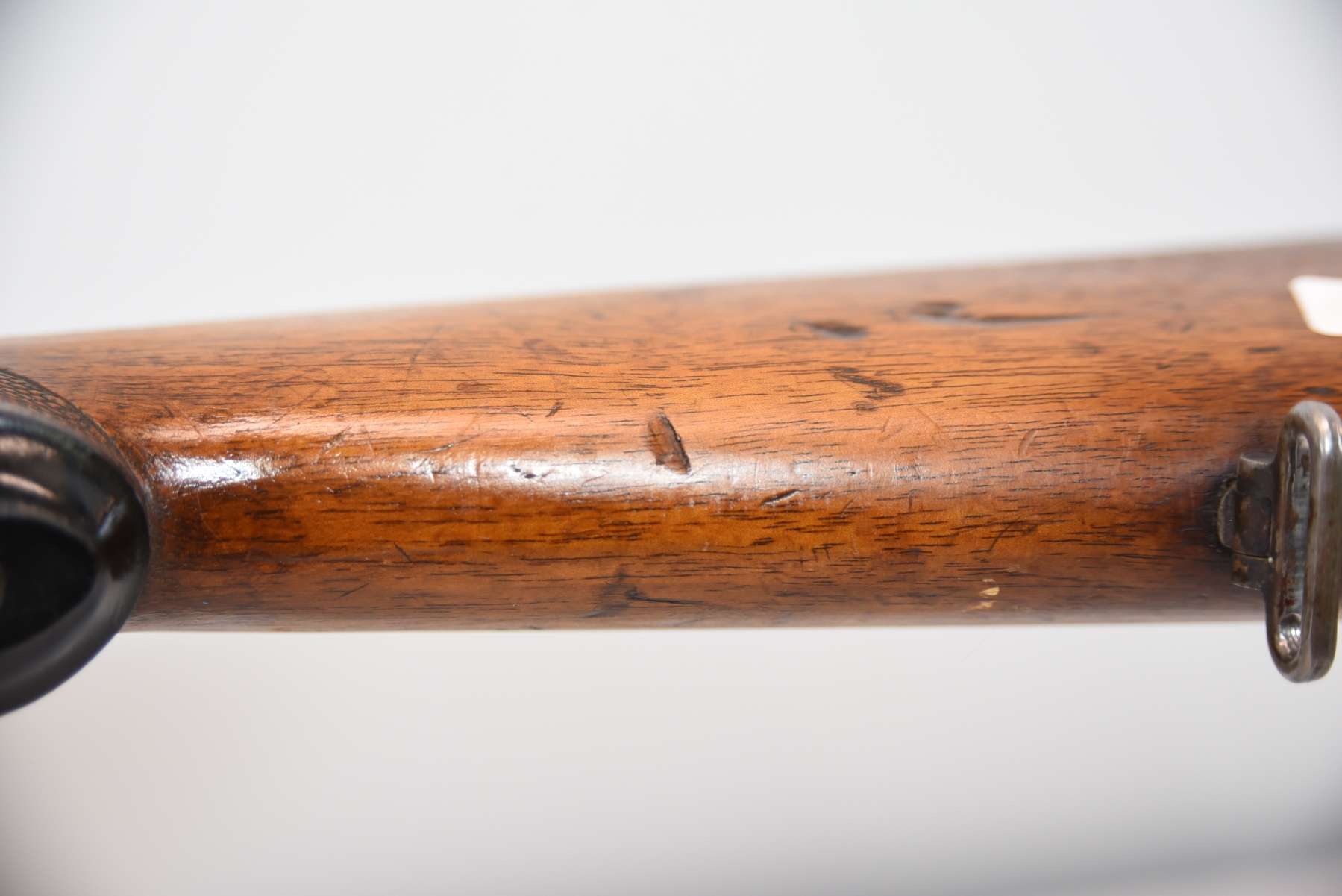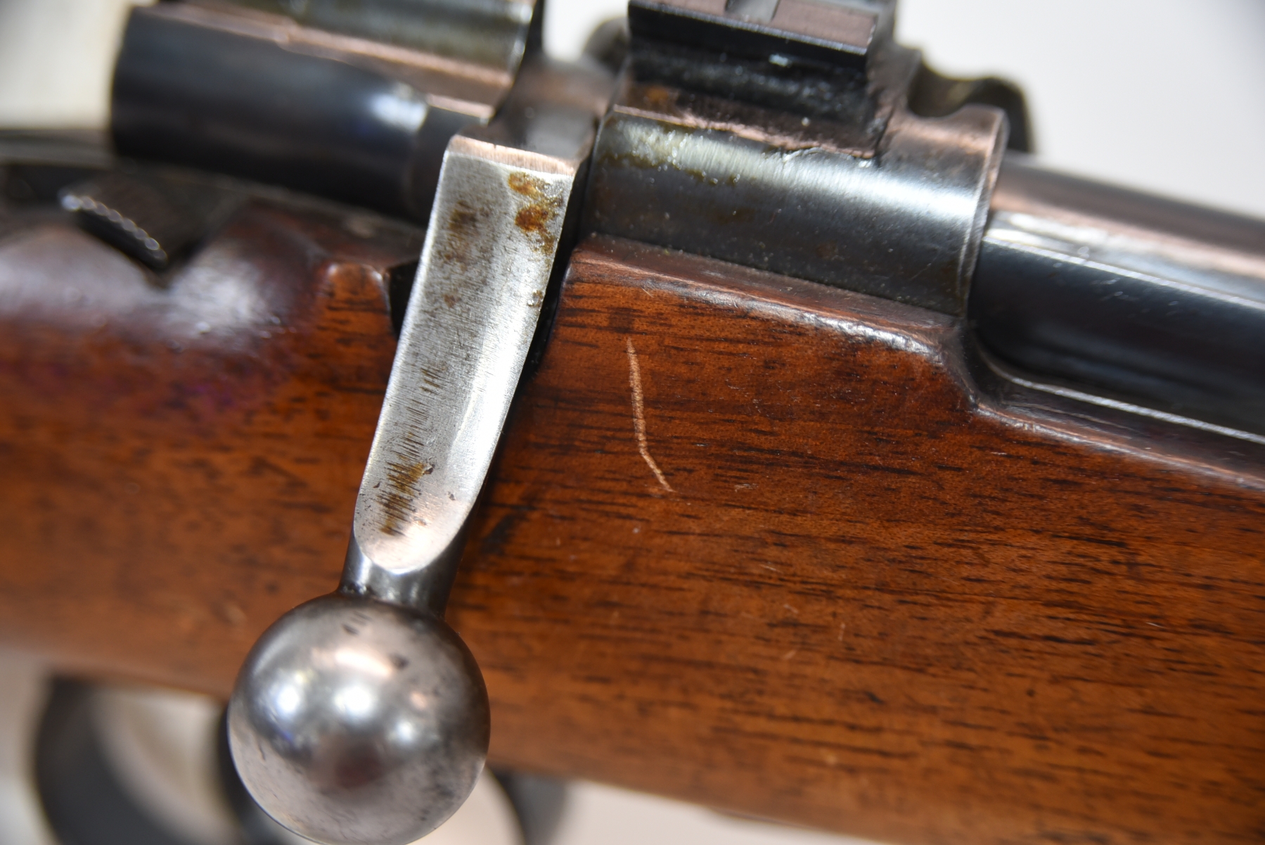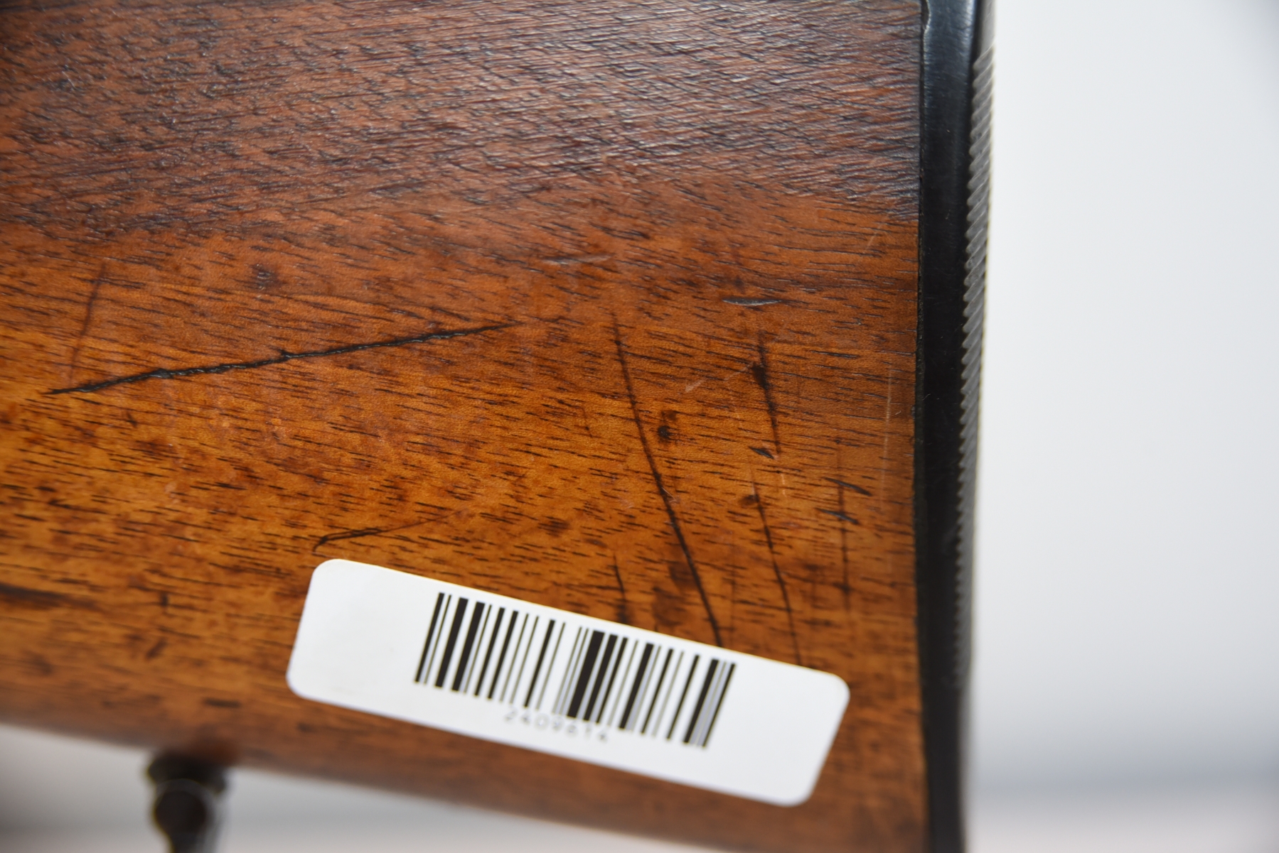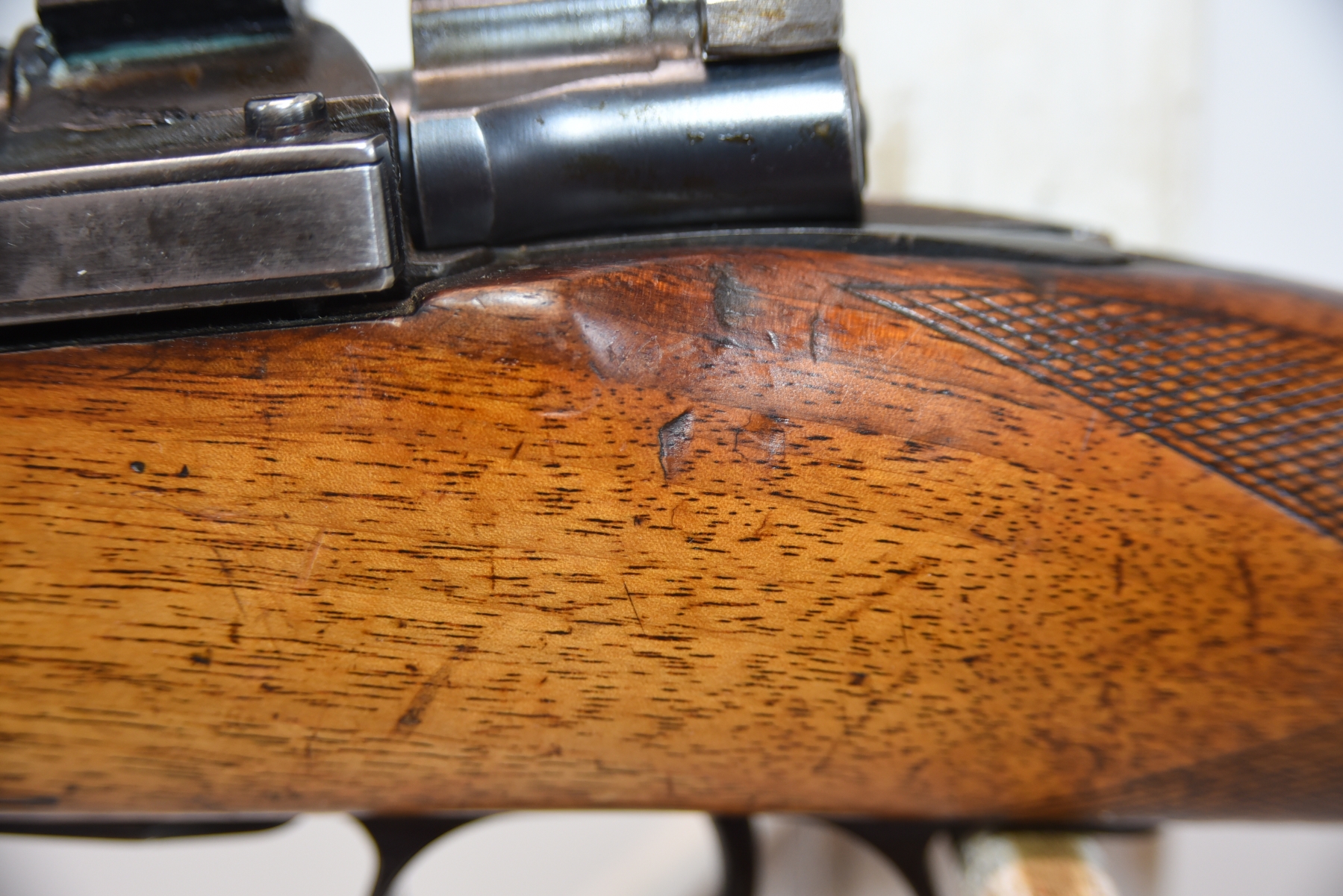 Wood stock shows a added cheek piece, there are scratches, scuffs, there are two cracks in the upper tang, a chip by rear of trigger guard, dents; condition is fair. firearm sits loose in the stock and there is a screw missing in the upper tang. Condition is fair.