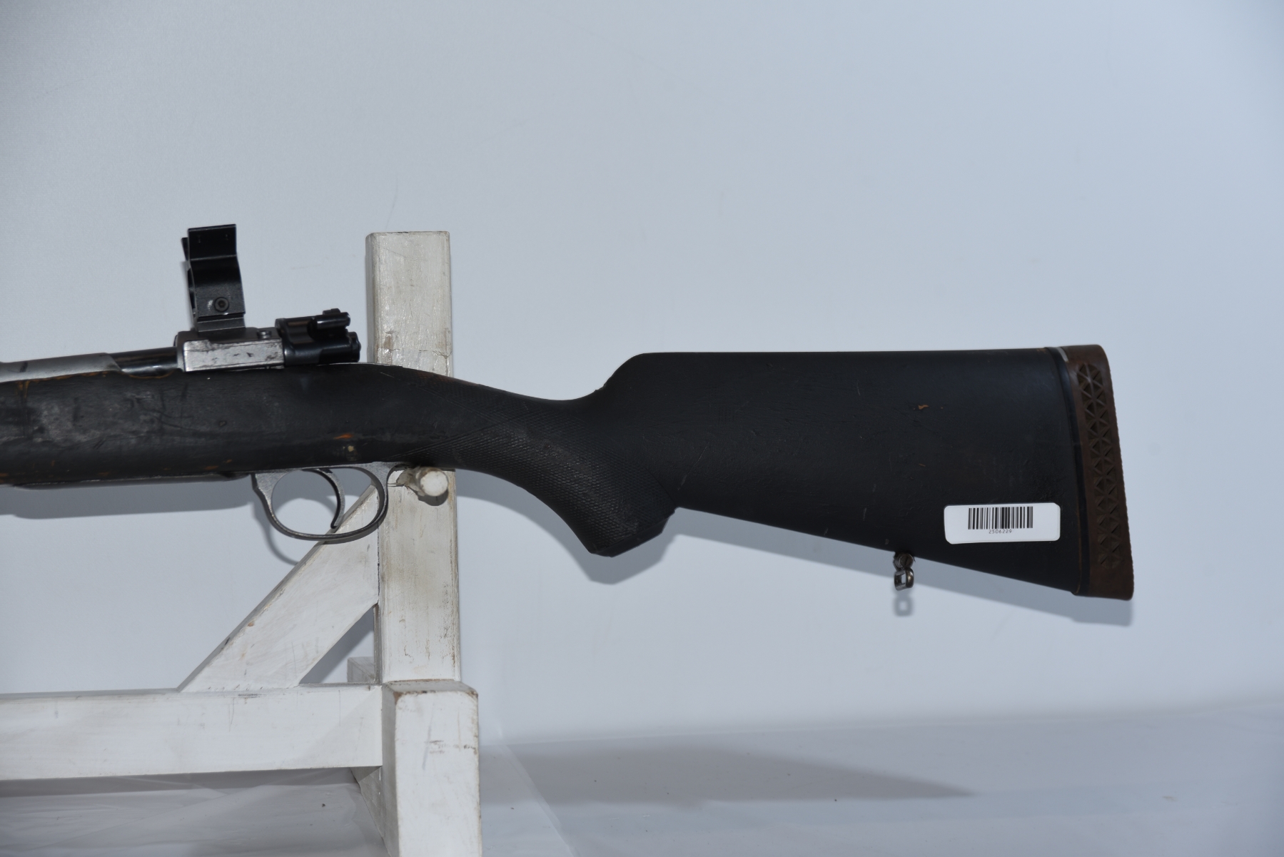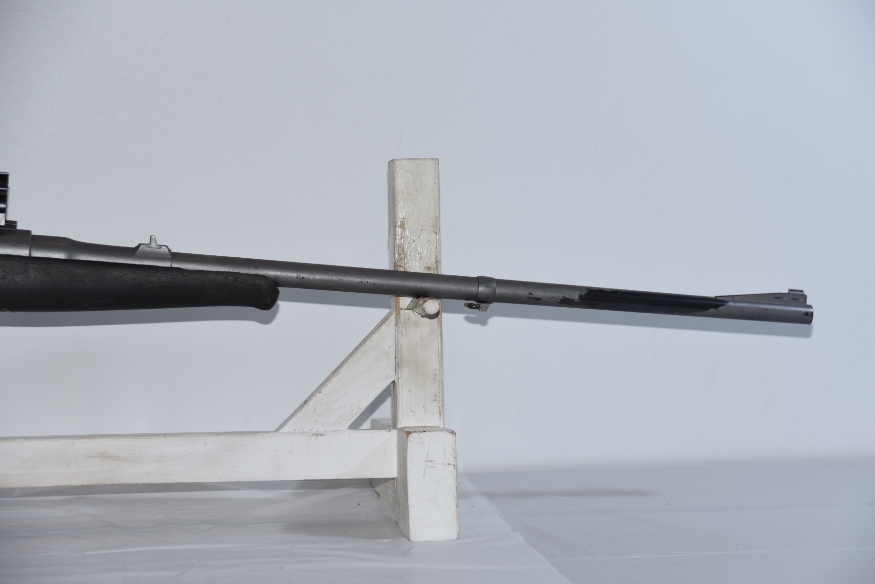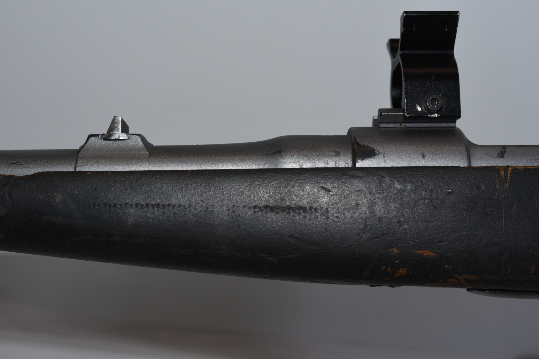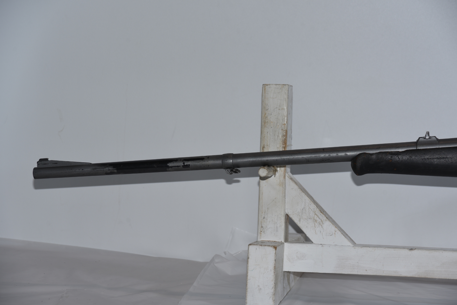 Wood stock shows scratches, scuffs, dents, chips, modification to the forearm, stock is painted showing finish wear; condition is less than fair.