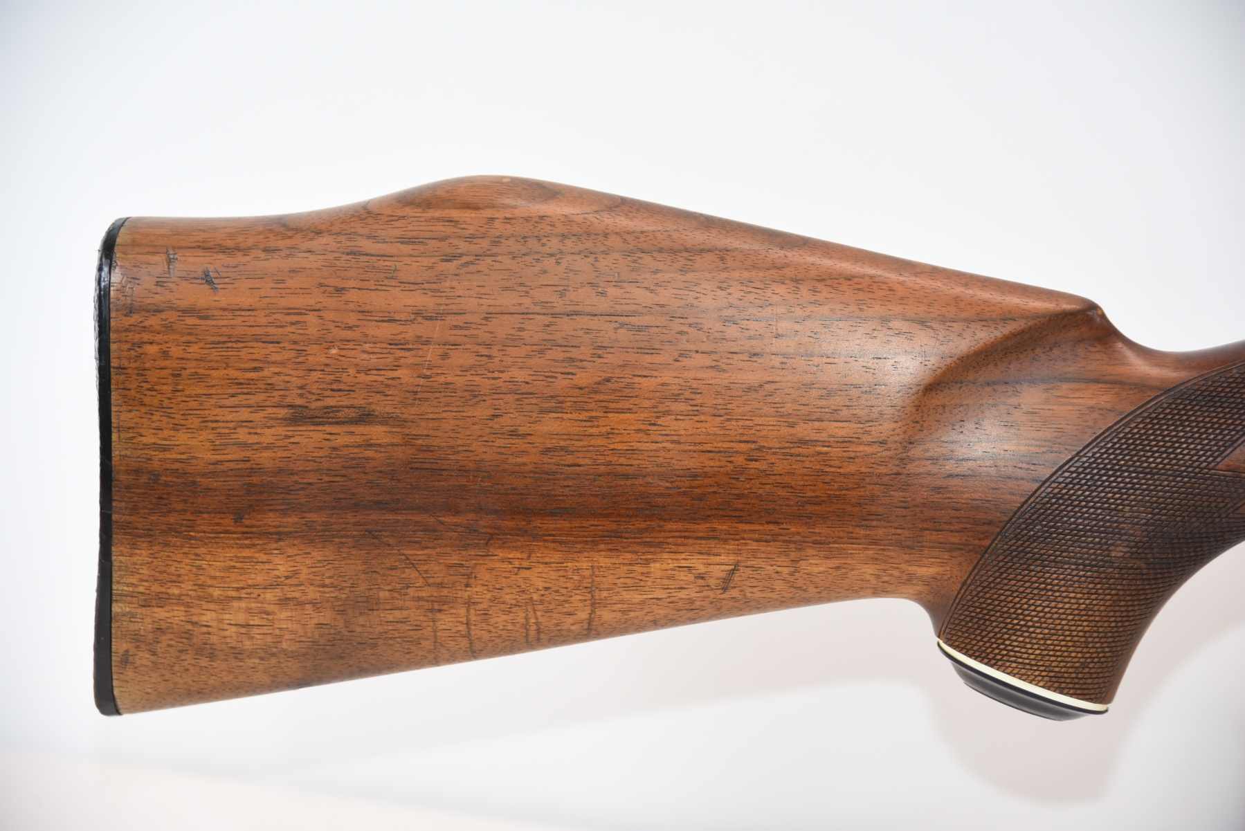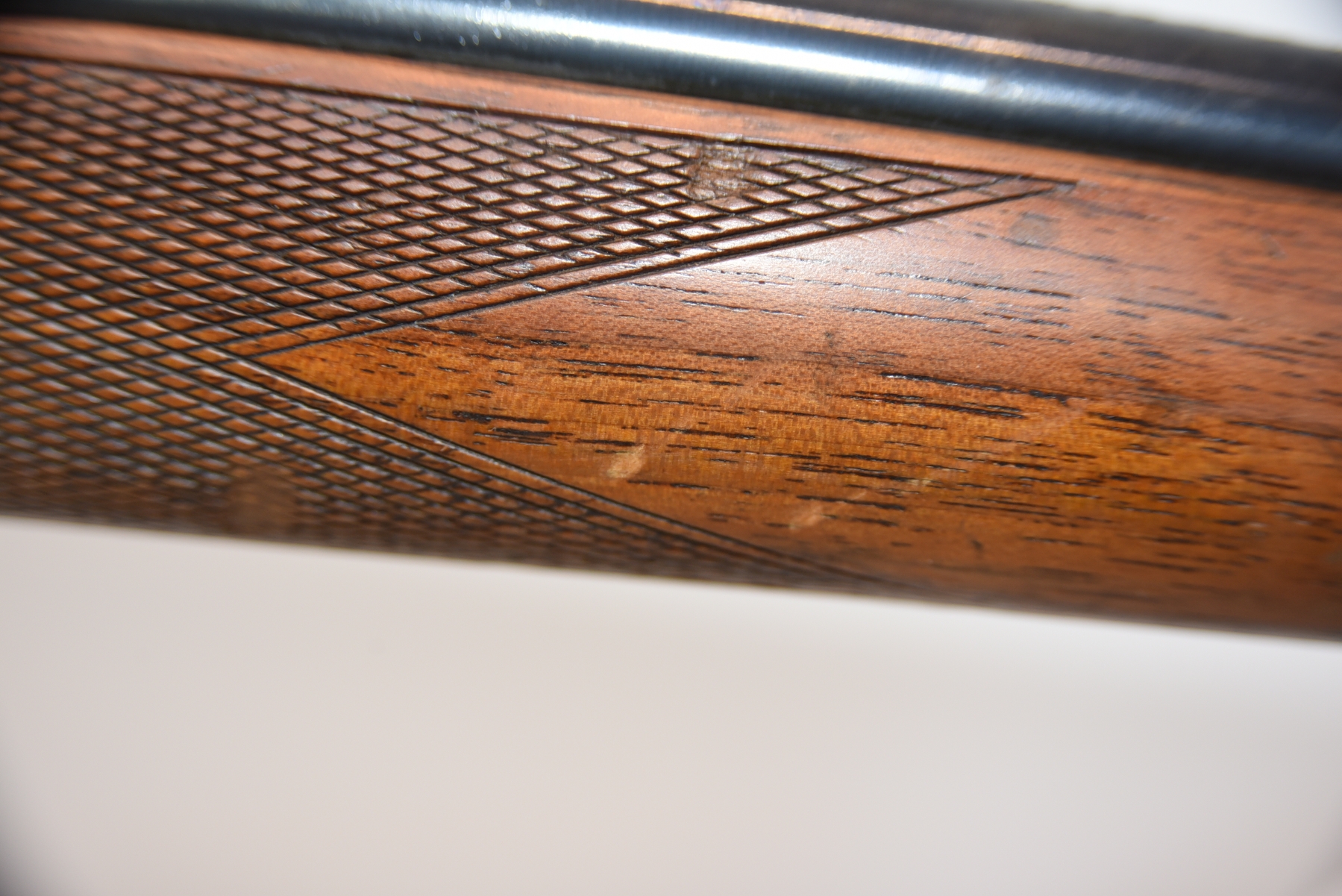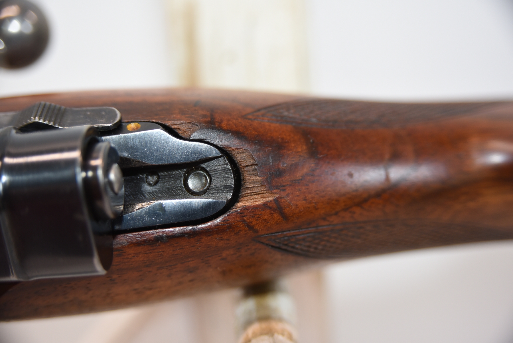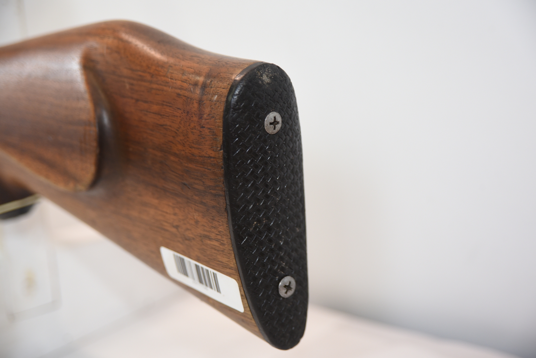 Wood stock shows sling mount holes, there are small chips in the upper tang, there are some scratches, missing the white gasket in the forearm, scuffs and dents; condition is good.