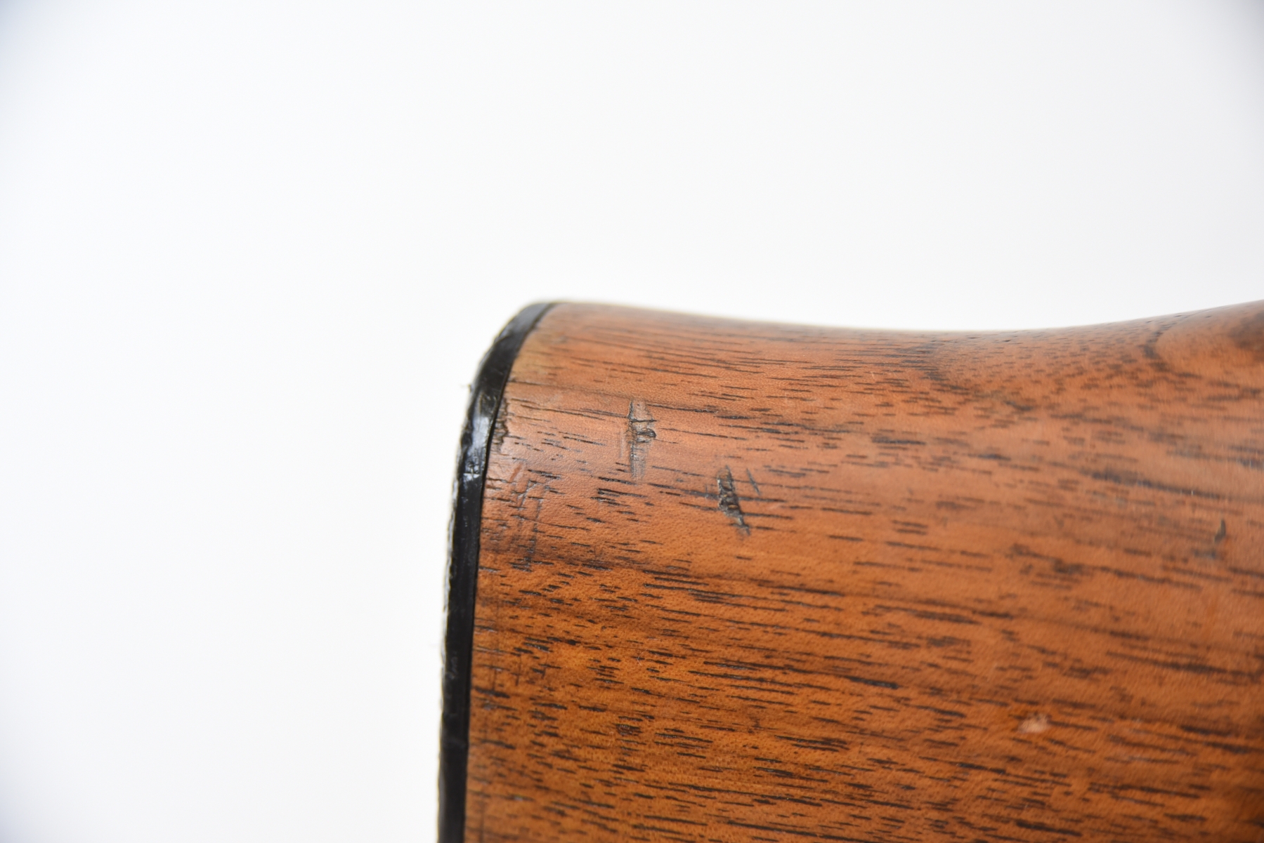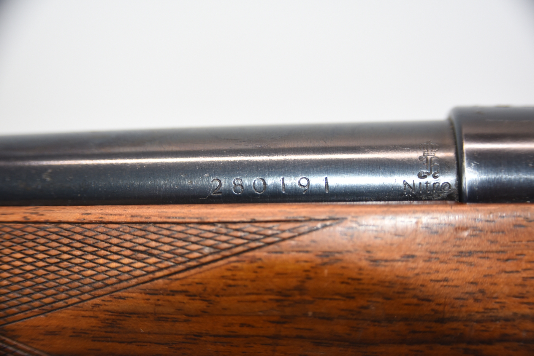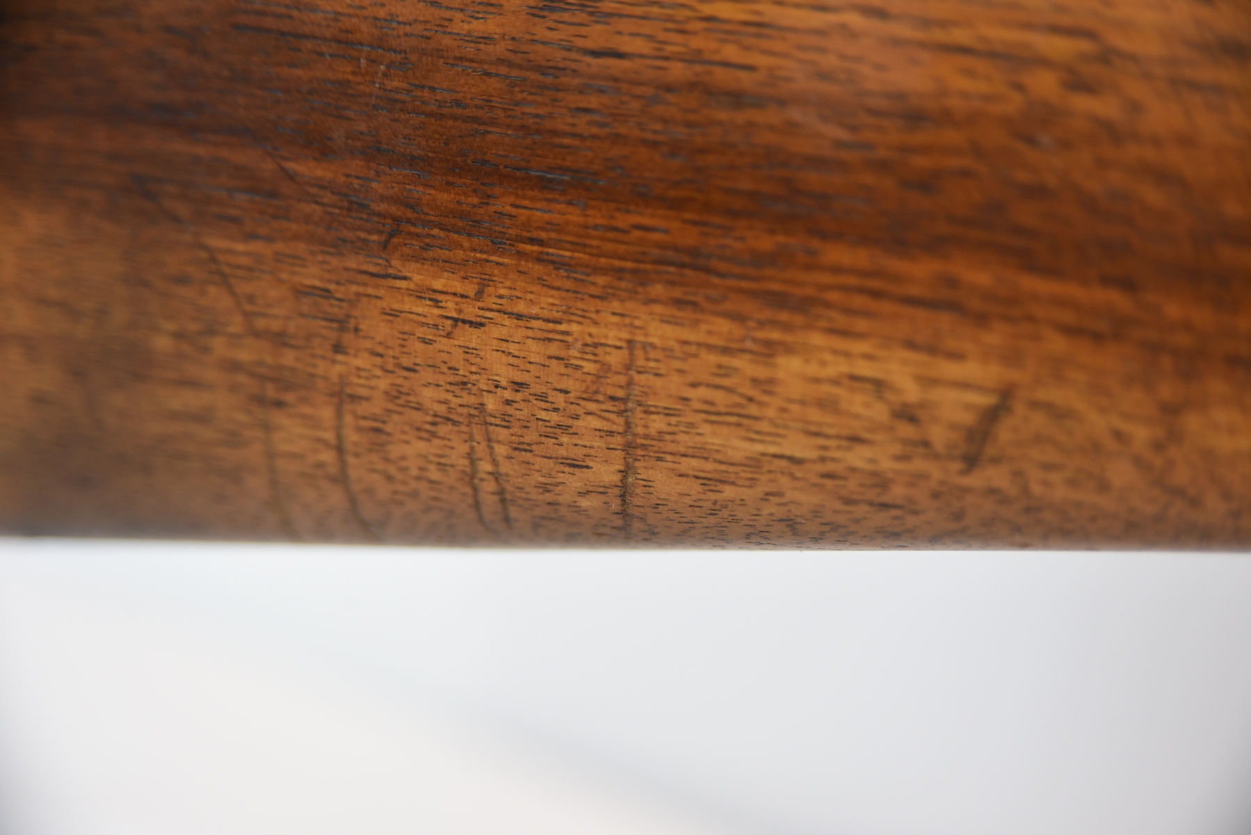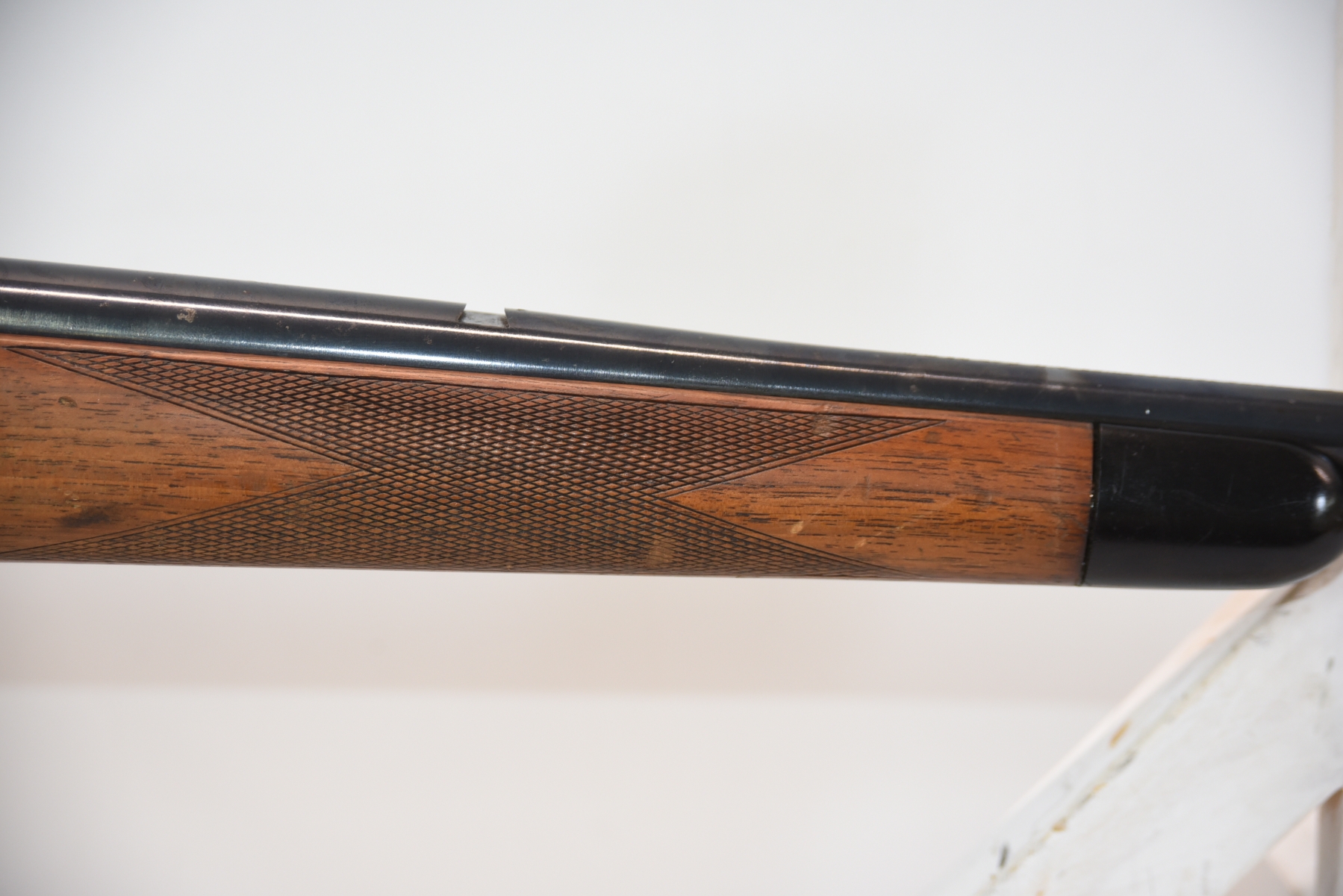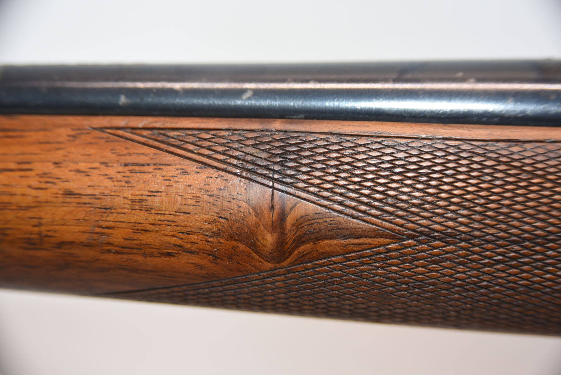 Wood stock shows sling mount holes, there are small chips in the upper tang, there are some scratches, missing the white gasket in the forearm, scuffs and dents; condition is good.