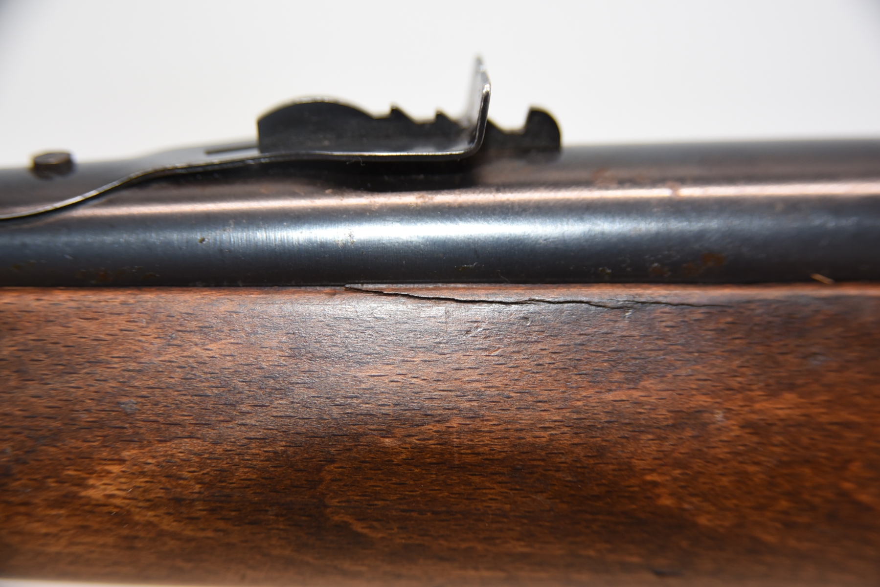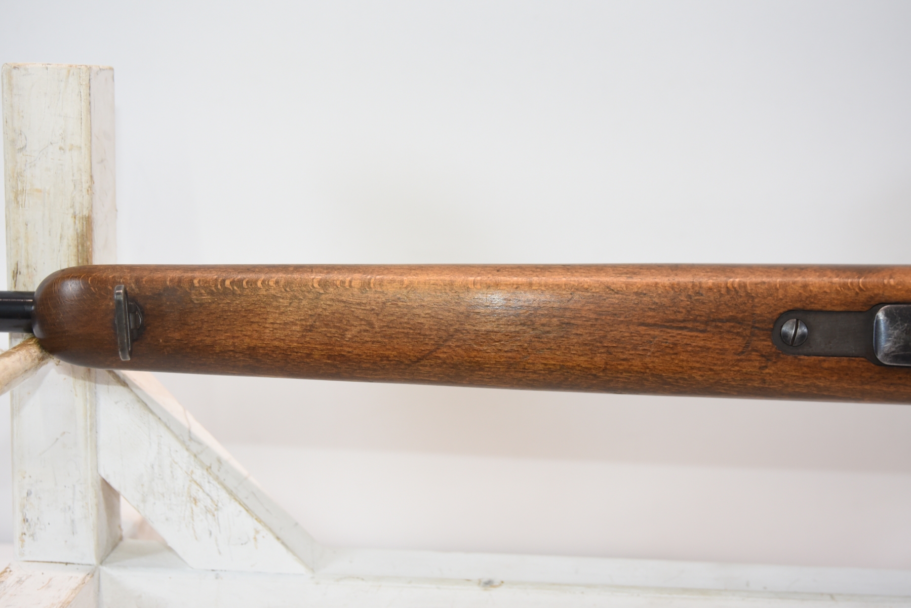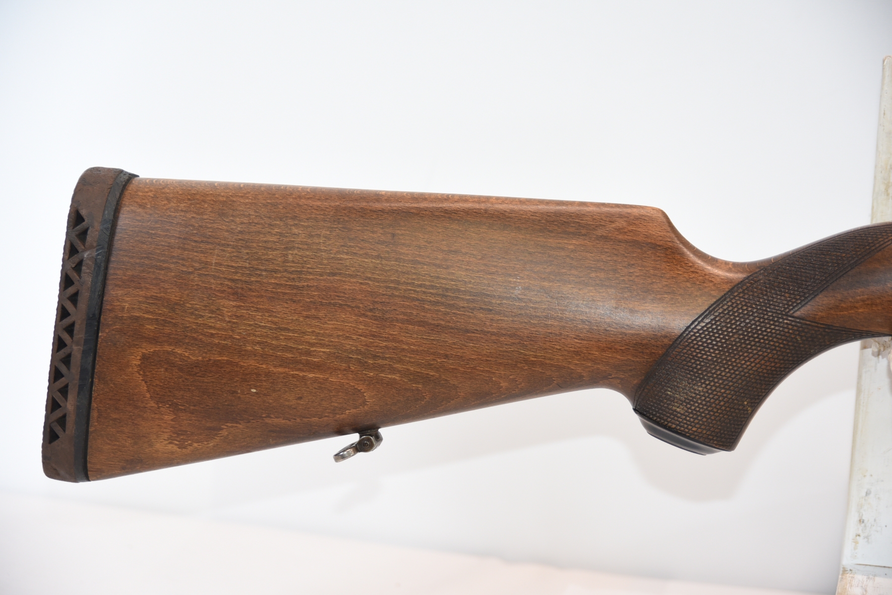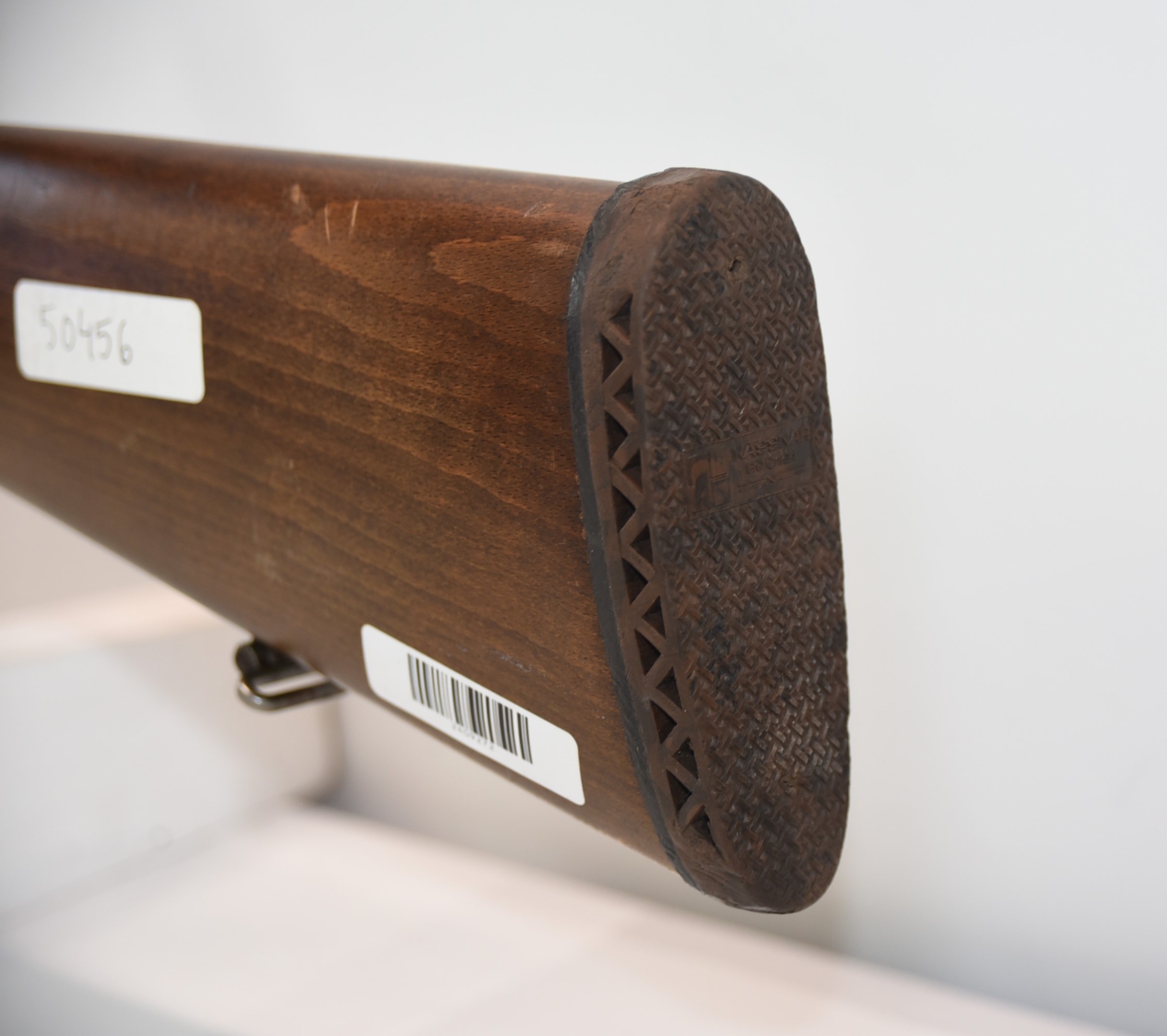 Wood stock shows some scratches, scuffs, butt pad is aftermarket; condition is fair.