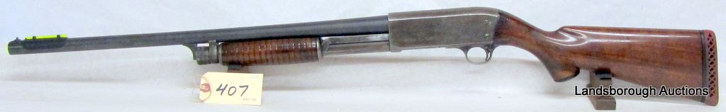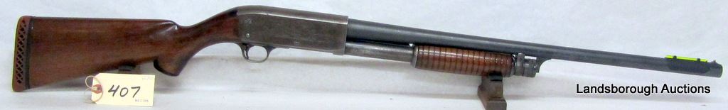 NON-RESTRICTED, PUMP ACTION, 12GA X 2 3/4", 23" BARREL WITH REMOVABLE CHOKE, SN 14946. WOOD REPAIRED BEHIND RECEIVER, BLUING BROWN ON RECEIVER, GREY ON BARREL, BORE GOOD.