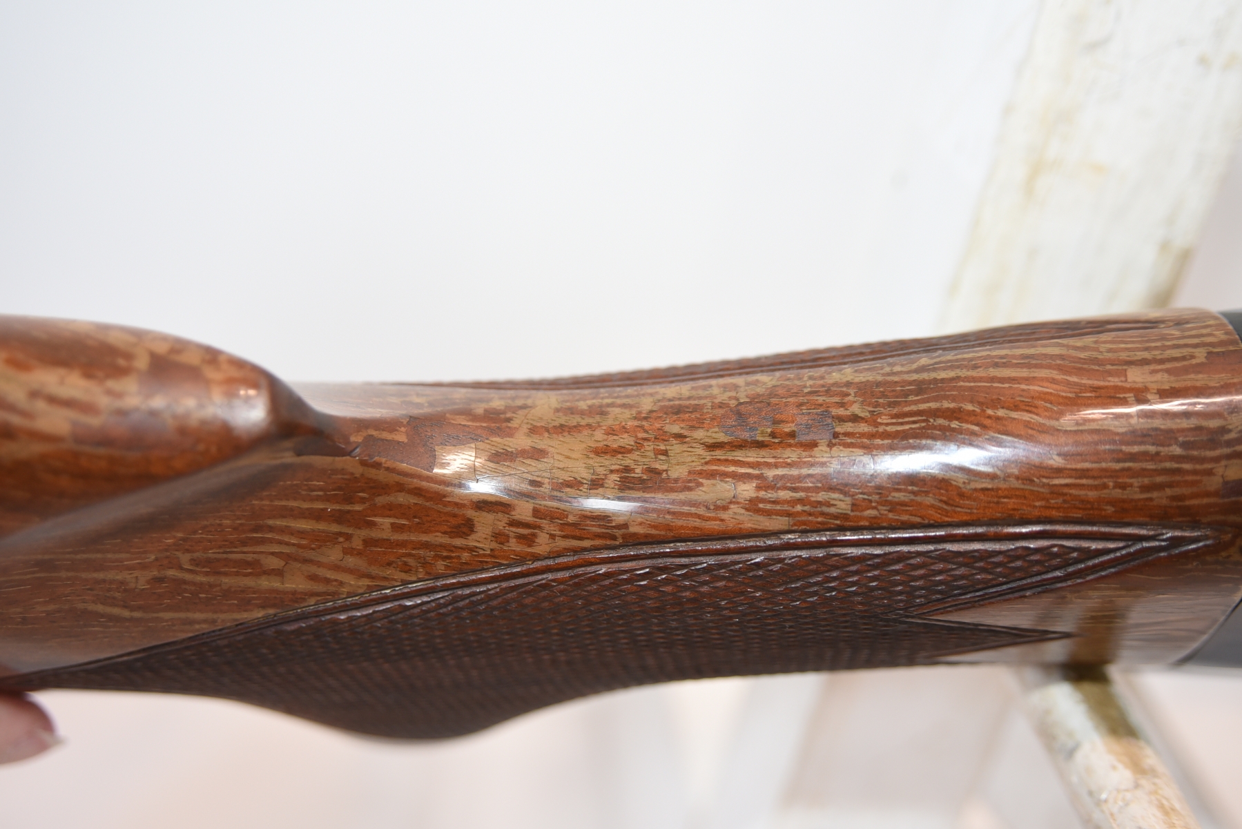 Wood stock shows a chip in the forearm, some light scratches and scuffs, there is varnish cracking in most areas; condition is very good.