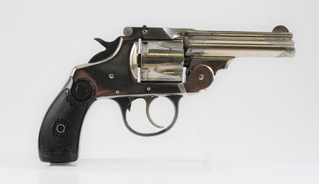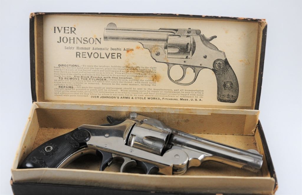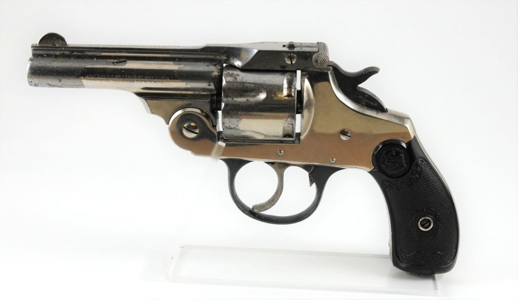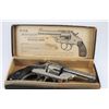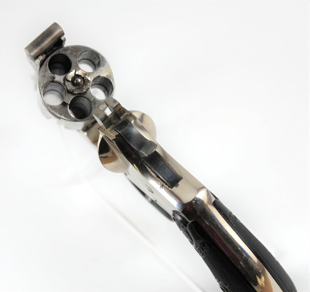 Prohibited, revolver, 38 S&W, 83mm barrel, SN 4921. Grips have some scratches, nickel plating pitted and flaking off, bore pitted. Comes with original box.