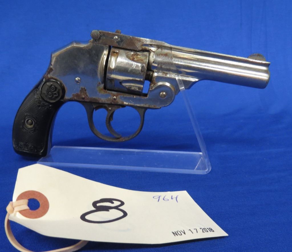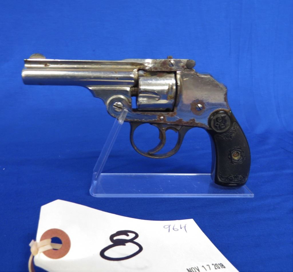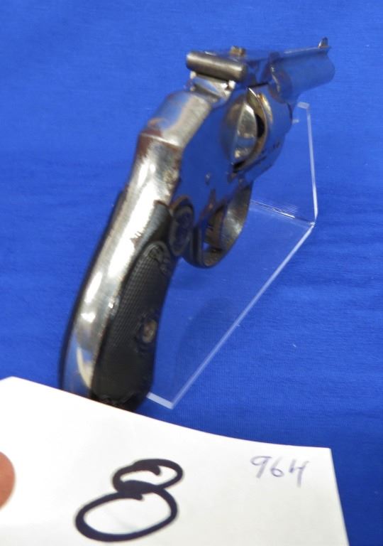 Prohibited, revolver, 32 S&W, 76mm barrel, SN H49640. Grips good, nickel plating pitted and flaking off, bore pitted.