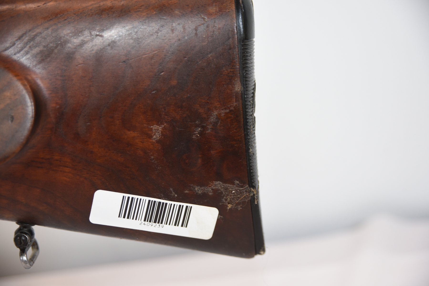 Wood stock shows scratches, scuffs, there are few small dents, fine cracks on either side of the grip area by receiver; condition is good.