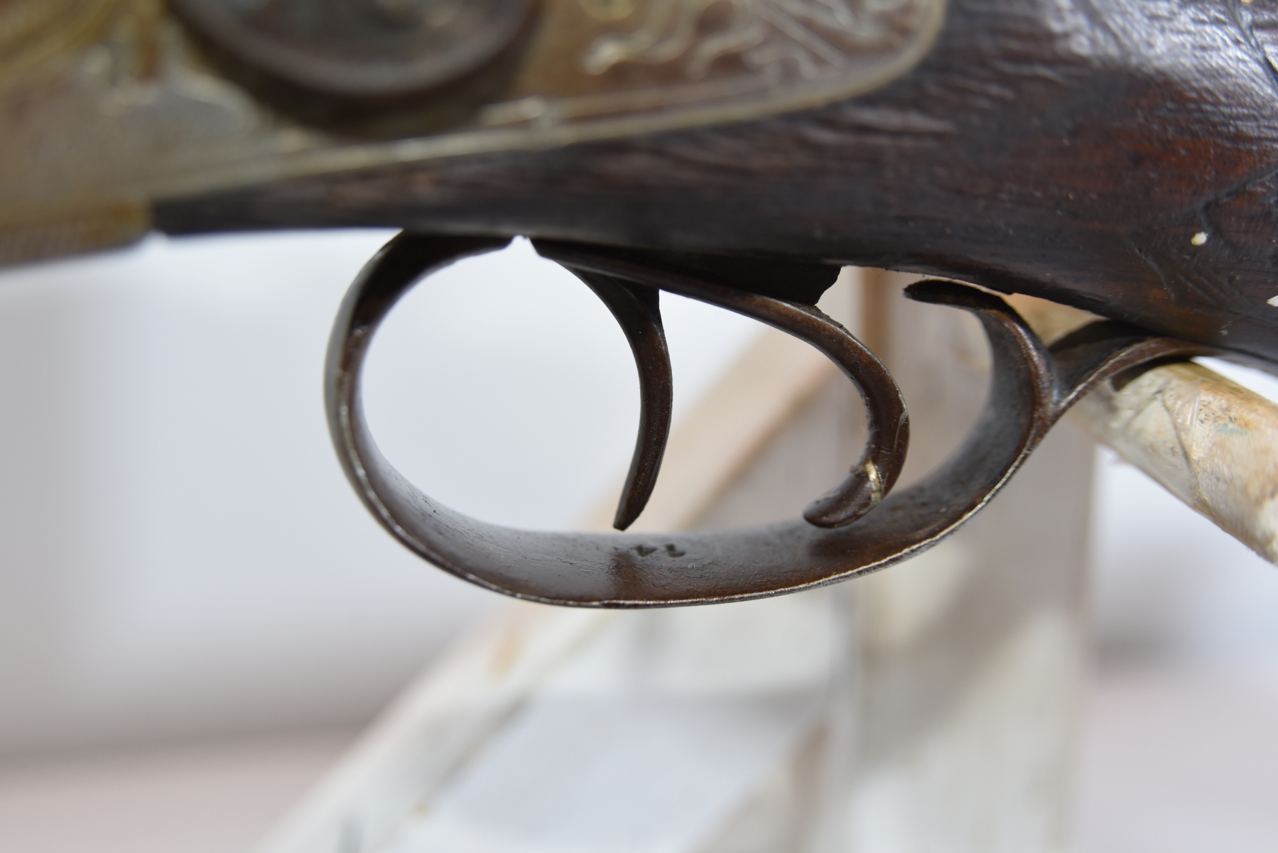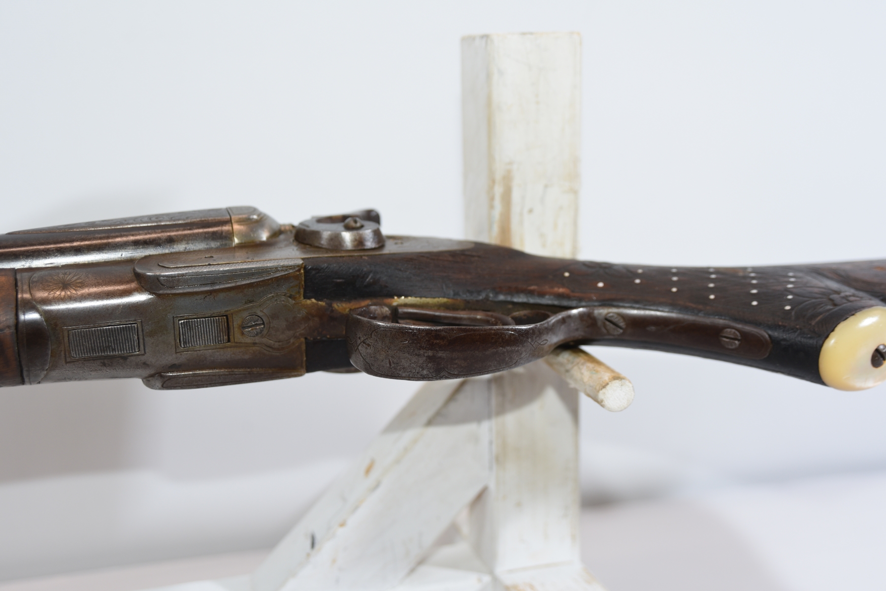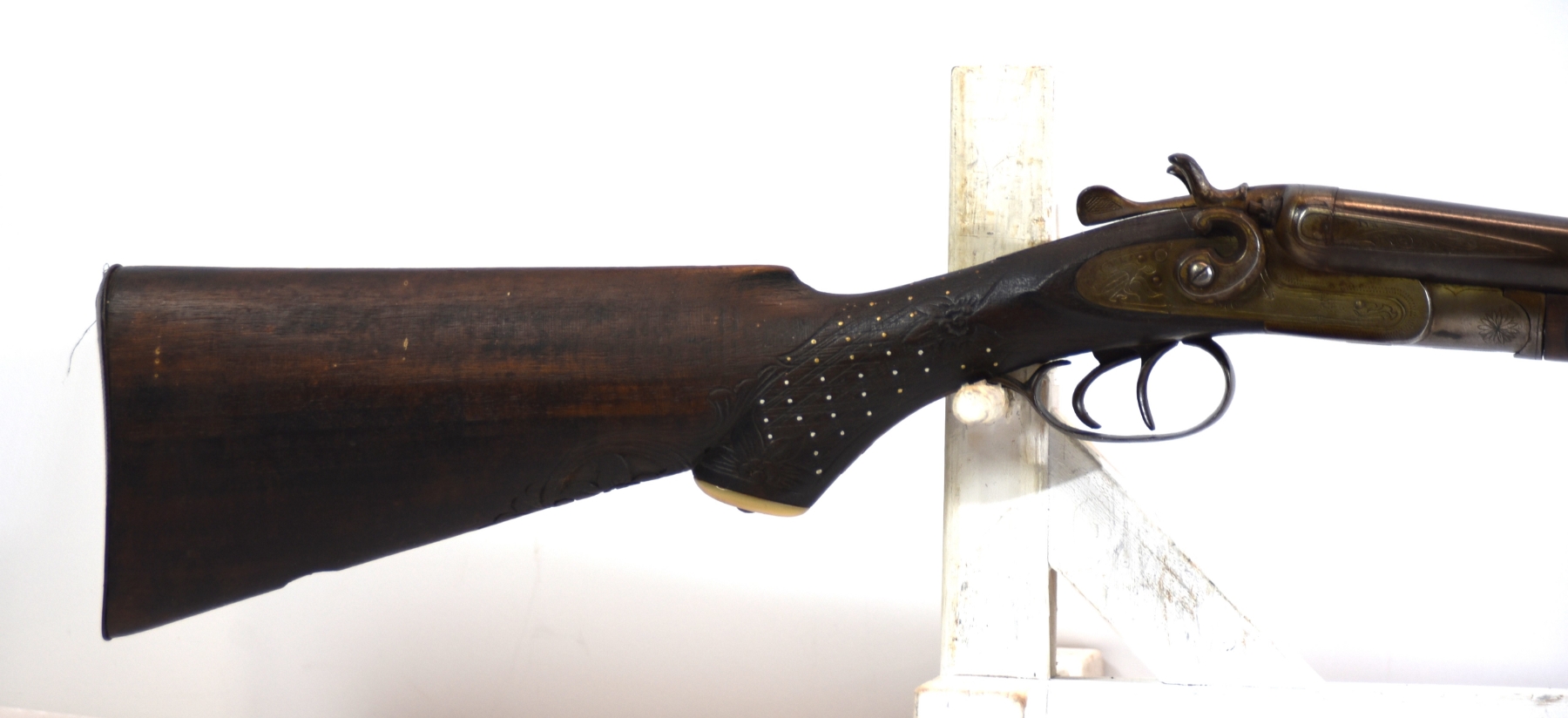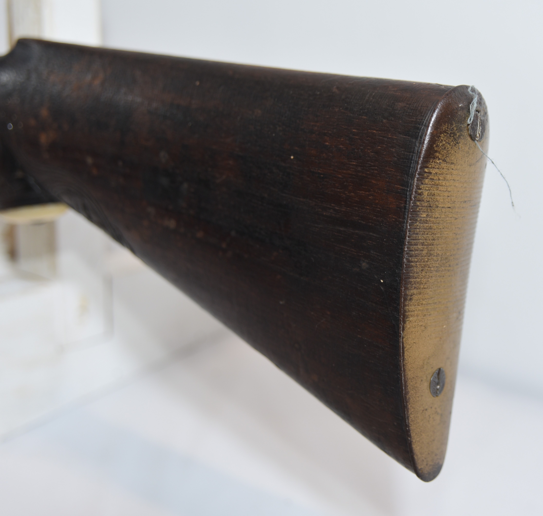 Wood stock shows scratches, scuffs, dents, missing something at the bottom of the stock, the engravings are in good condition for age; condition is fair.