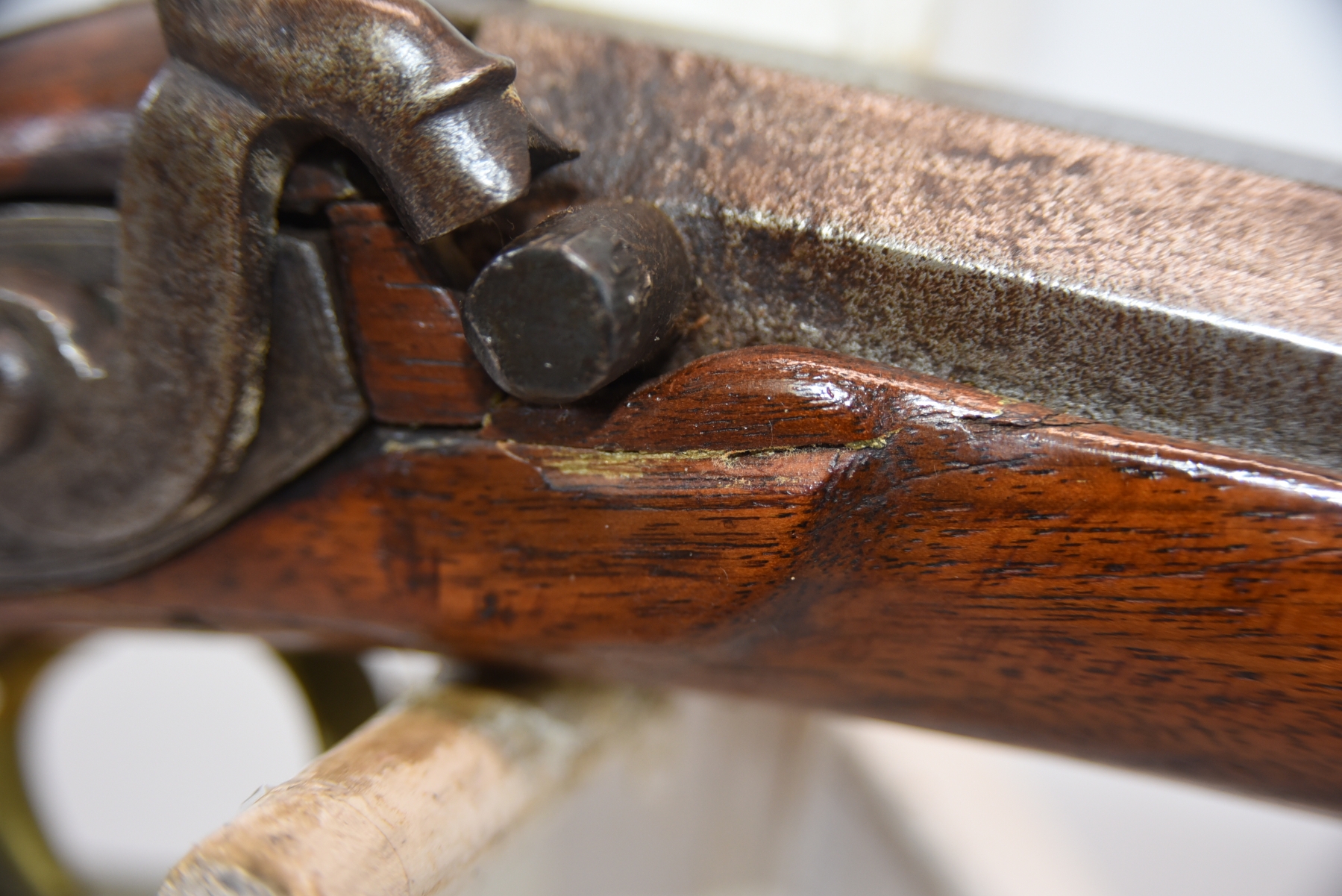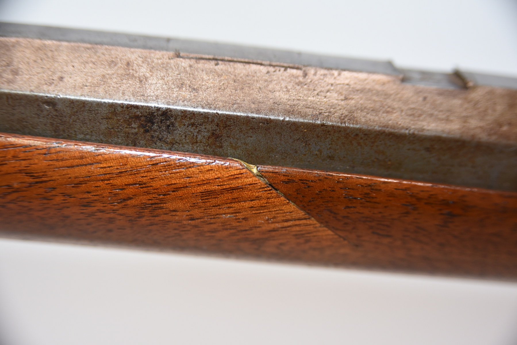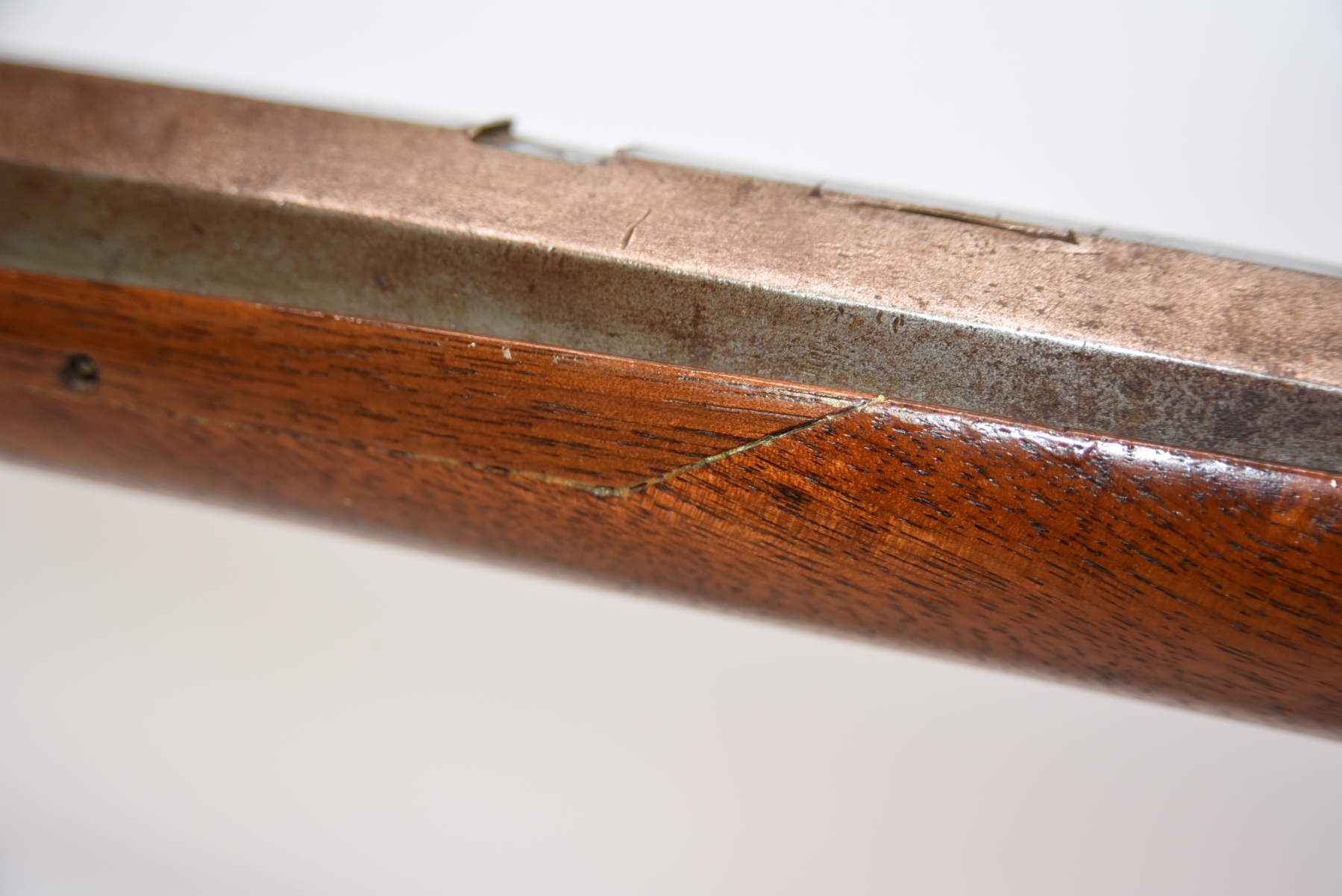 Wood stock shows lots of cracking, chips, scratches, scuffs and dents; condition is fair for age.