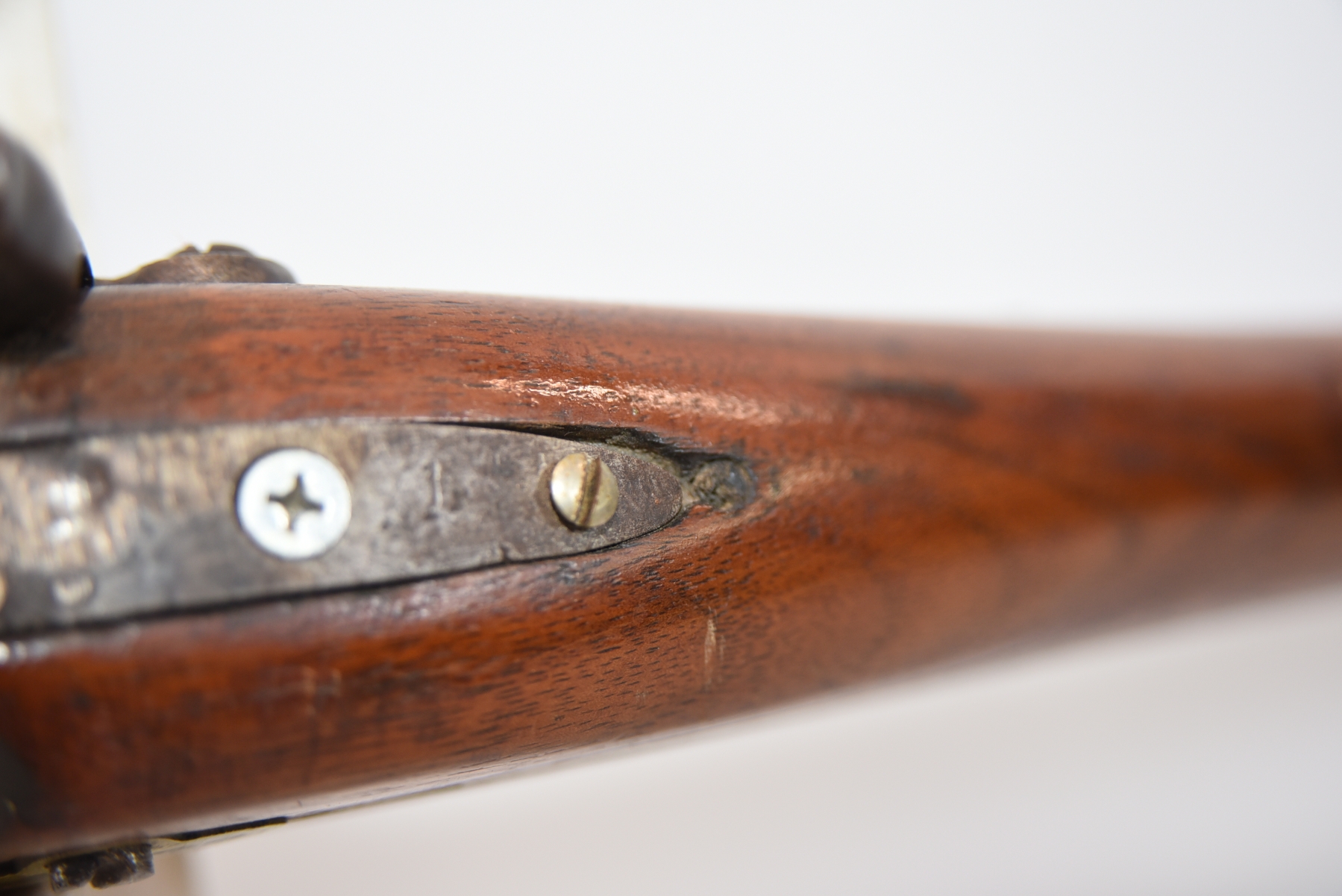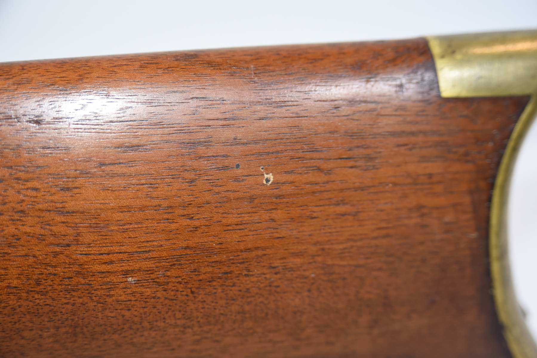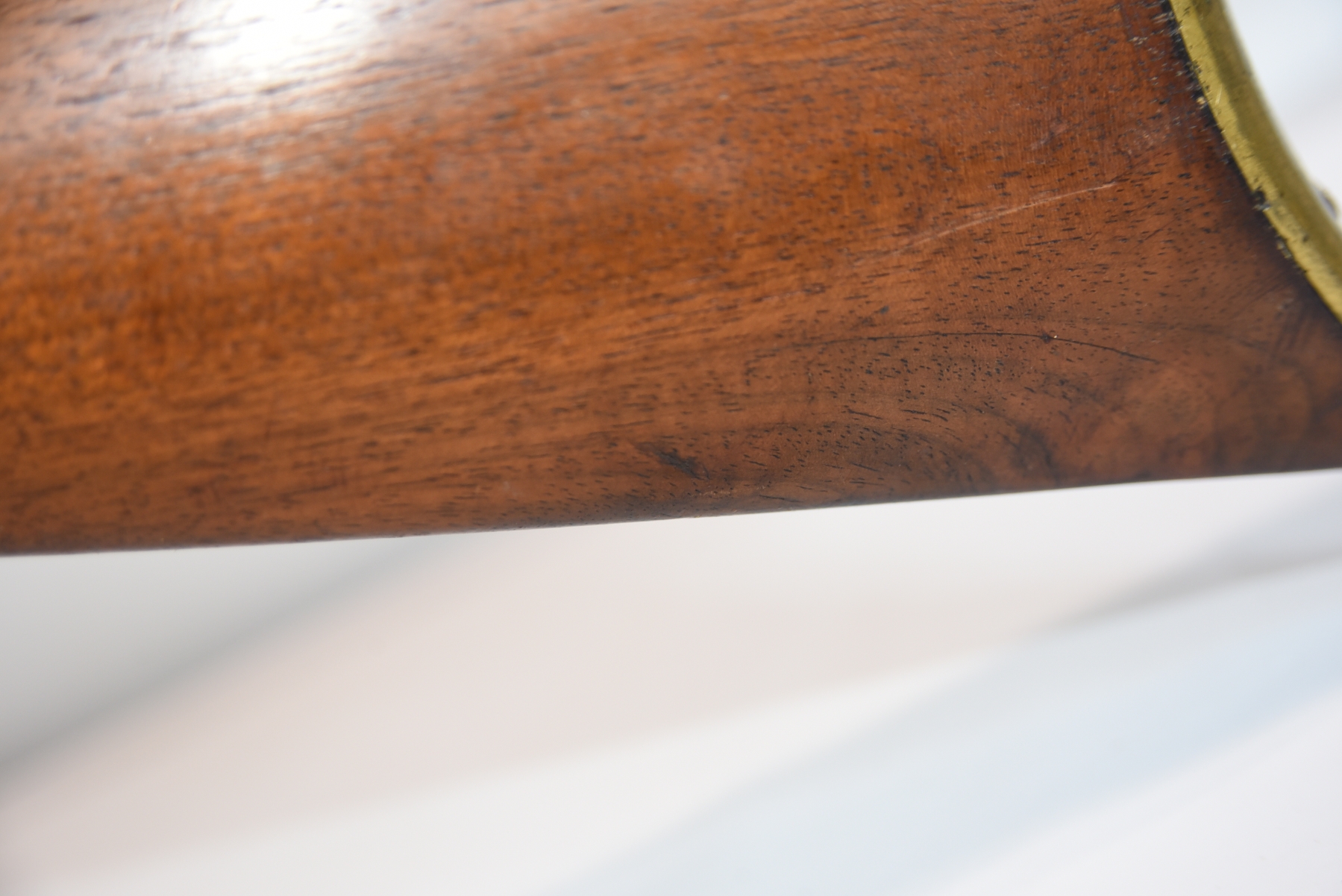 Wood stock shows lots of cracking, chips, scratches, scuffs and dents; condition is fair for age.