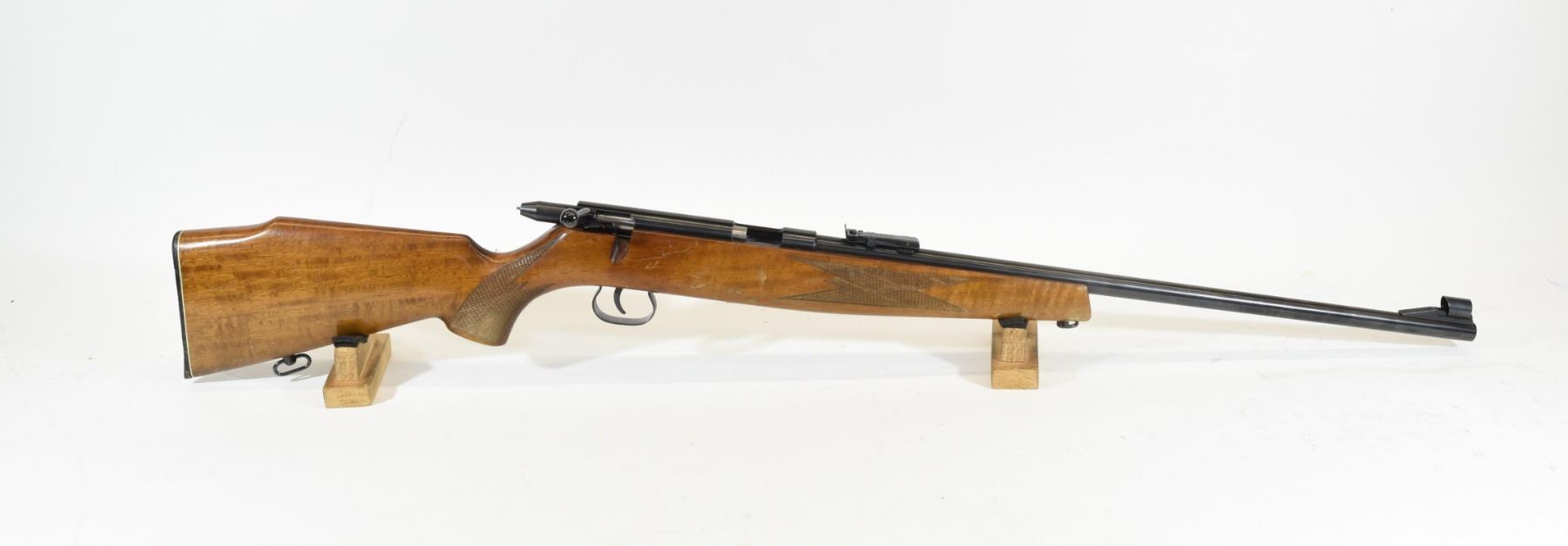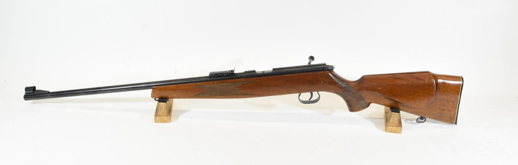 Non-restricted, bolt action, 22 Magnum, 22 1/2" barrel. SN 510569. Wood has numerous marks and scratches, bluing has a couple marks, bore excellent. Cracked butt plate.