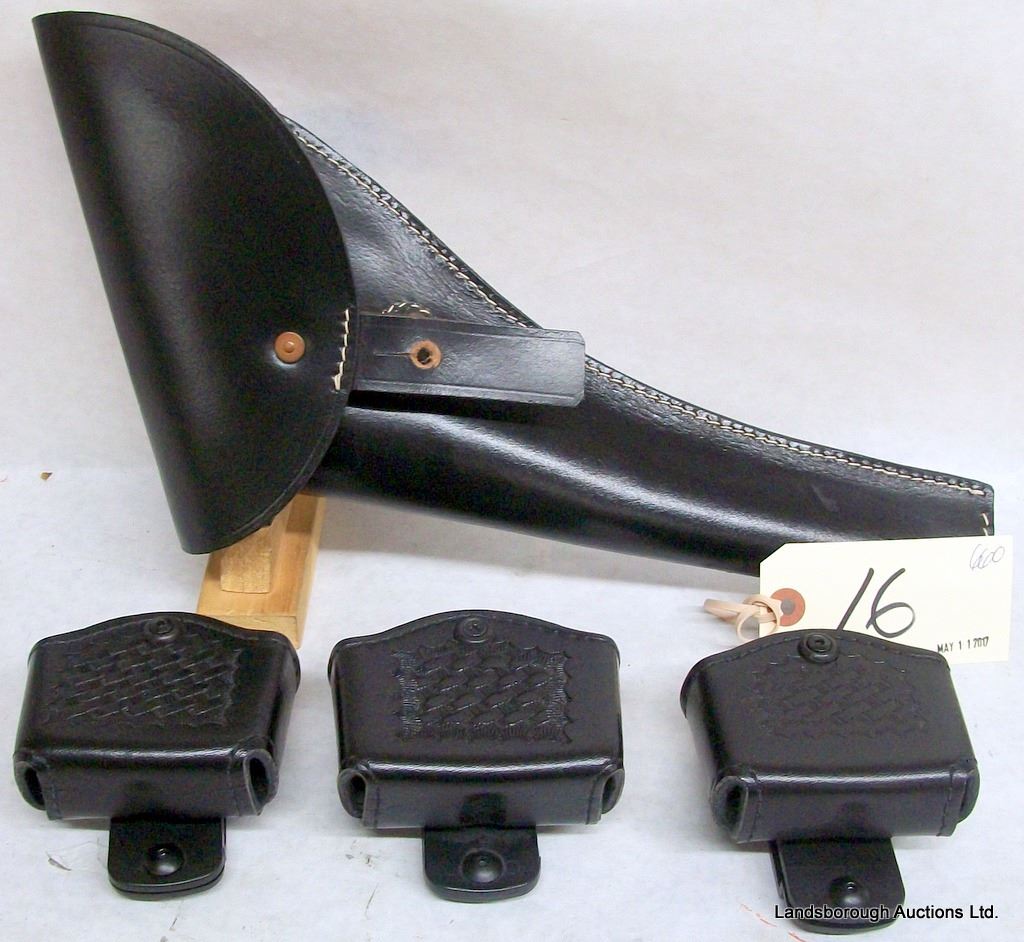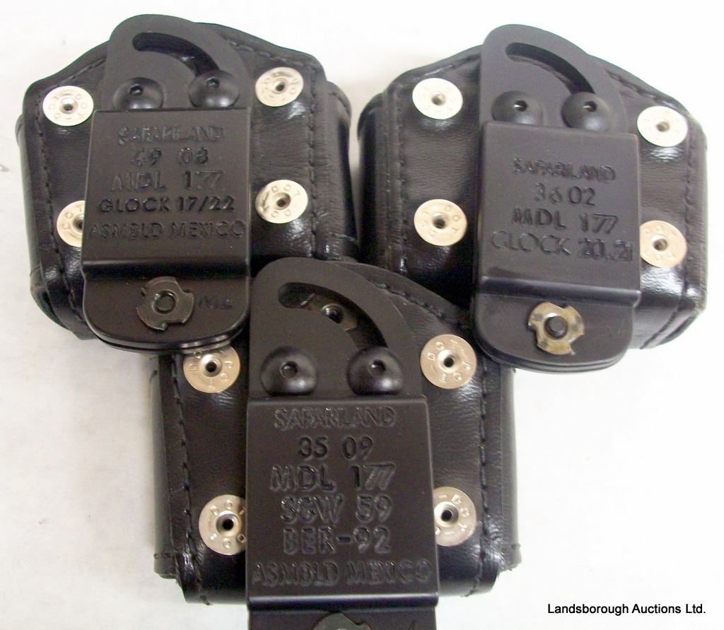 BLACK HOLSTER AND THREE DOUBLE MAG POUCHES MADE BY SAFARILAND.