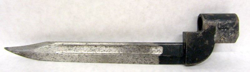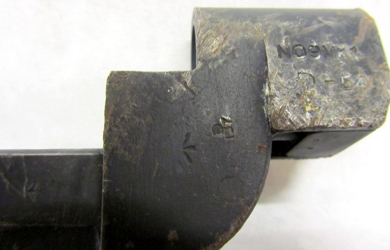 BRITISH BROAD ARROW AND PROOF MARKINGS. 1954 DATED. HAS DENTS AND WEAR MARKS. BLADE APPEARS TO HAVE BEEN SHARPENED.