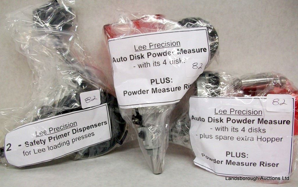 TWO SAFETY PRIMER DISPENSERS, TWO AUTO DISK POWDER MEASURE WITH 4 DISKS AND RISER, ONE EXTRA HOPPER.