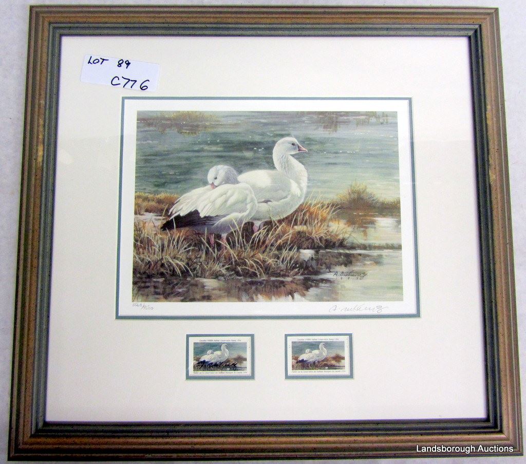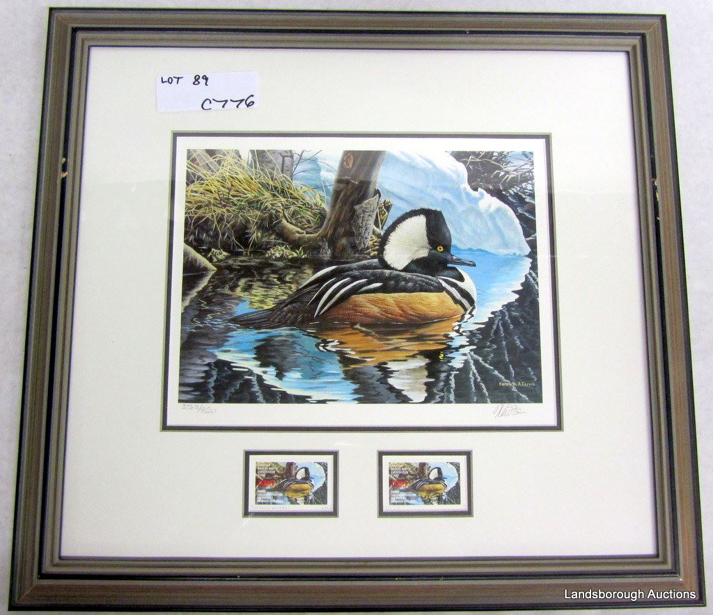 1993 PRINT BY KENNETH A. FERRIS TITLED SPRING: HOODED MEGANSER. THE OTHER IS 1994 SNOW GOOSE PRINT BY A. SAKHAVARZ. BOTH COME WITH MATCHING CONSERVATION STAMPS.