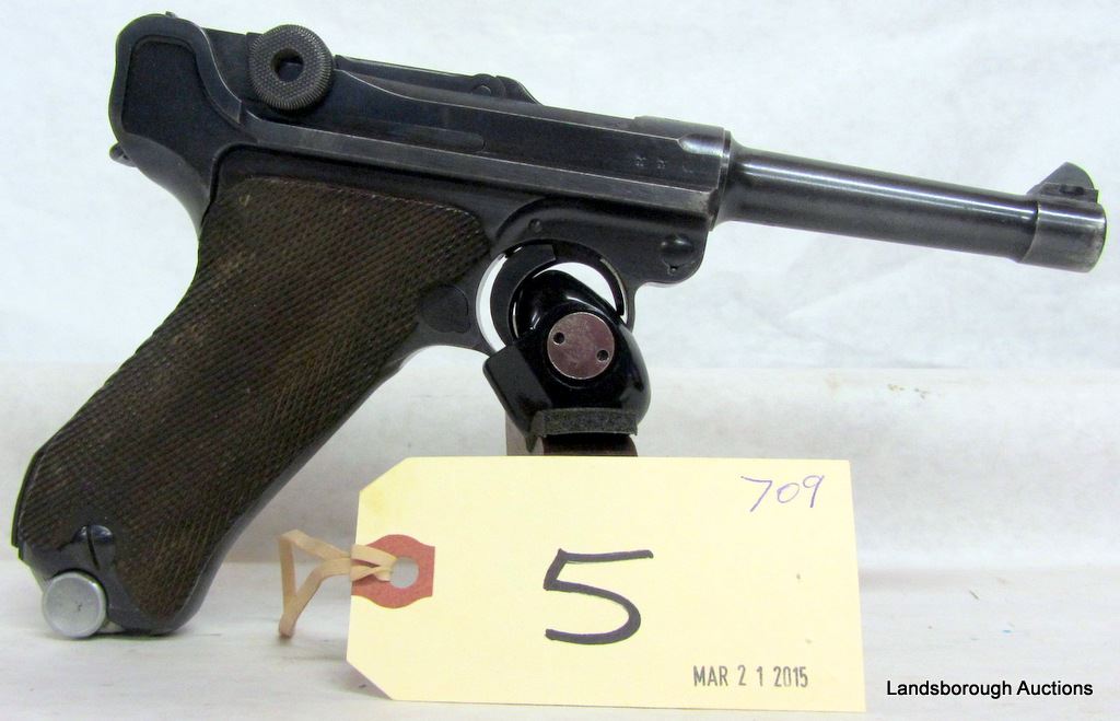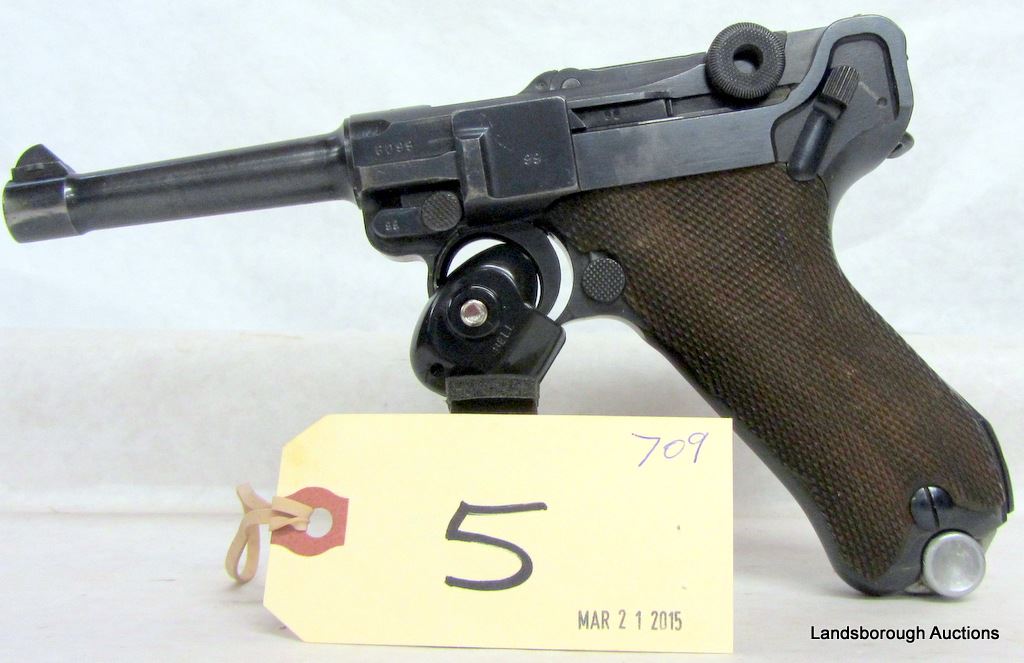 PROHIBITED, SEMI AUTO, 9MM LUGER, 102MM BARREL, SN 6099D. WOOD GRIPS HAVE A COUPLE MARKS, BLUING WORN AT MUZZLE AND A FEW RUST SPOTS, BORE GOOD. SERIAL NUMBERS MATCH EVEN THE MAG.