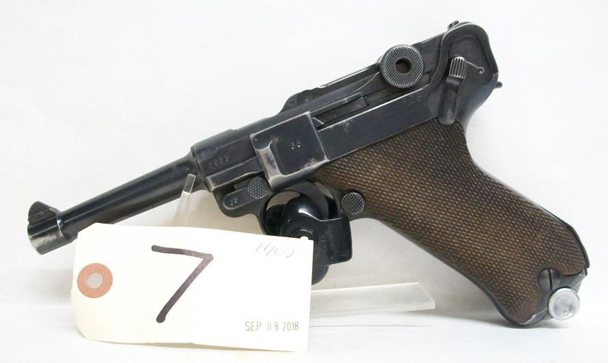 Prohibited, semi auto, 9mm Luger, 101mm barrel, SN. 6963L, grips are showing a little wear at the bottom, bluing has a couple of grey spots, bore is good, magazine is not matching numbers