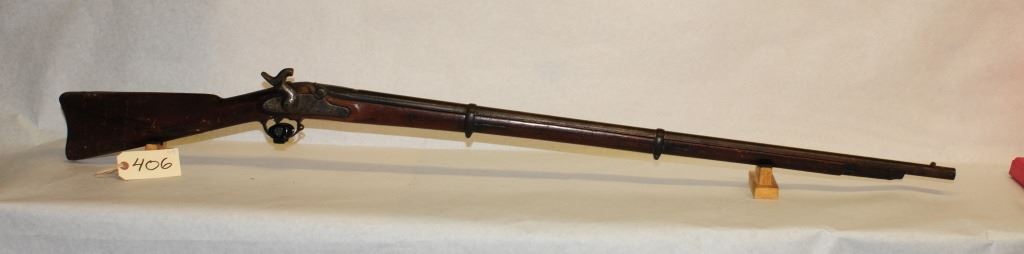 Antique, single shot, 58 Percussion, 38" barrel, SN none. Wood has numerous dents, scratches and marks, bluing is brown, bore pitted. Missing ram rod, upper tang broken. Dated 1863.
