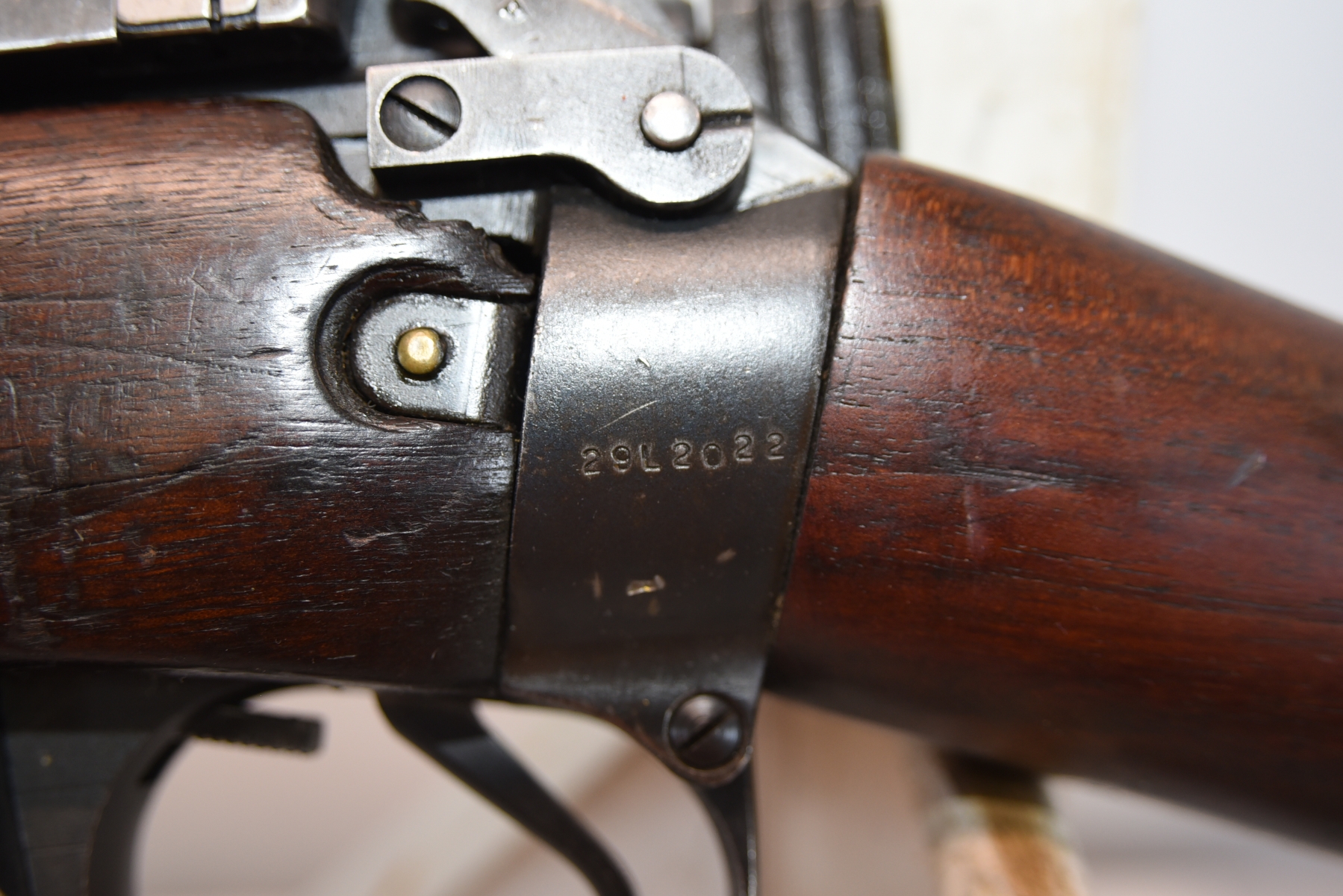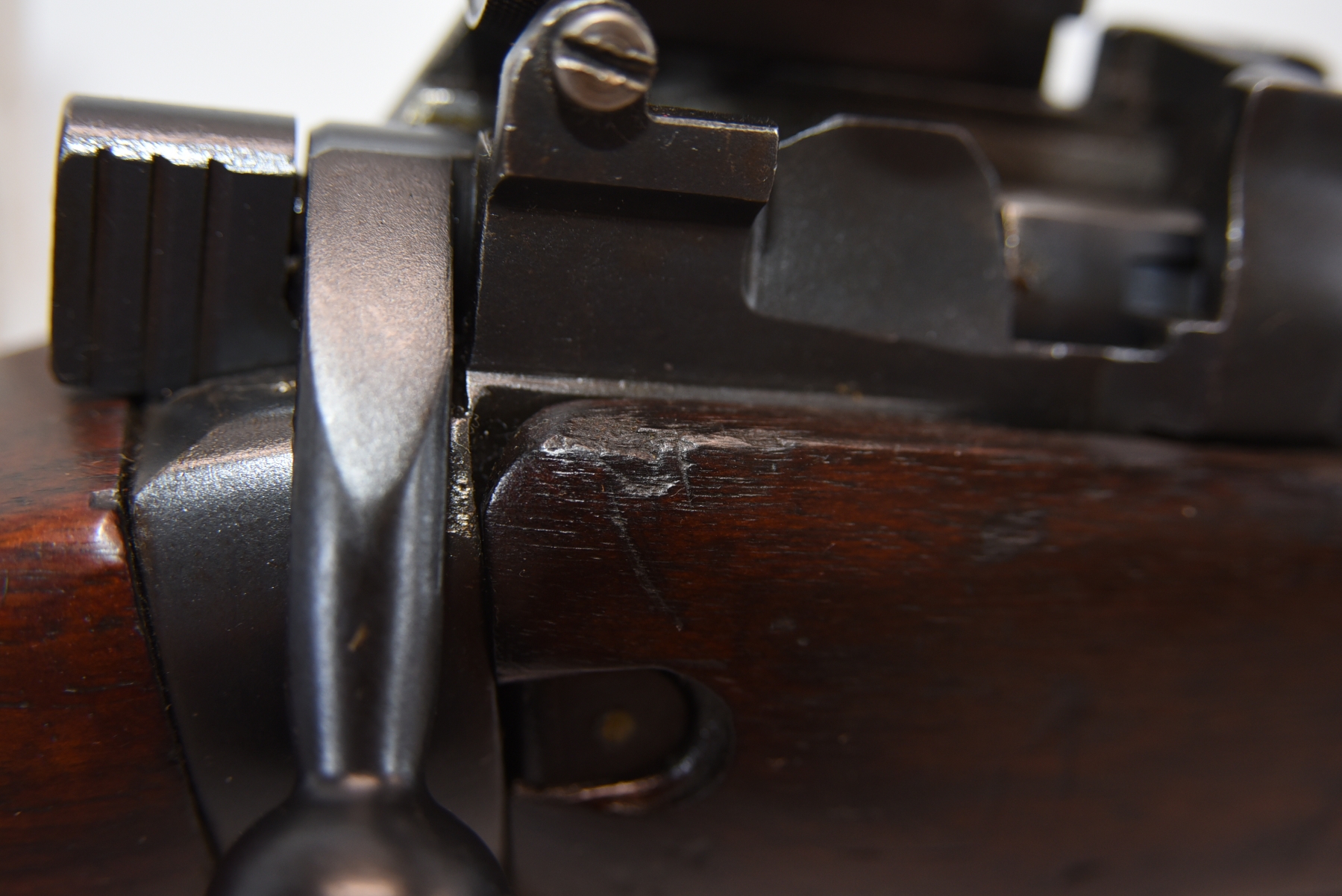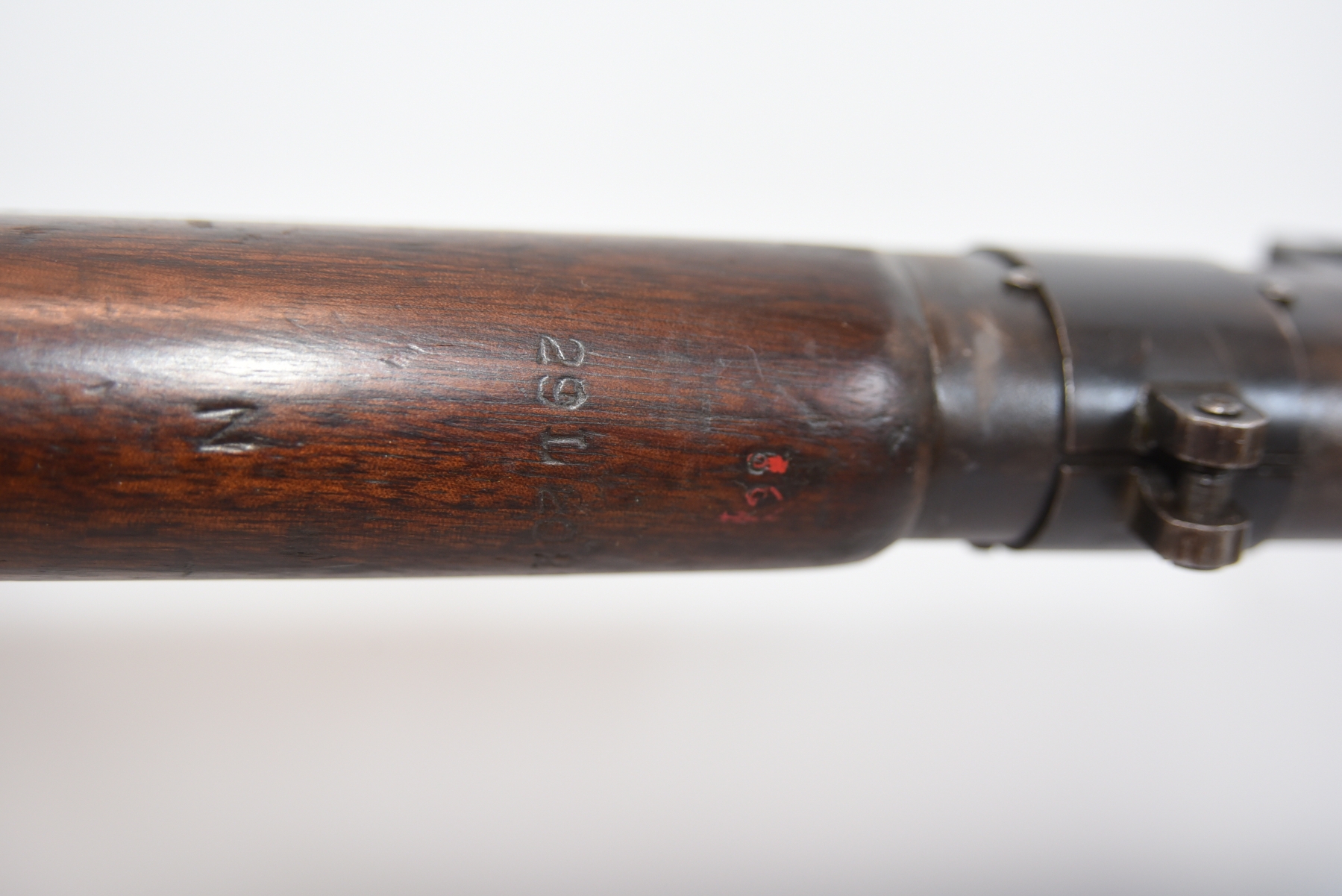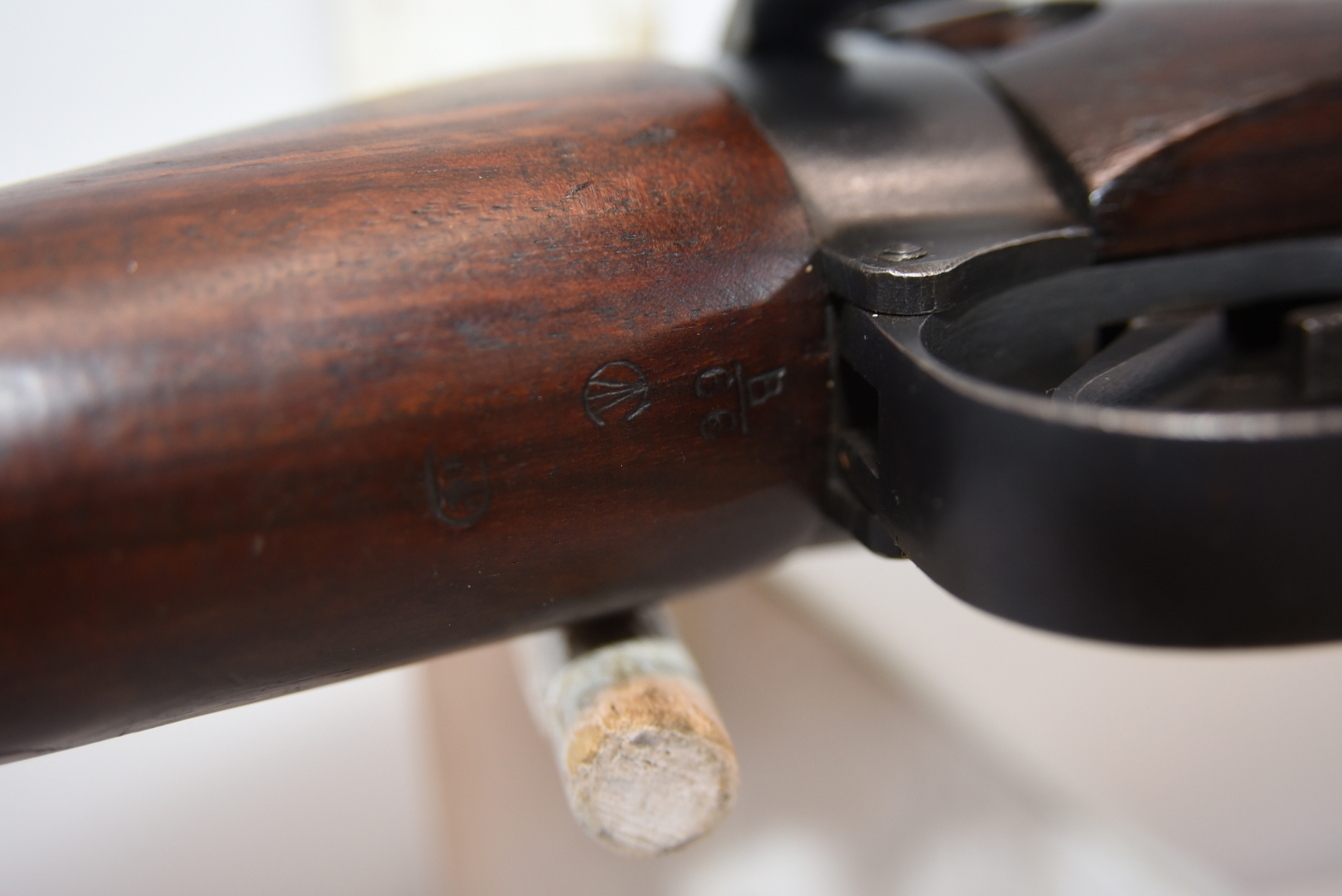 Wood stock shows scratches, scuffs, dents, there are markings on the bolt, butt plate that match the serial number; condition is very good for age.