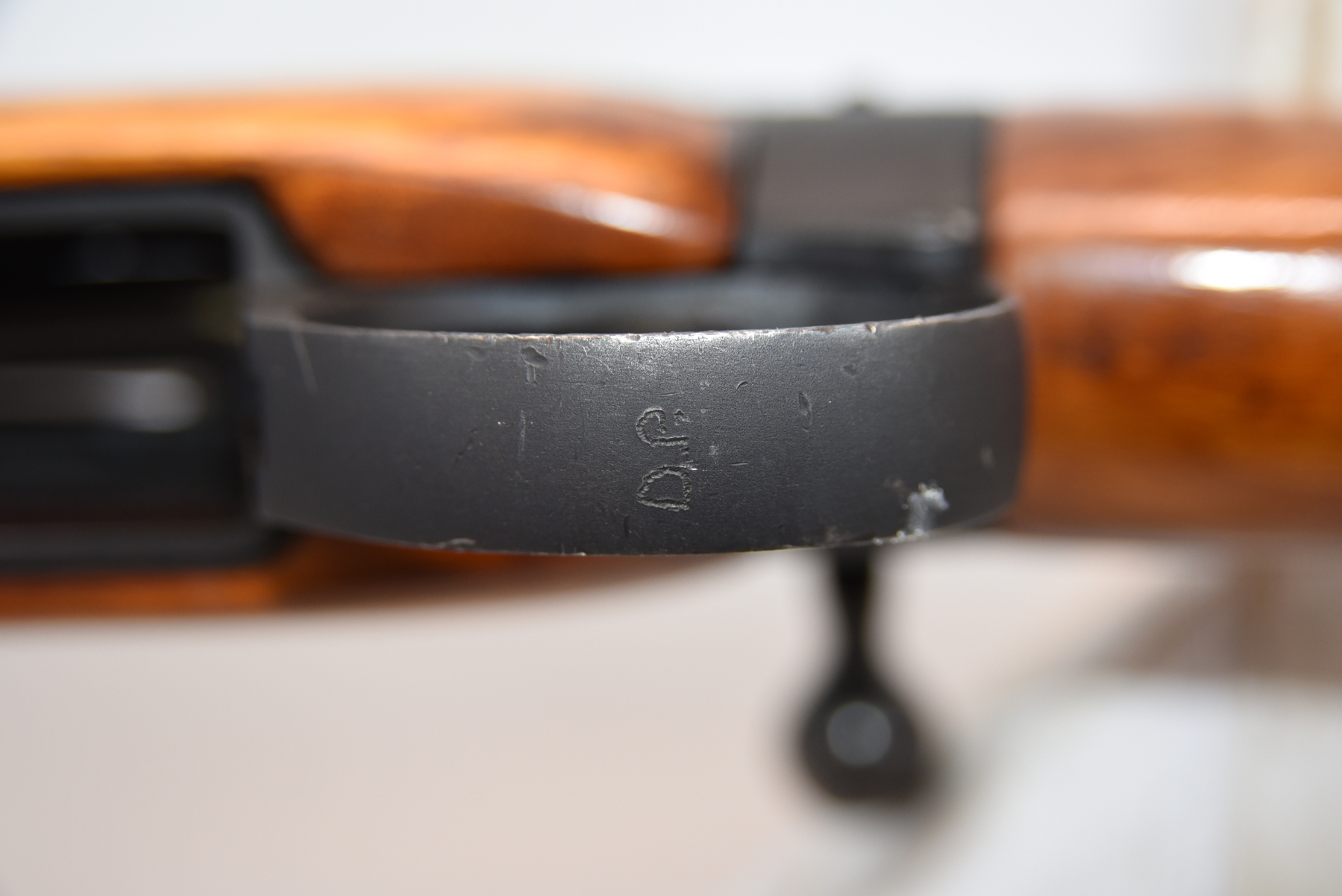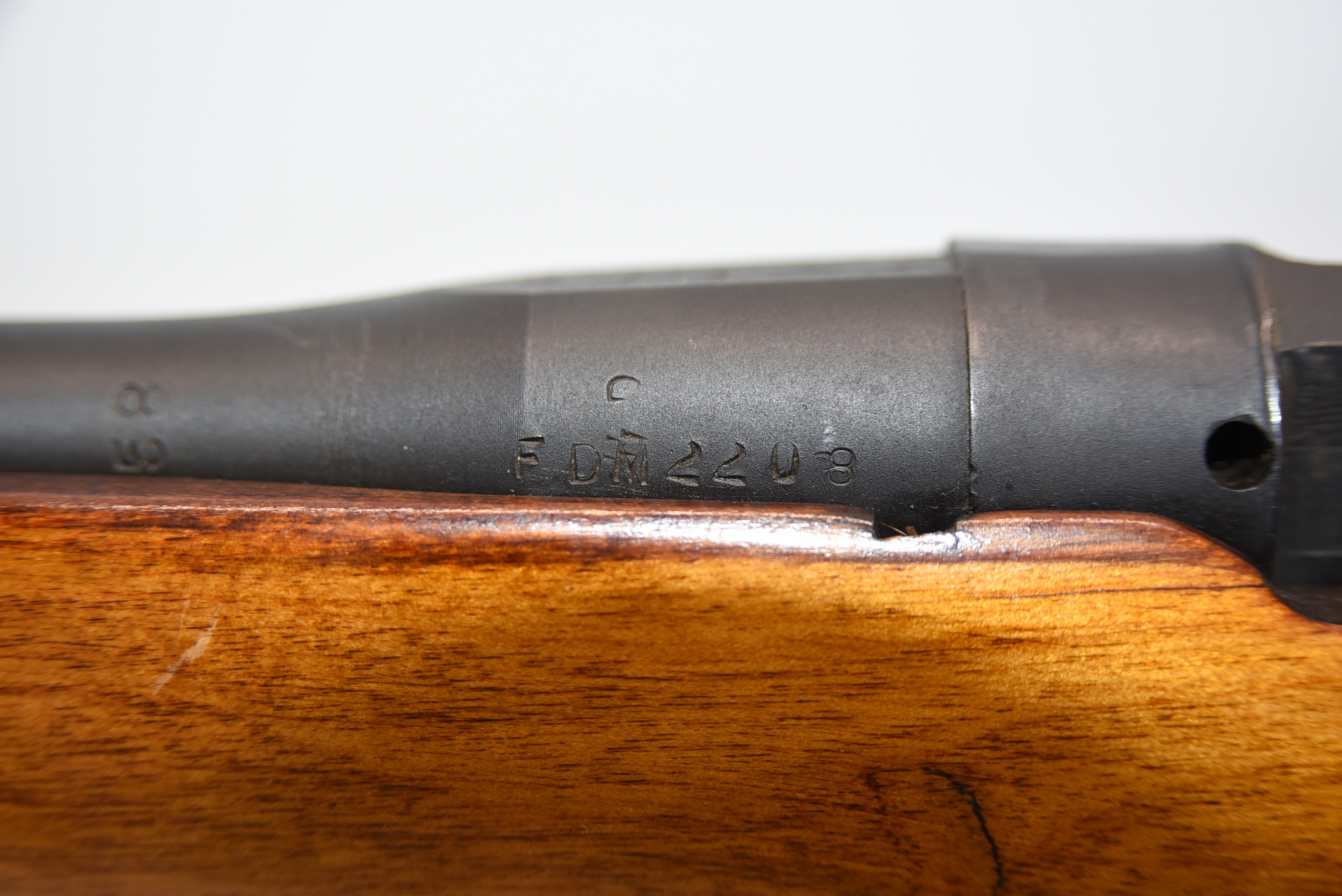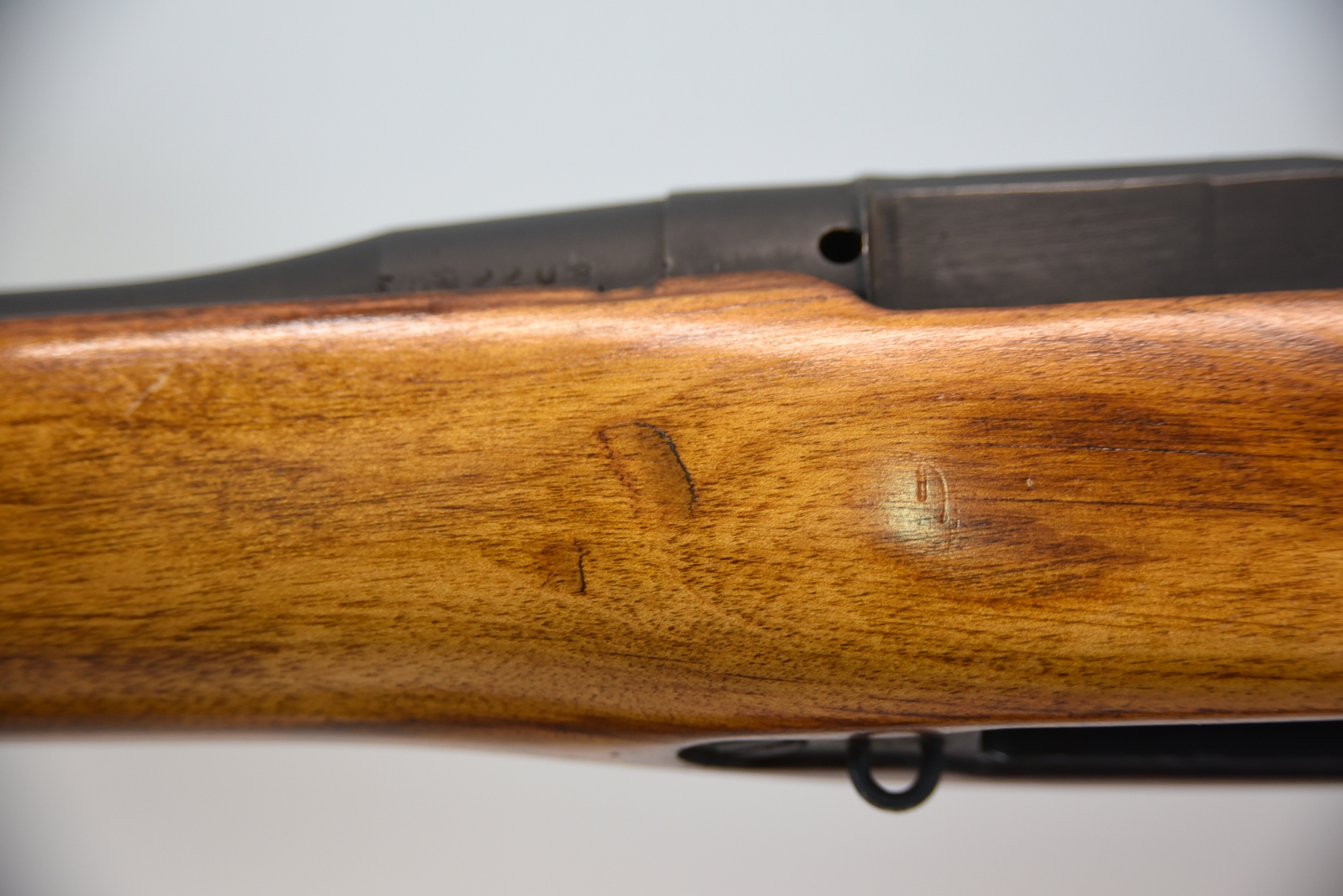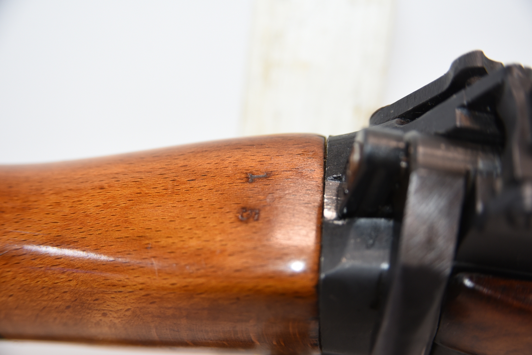 Wood stock shows some light scratches and scuffs, there is a repair on the right side of grip; condition is very good.