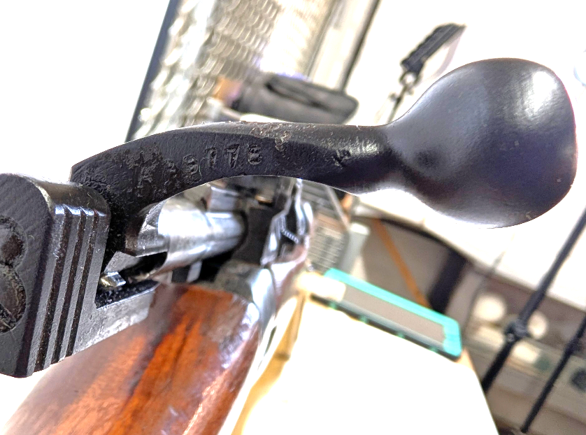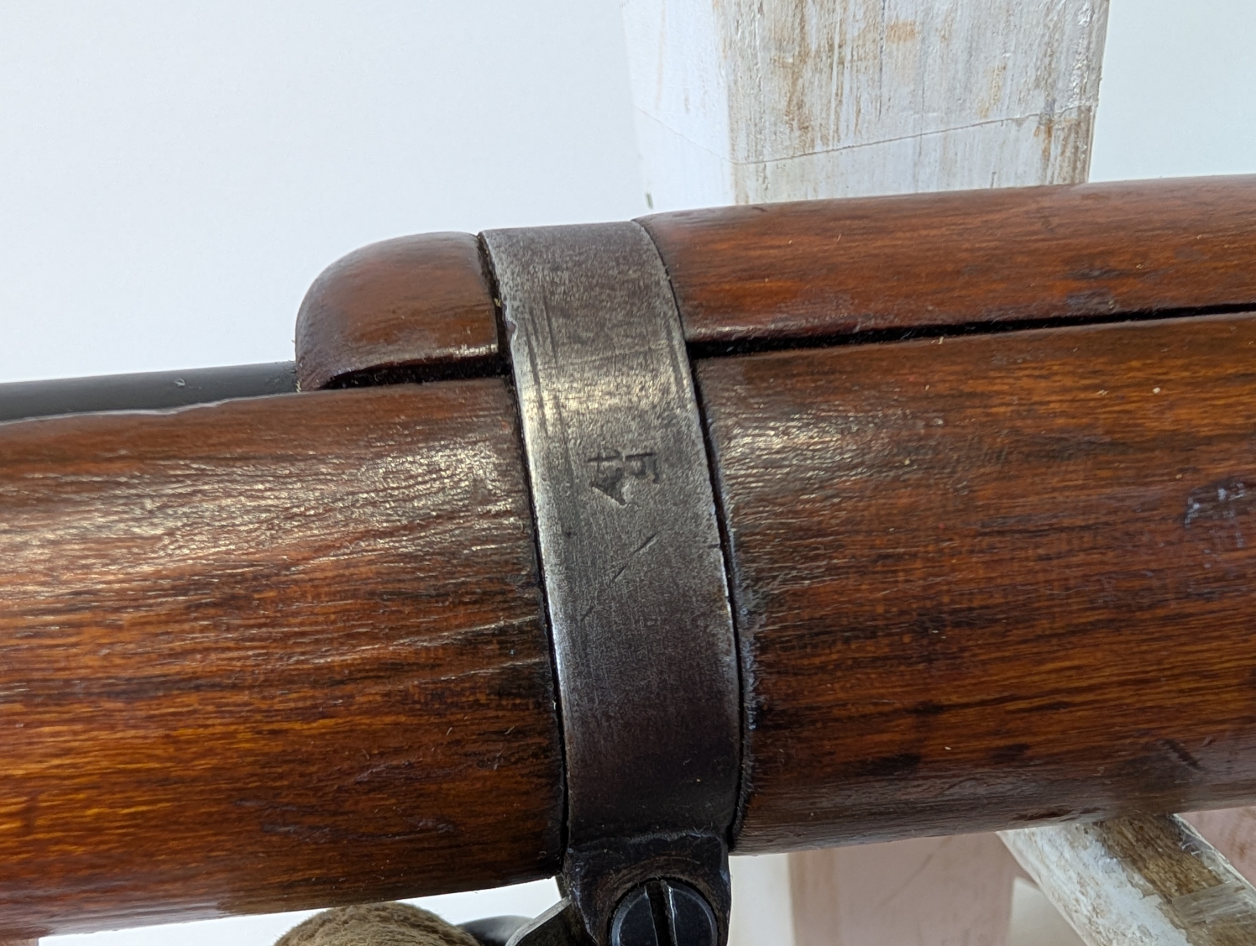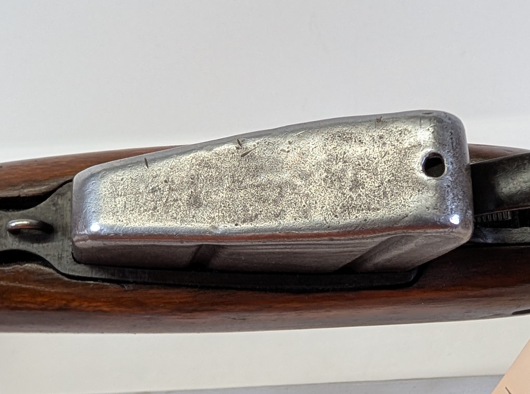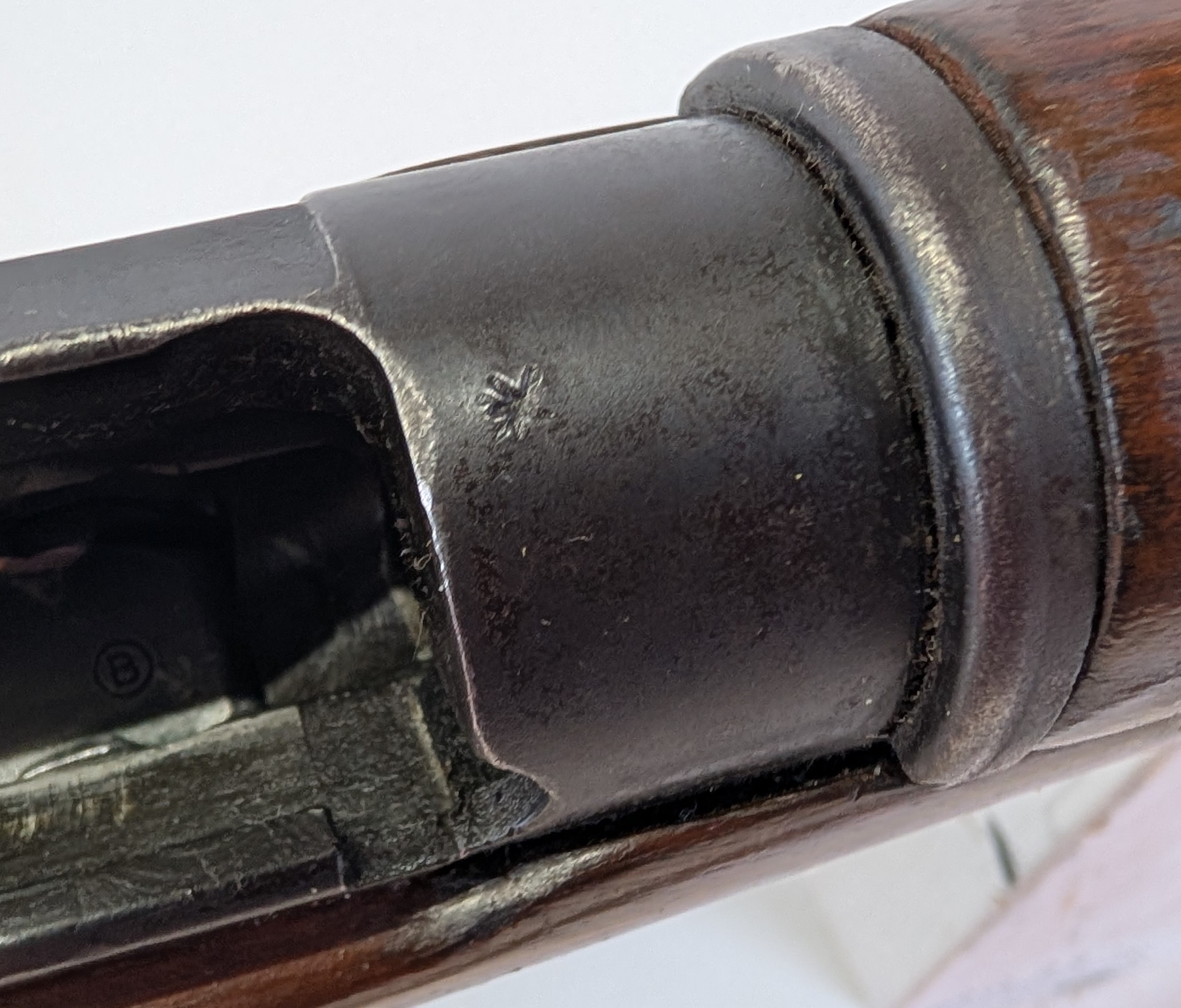 Metal shows some finish wear, serial numbers match on the bolt and receiver grip ring, there is a scuffs and some light scratches and light pits on the bolt handle. There are no other markings on the rifle except a '*' on the barrel ring and a letter 'B' on the rear sight. Condition is good for age.